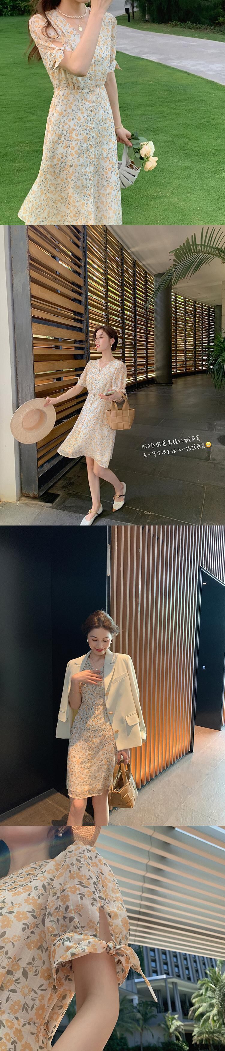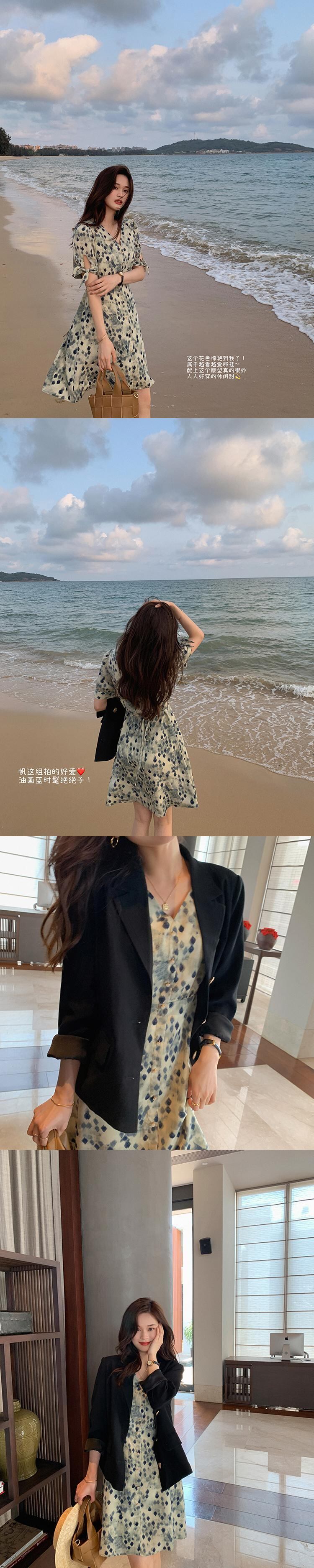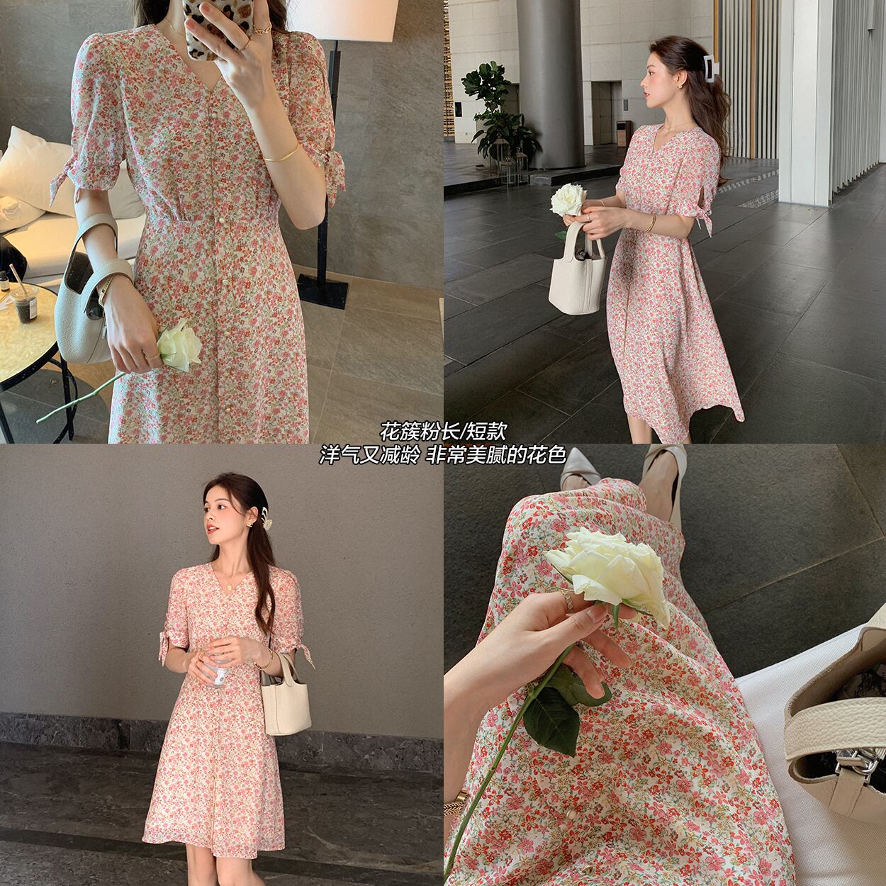 ミスチップマンクVネックフローラルドレス女性の夏のウエストスリミングショートスカート小さな半袖ロングスカート missi71357329503