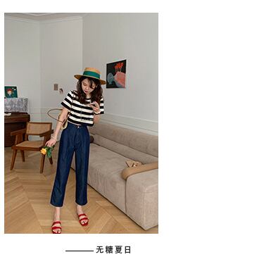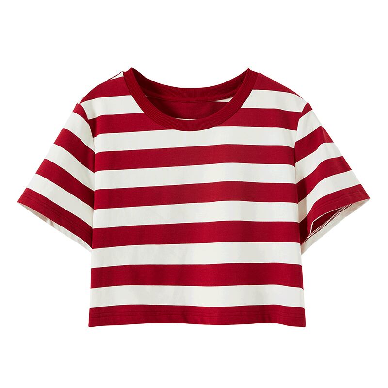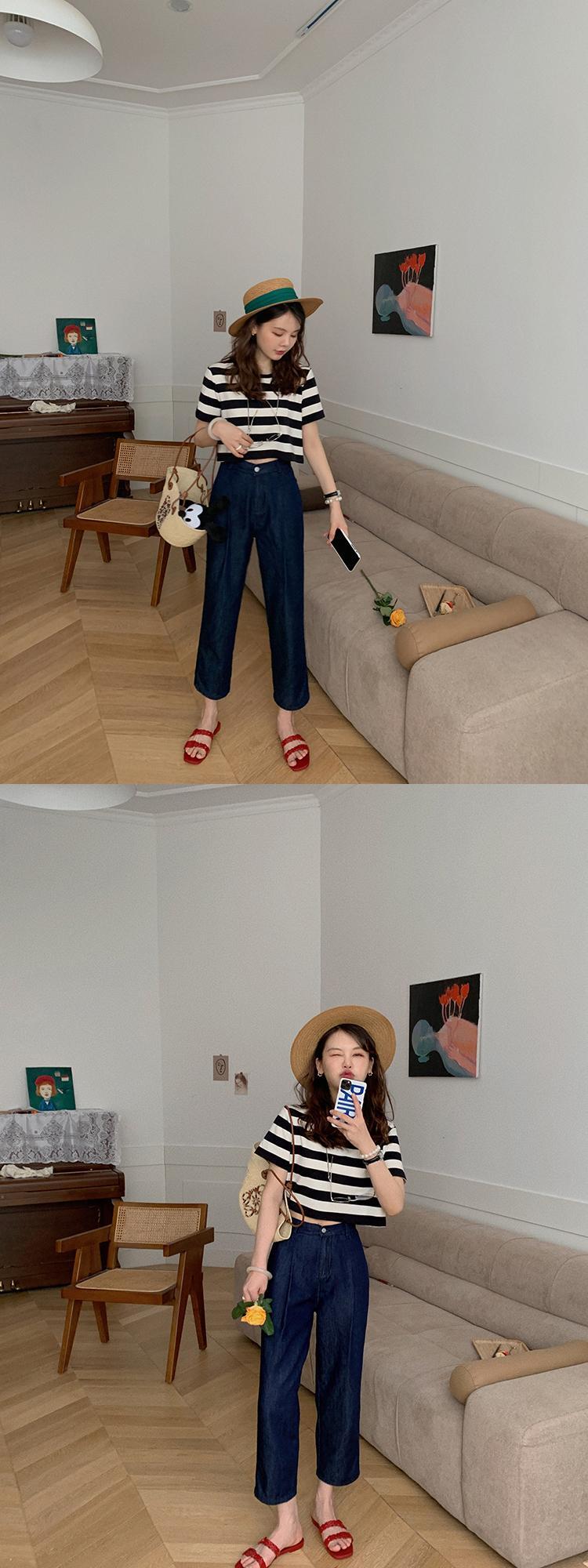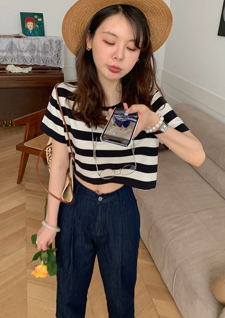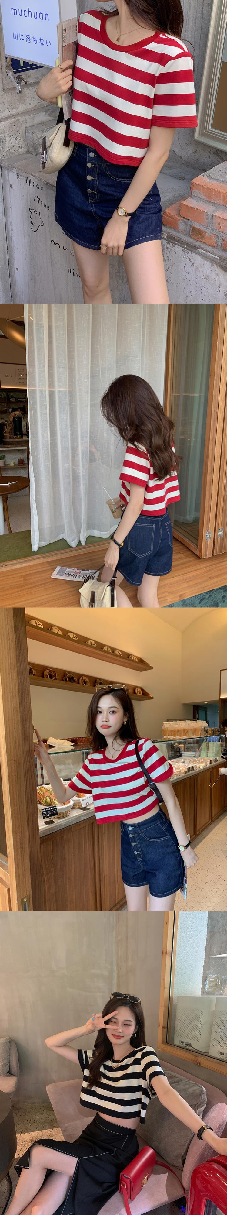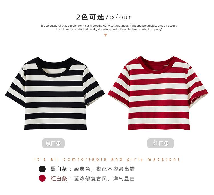 ミスシマリス【ホリデーフェアt】ショートバージョンが高い!半袖の黒と白のストライプのラウンドネックTシャツウエスタンスタイル missi95556464858