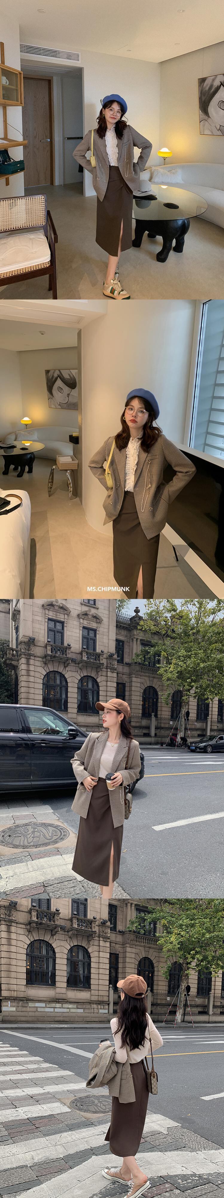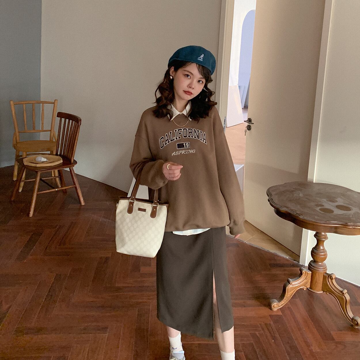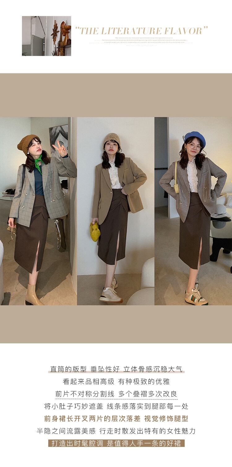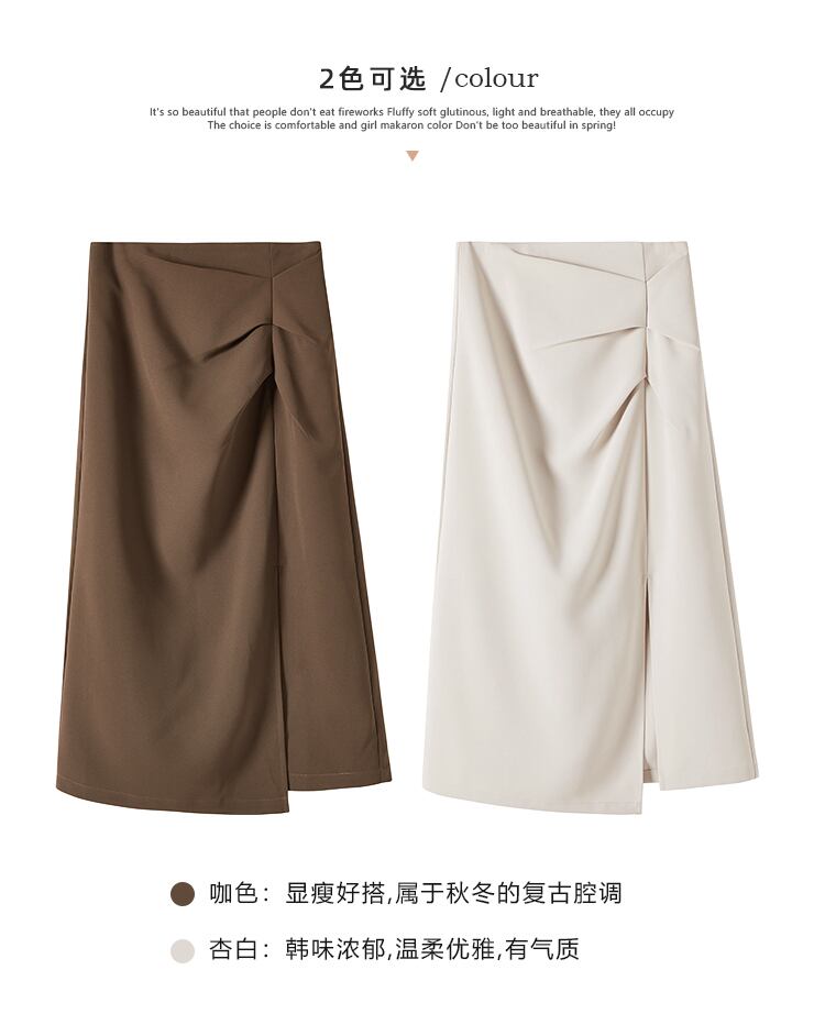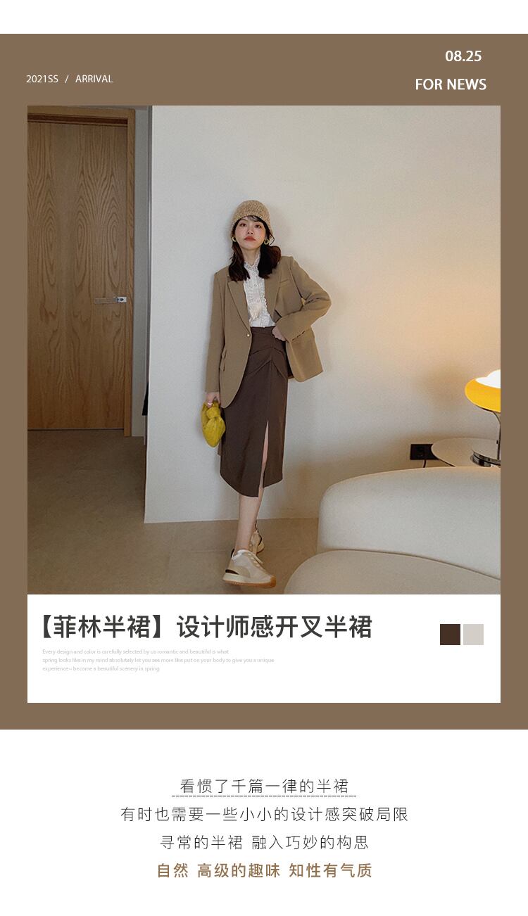 ミスチップマンクス【フィルムスカート】スリット入りスリミングのミドル丈ハイウエストコーヒーカラーデザインニッチスカート missi18496407665