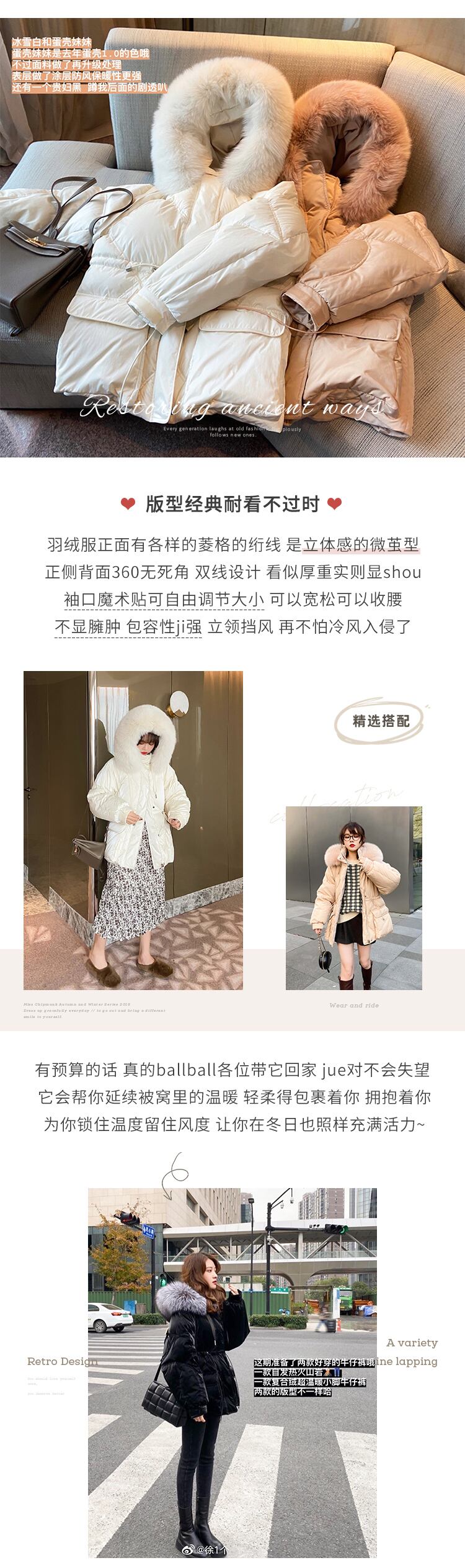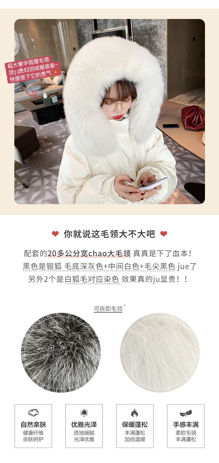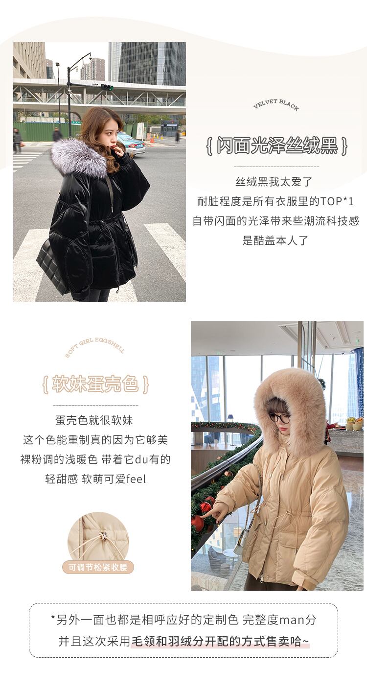 色:毛皮の襟なし、ベルベットブラック,毛皮の襟なし、卵殻色,ファーカラーなしキャンディーホワイト,(ファーカラーのみ)シルバーフォックスファーカラー,(ヘアカラーのみ)アプリコットフォックスカラー,(ファーカラーのみ)ピンクフォックスファーカラー