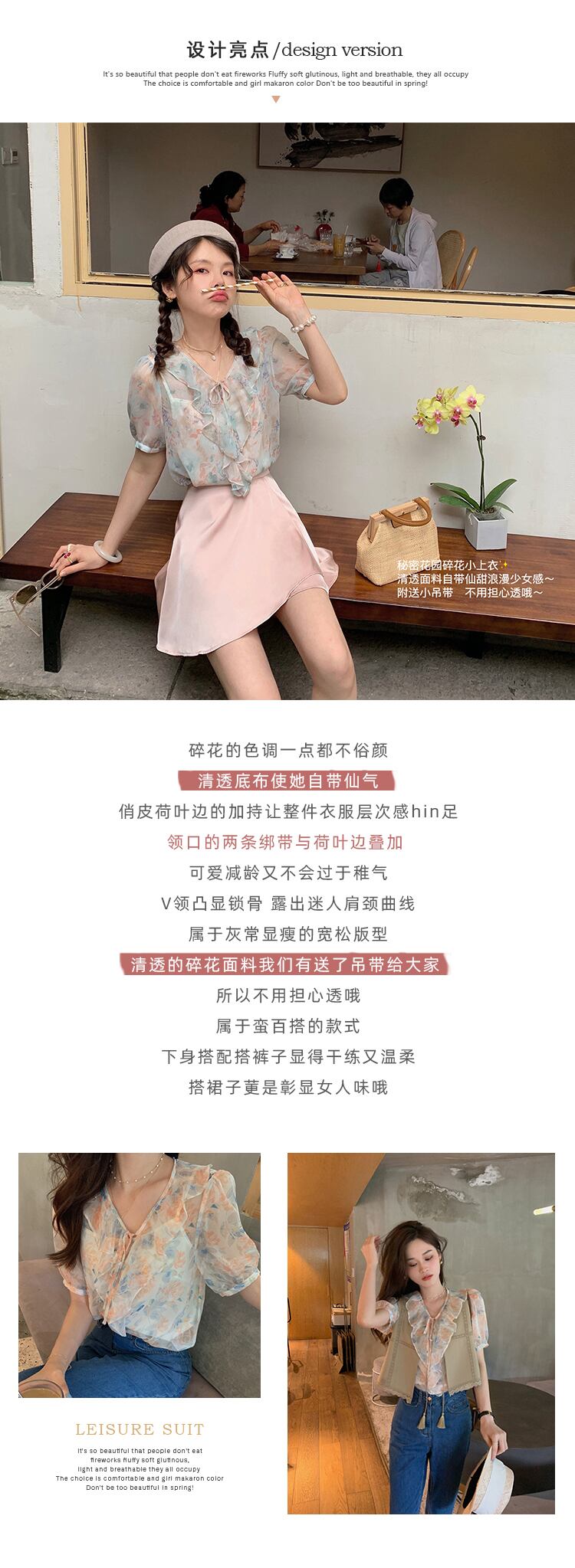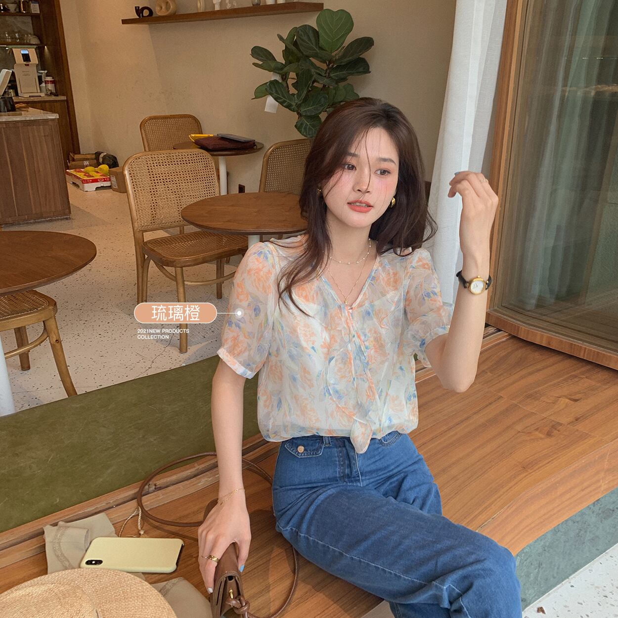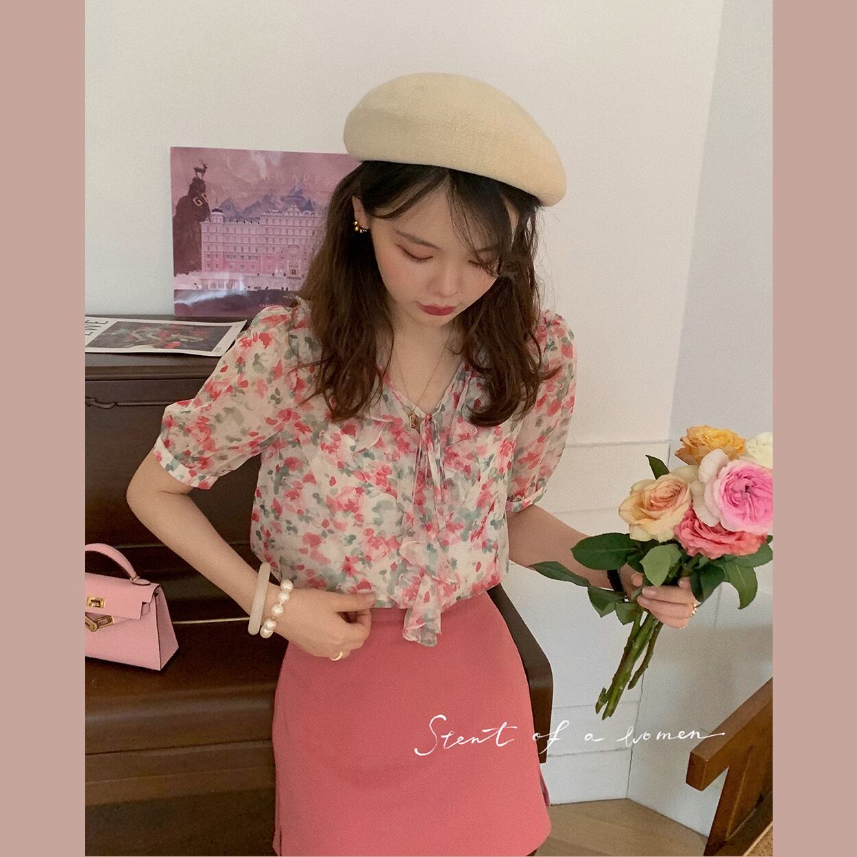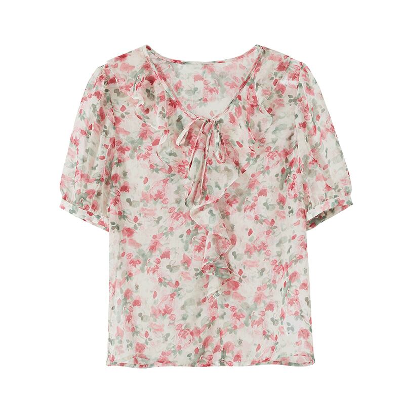 ミスシマリス【シークレットガーデン】フェアリーシフォンシャツフローラルVネックジェントル気質半袖トップス missi53512097614