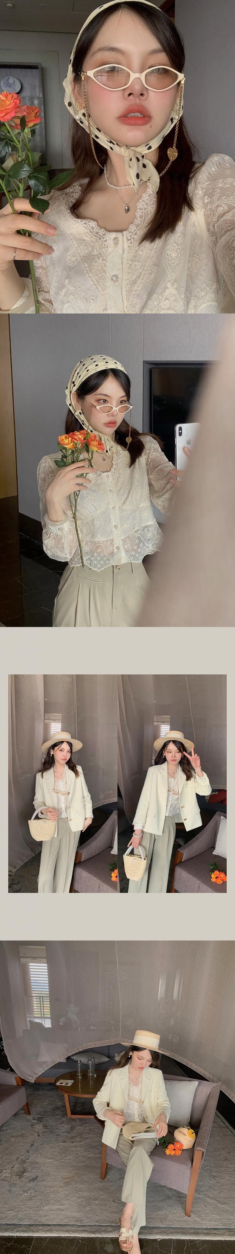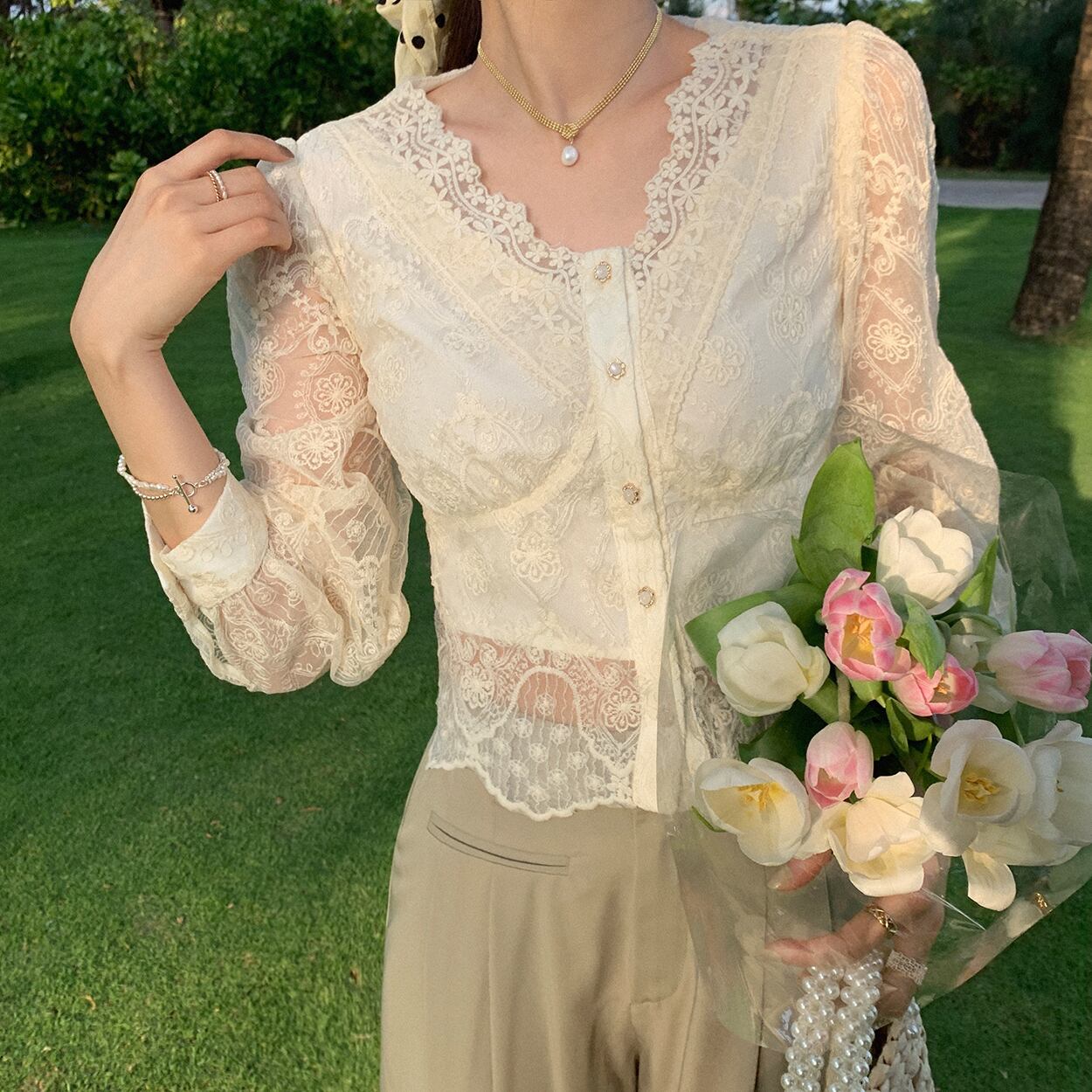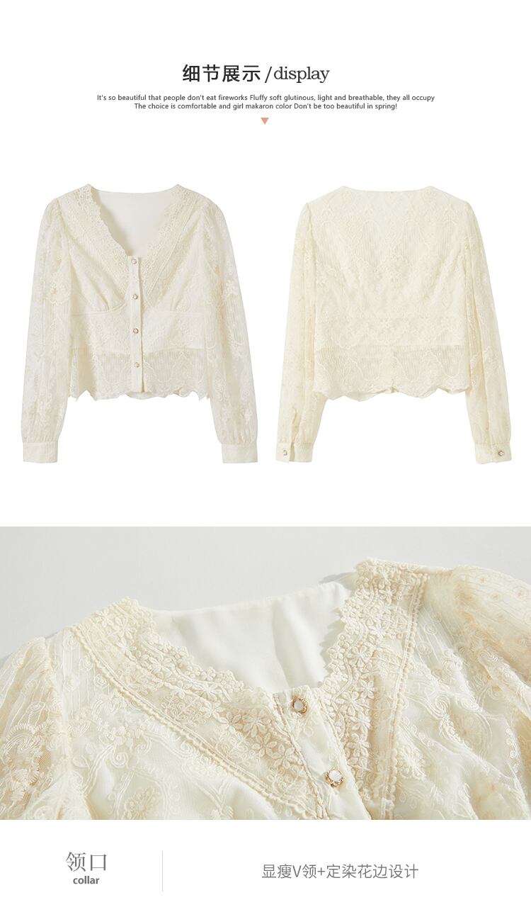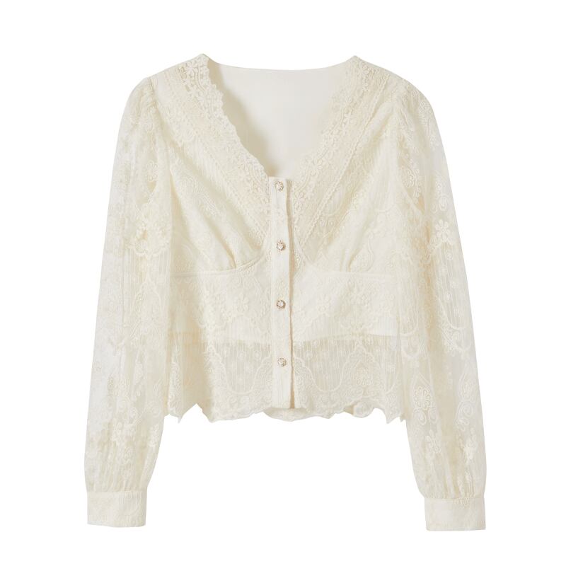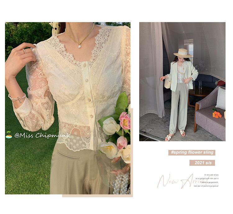 ミスシマリスクレースVネックスモールレースボトムシャツサマーロングスリーブシフォンシャツシックトップ2021 missi62440096056