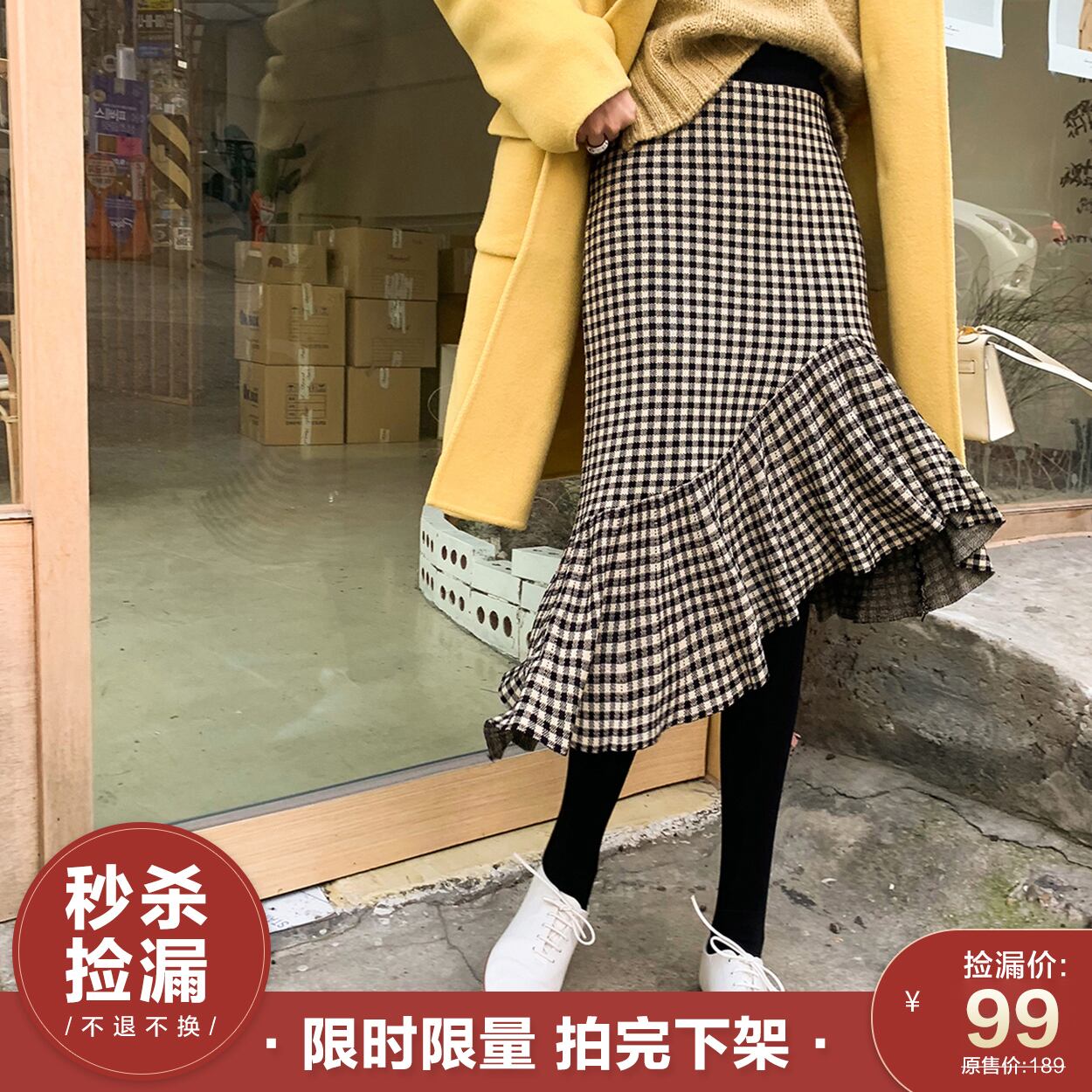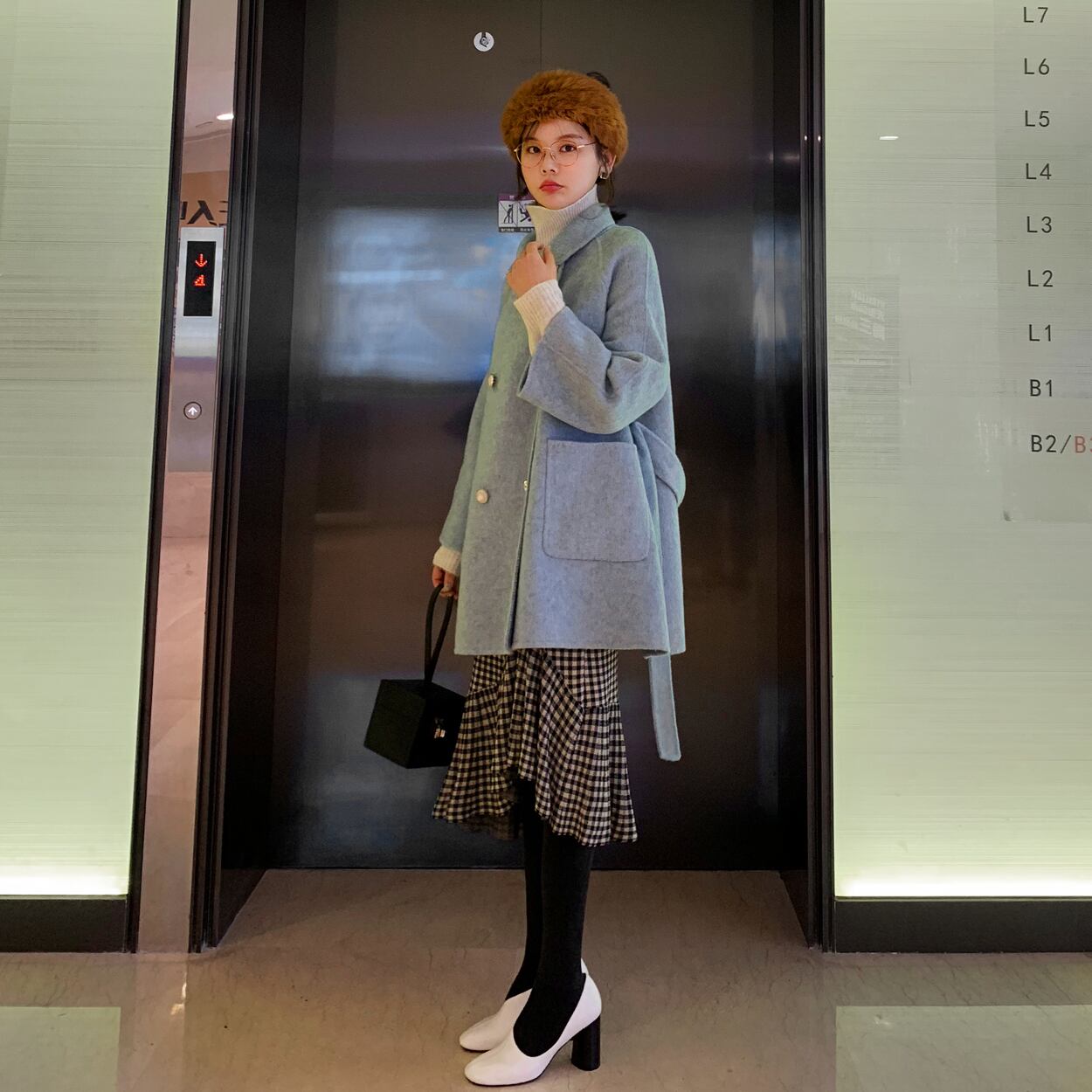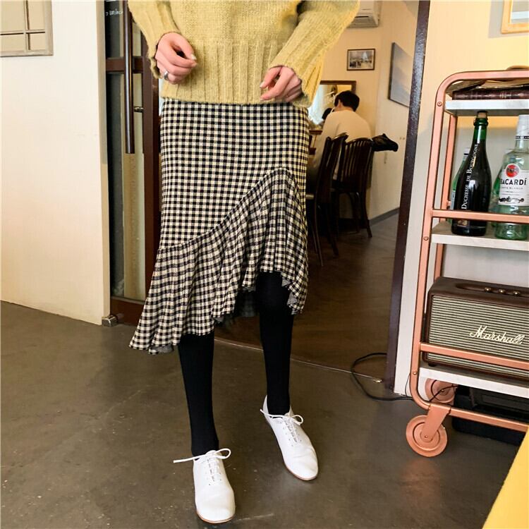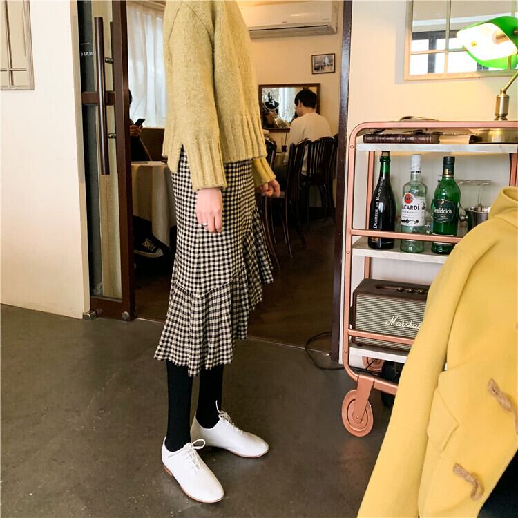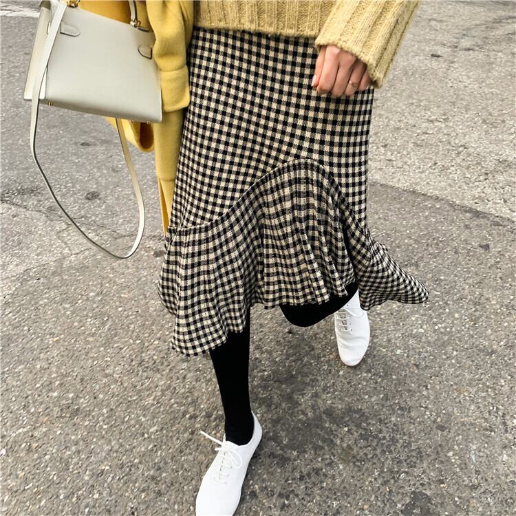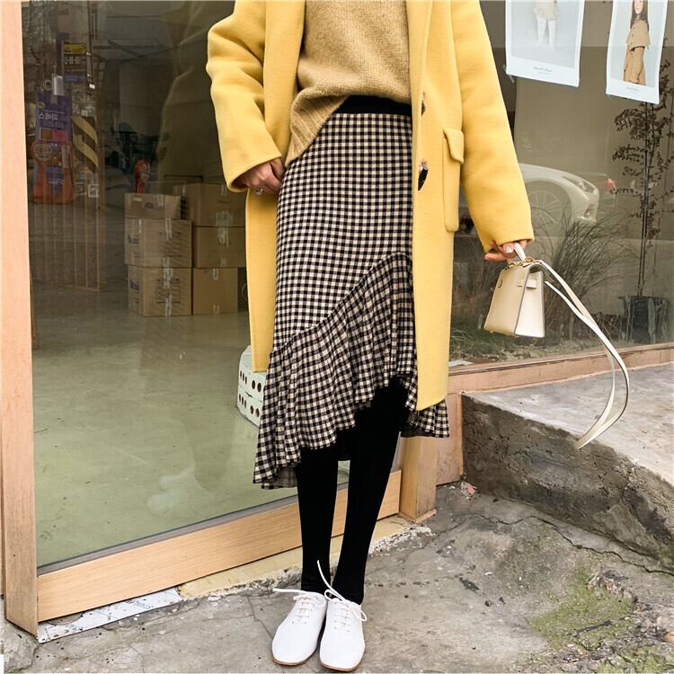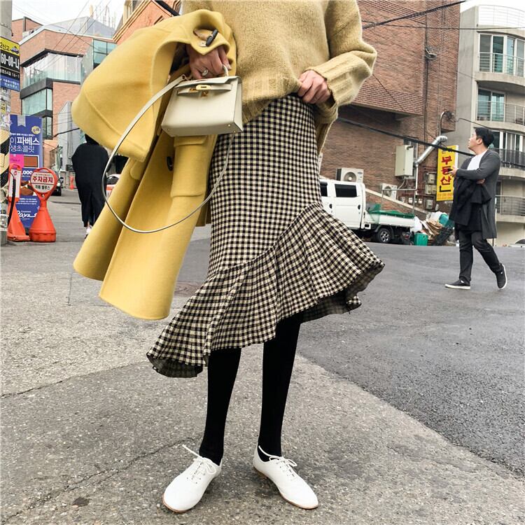 ミスシマリス、明るい色のコート、黒と白のチェック柄のニットマーメイドスカート、スカートの良いマッチ missi88051937823