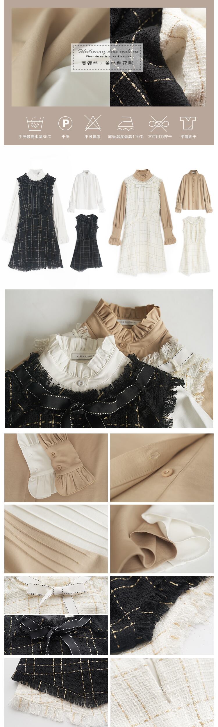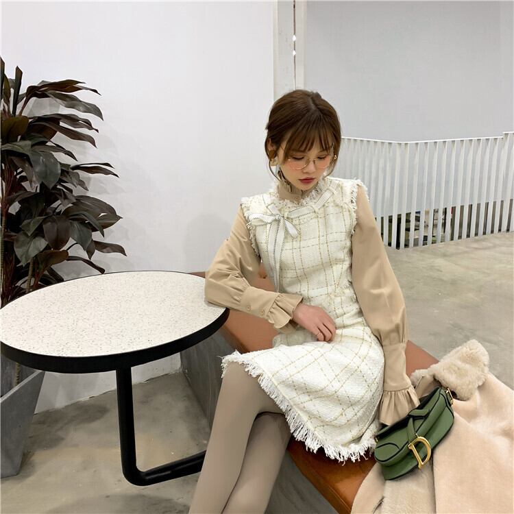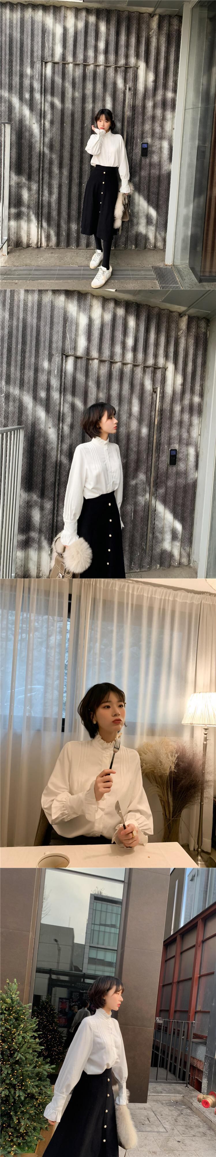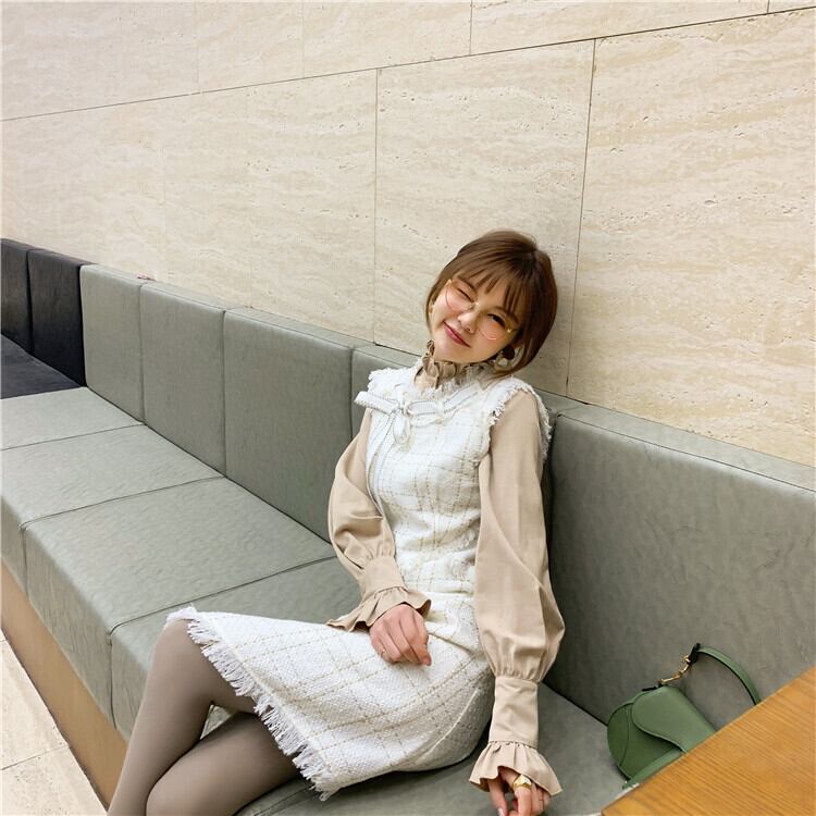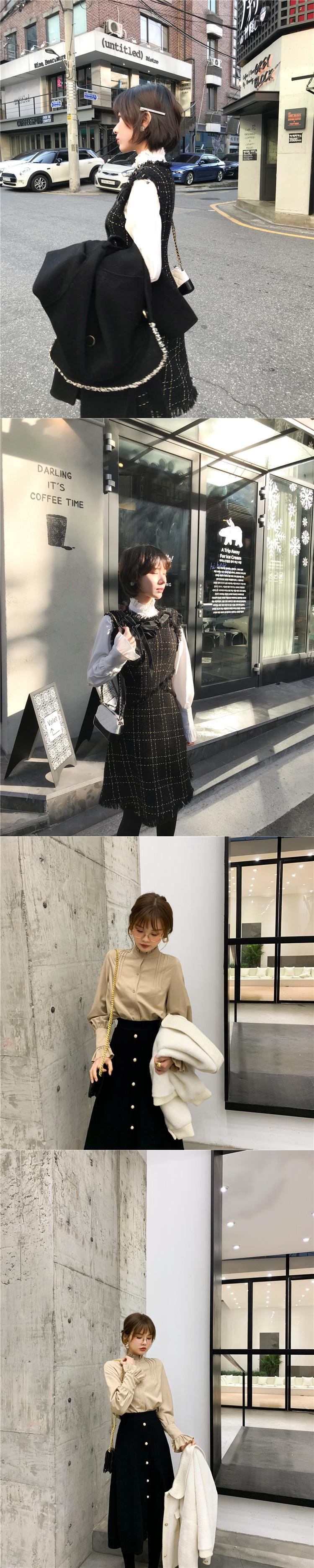色:白のシャツ,ベージュのシャツ,ブラックゴールドベストスカート,プラチナタンクドレス