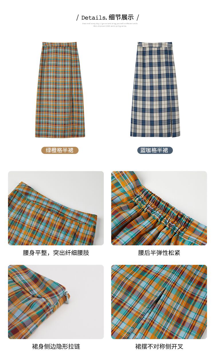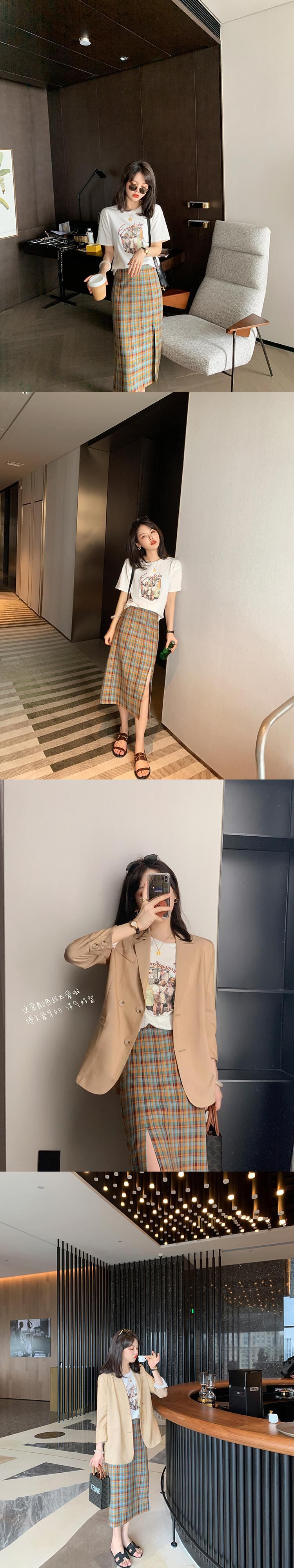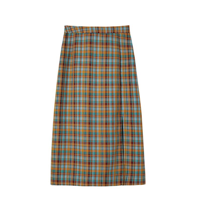 ミスシマリスハーフスカート2020夏新作チェック柄スプリットミドル丈Aラインハイウエストスリムスカート missi35616835806