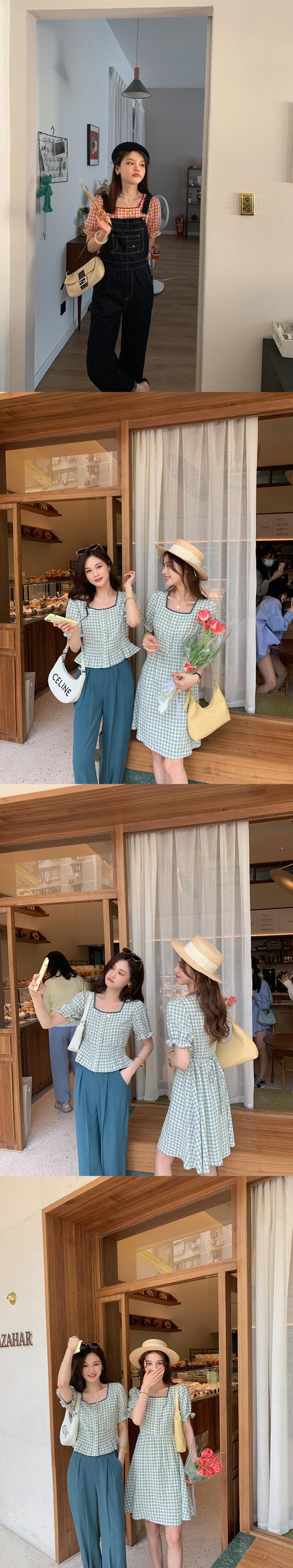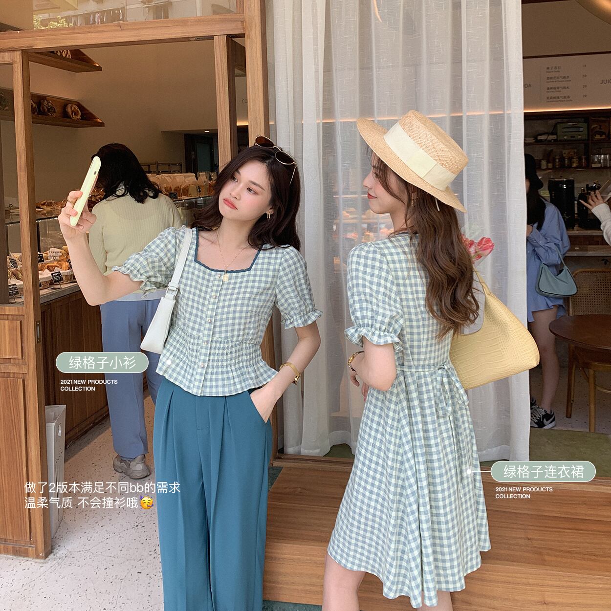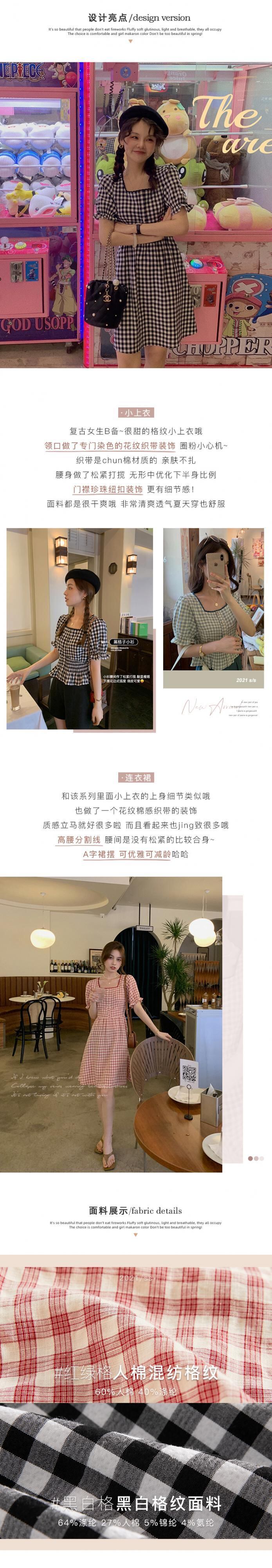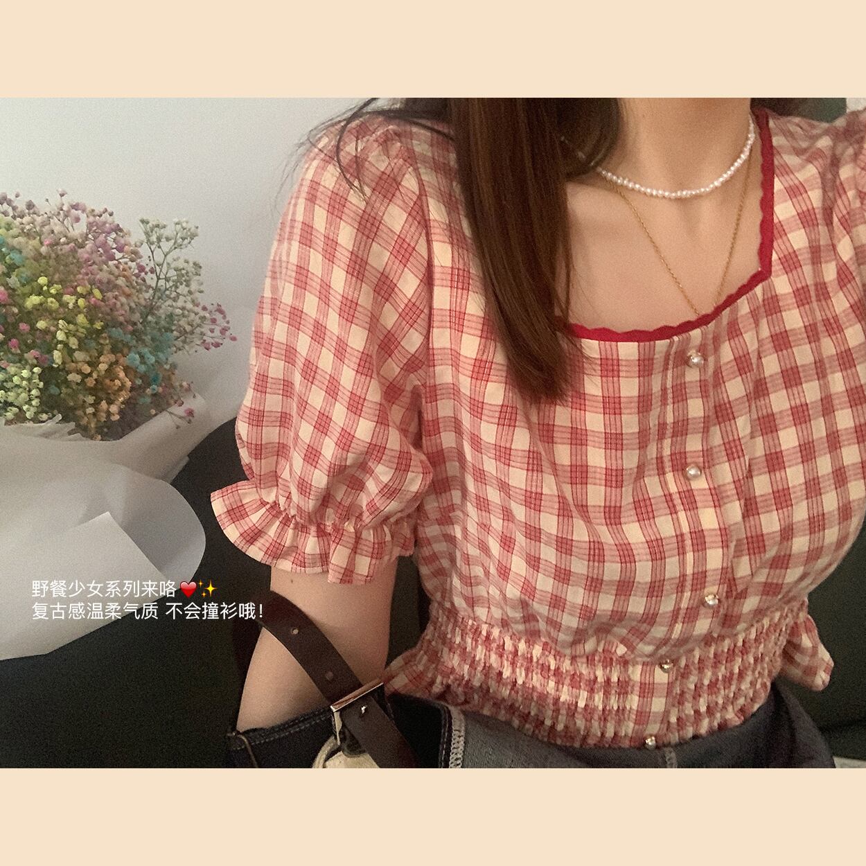 ミスチップマンク【ピクニックガール】チェック柄ワンピースサマー半袖スクエアカラーショートウエストスカートシャツ missi89409991627