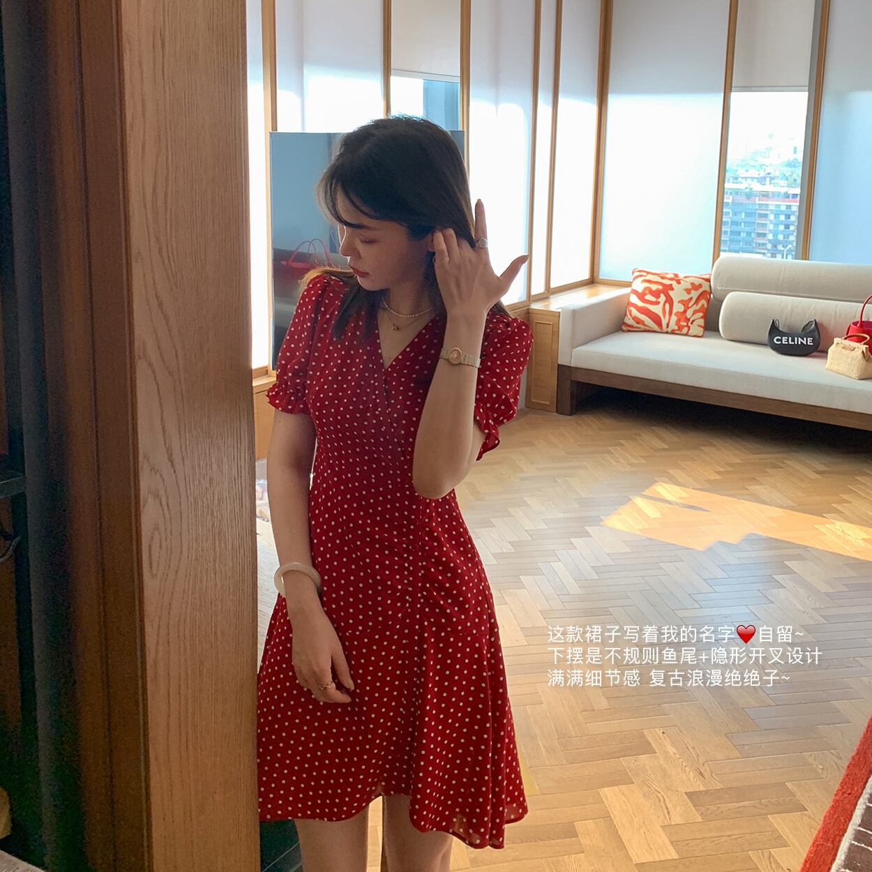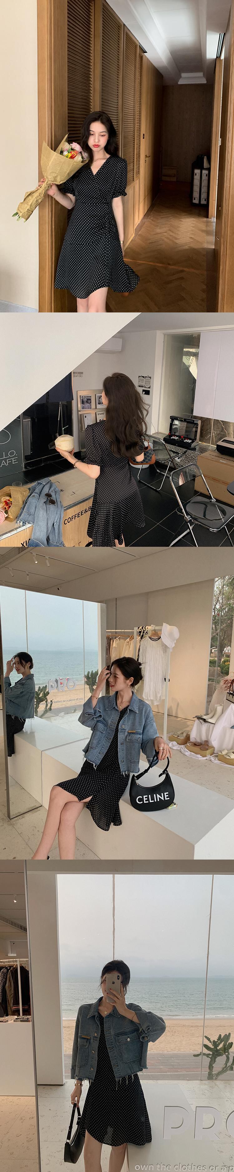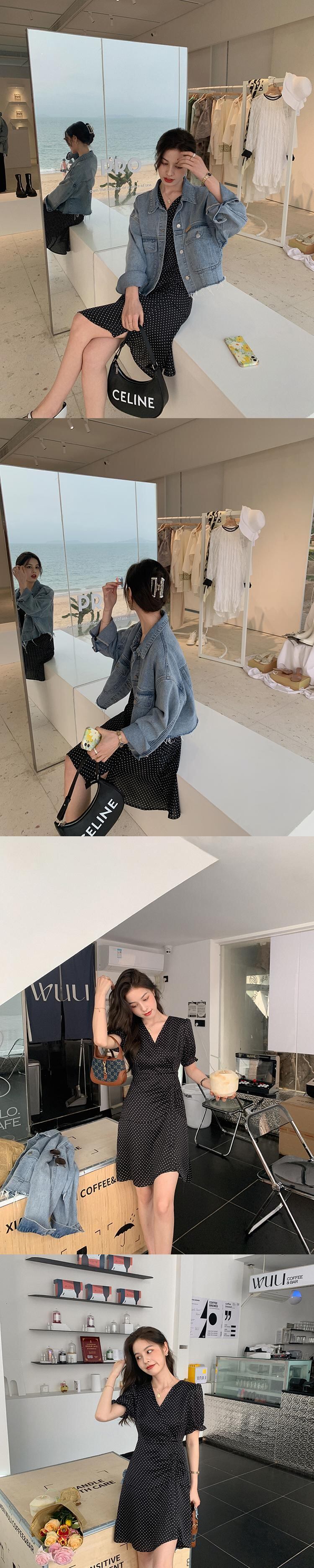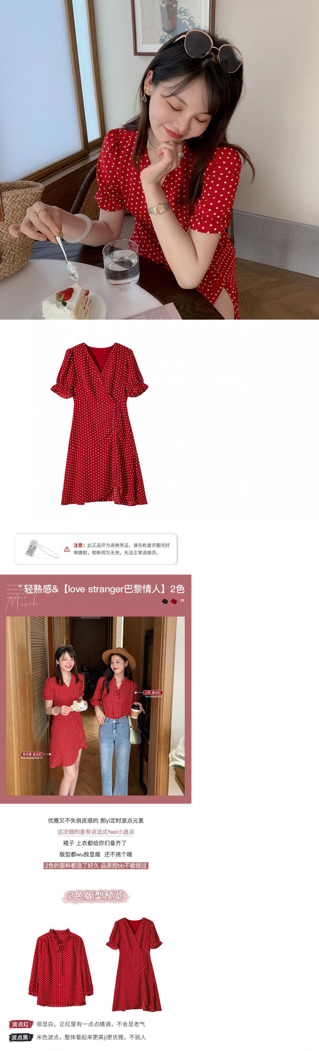 ミスシマリス赤水玉シフォンVネックドレス女性2021年夏の新しいハイウエストショートスカート missi86846548402