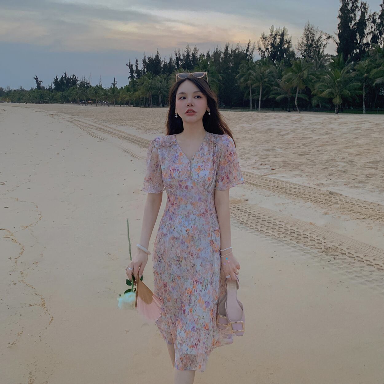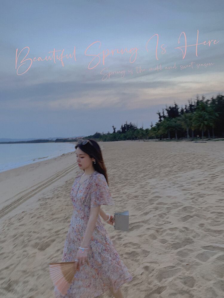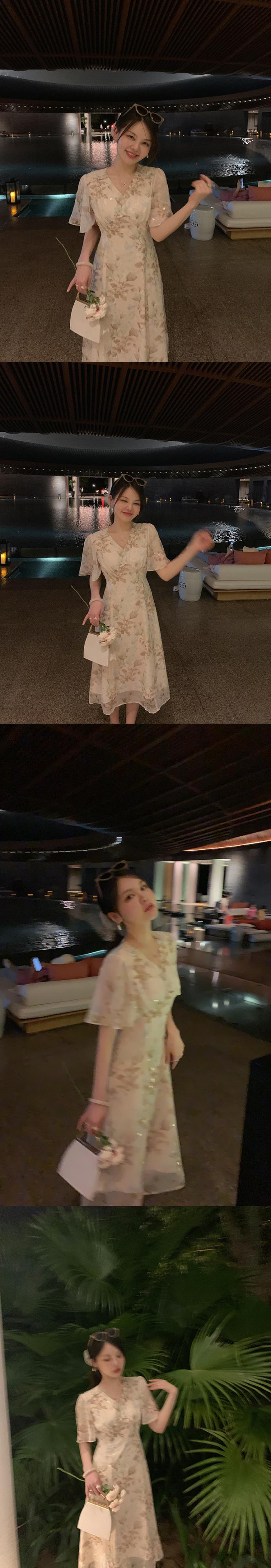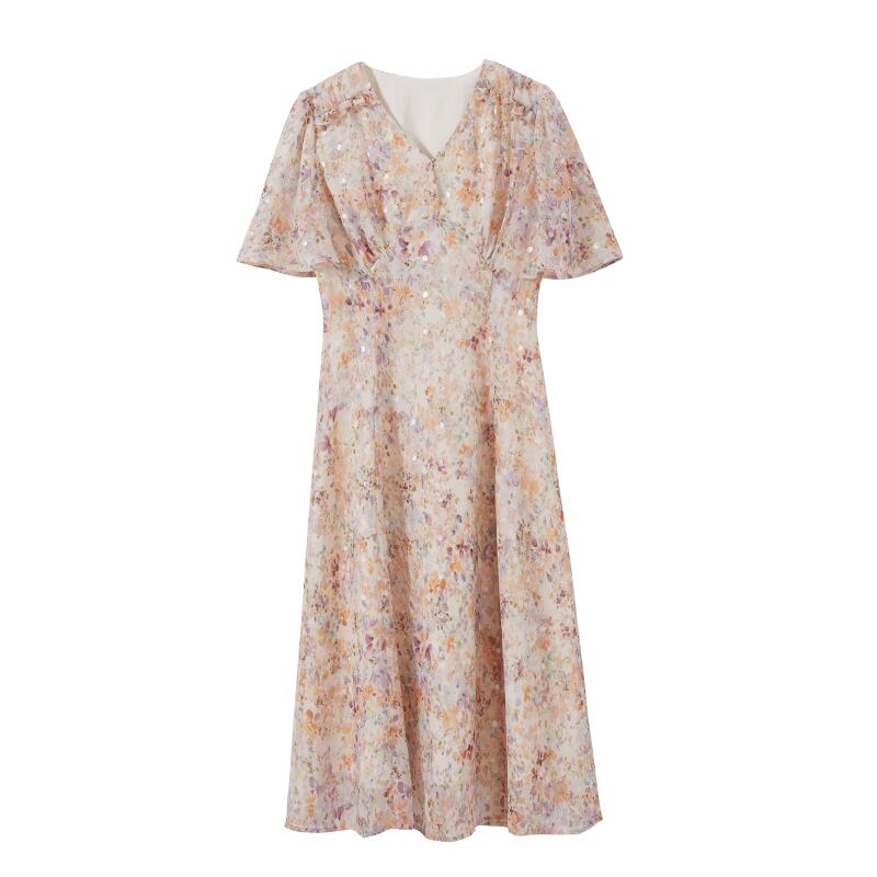 ミスシマリス[最高の時期は夢のようです] Vネックフローラルドレス女性XiaFeifeiスリーブスパンコール油絵ドレス missi9360430916