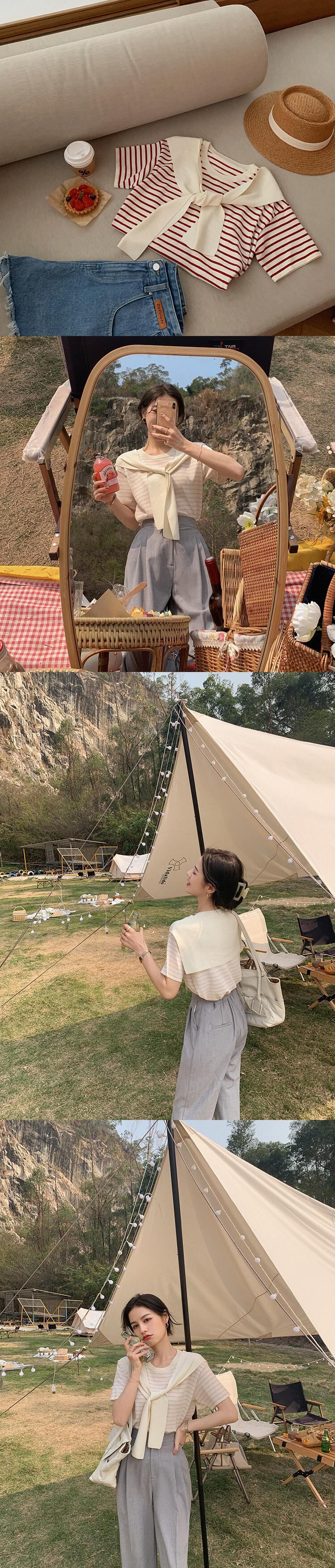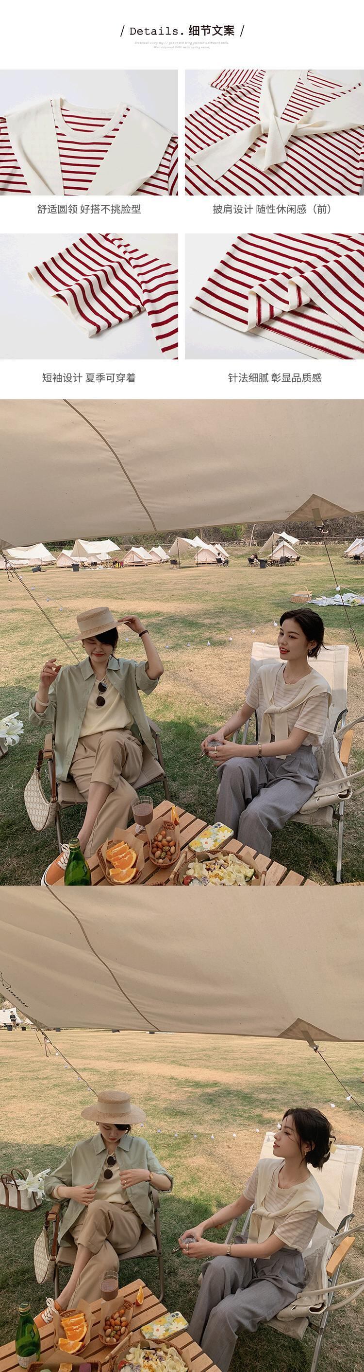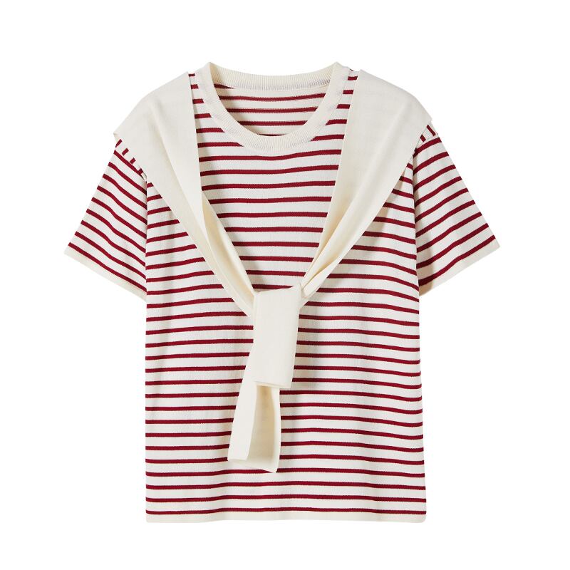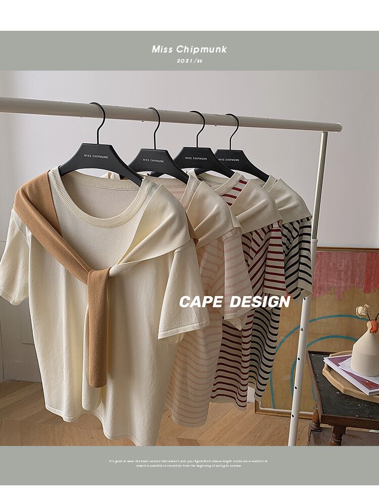 ミスシマリス[ブロガーt]ラウンドネック半袖ニットストライプTシャツ女性デザインショールトップ秋 missi85497985601