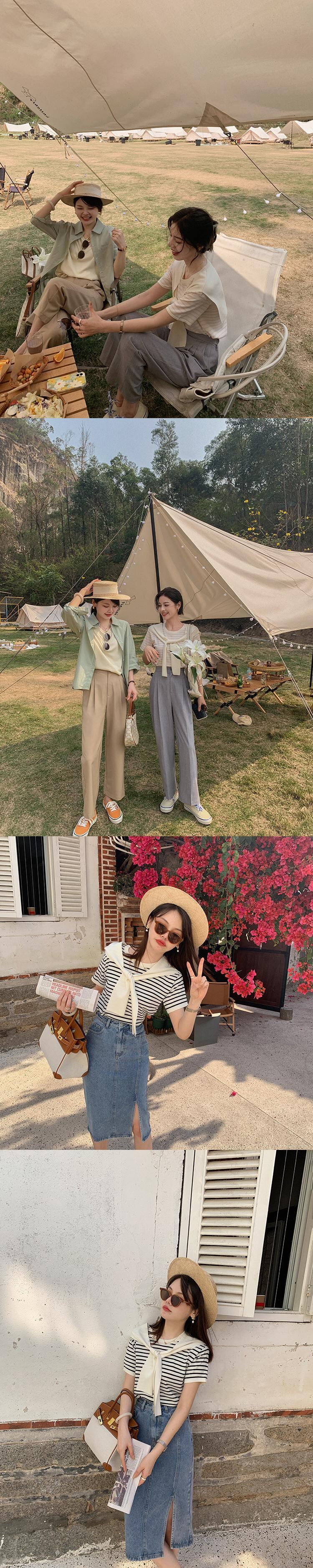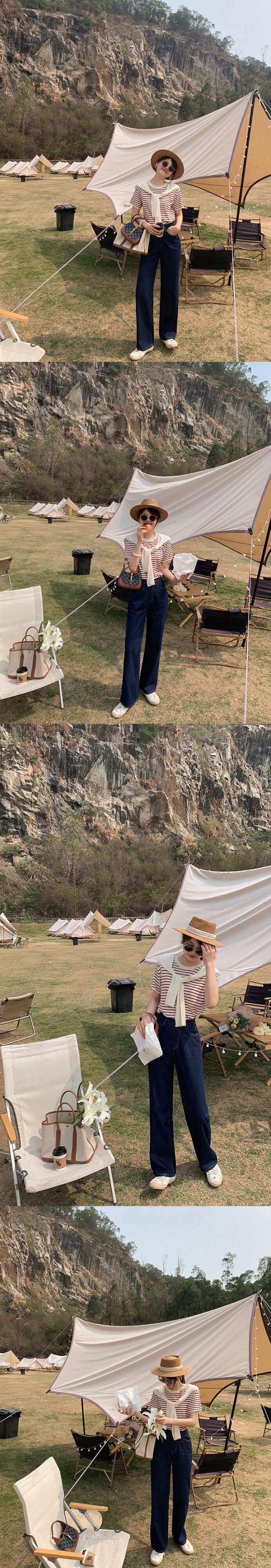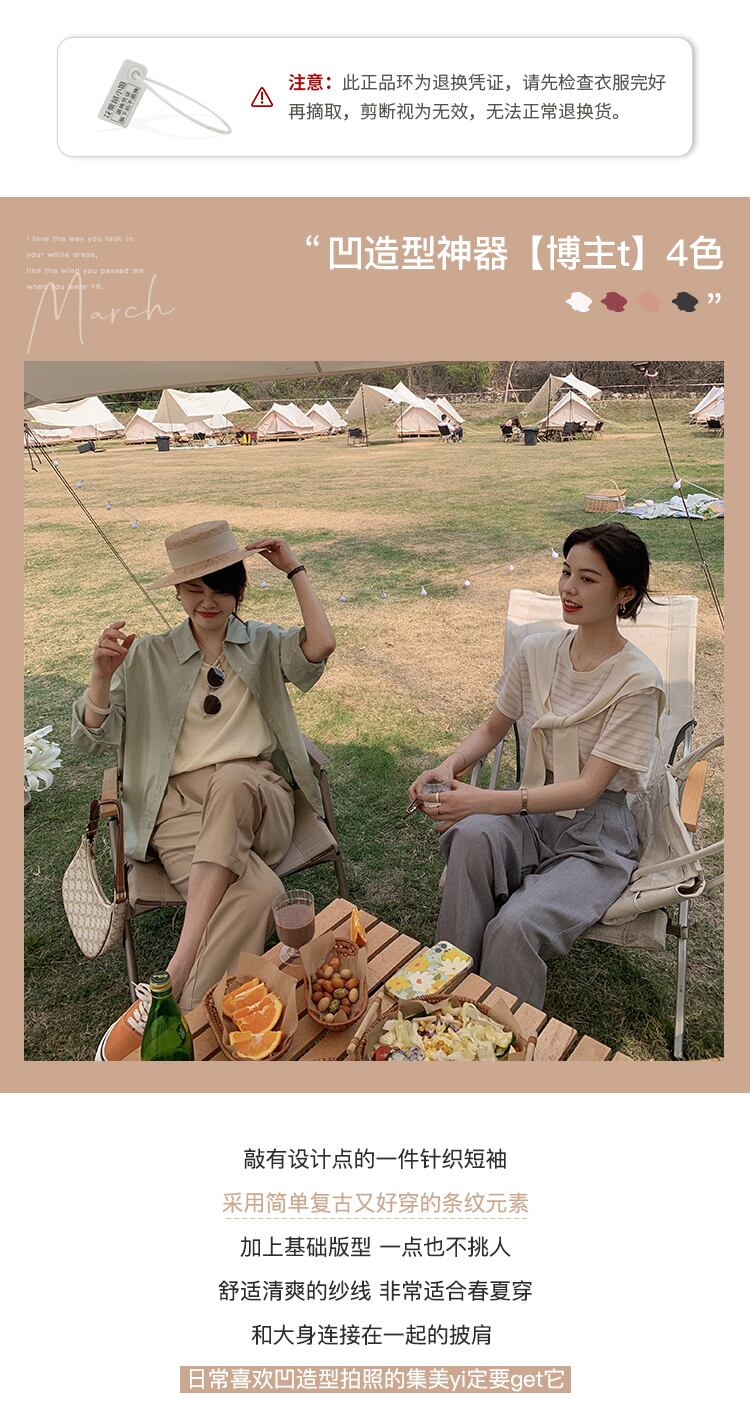 ミスシマリス[ブロガーt]ラウンドネック半袖ニットストライプTシャツ女性デザインショールトップ秋 missi85497985601