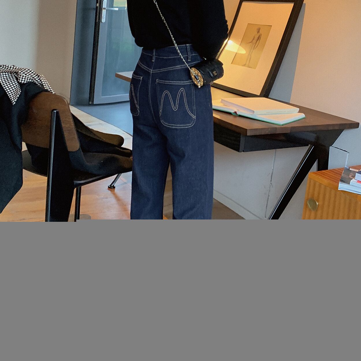ミスシマリス[Mカスタムジーンズ]レトロなダークブルーの刺繍とベルベットの秋冬のハイウエストストレートレッグパンツの女性 missi78053260738