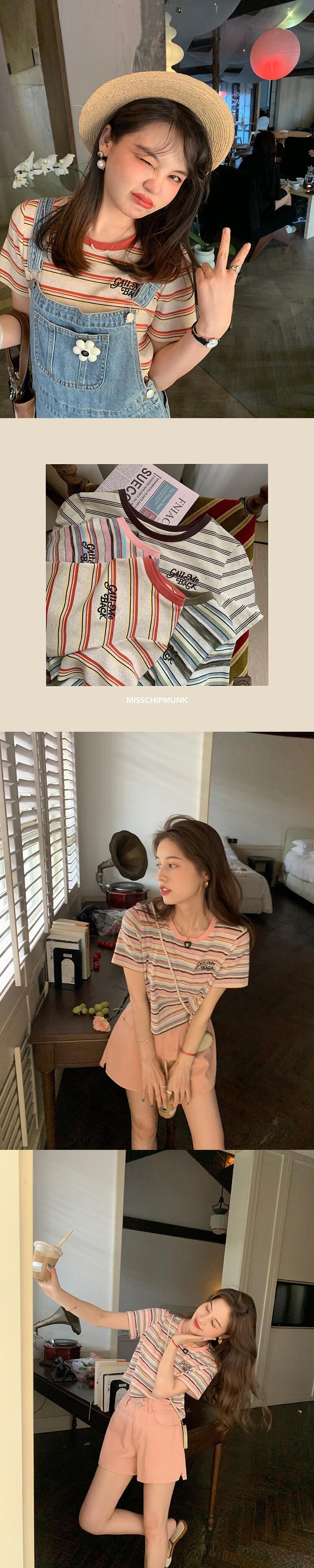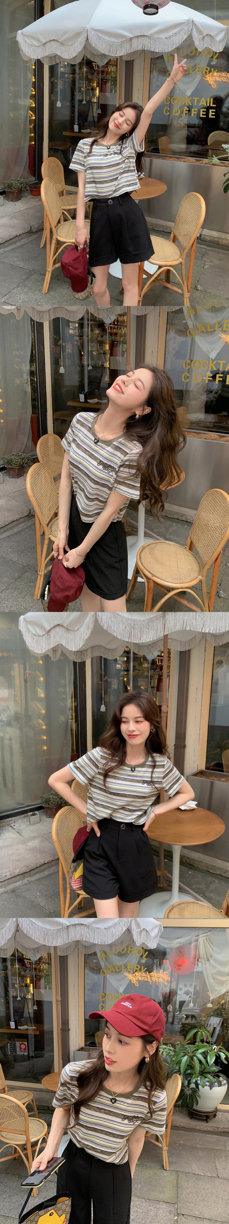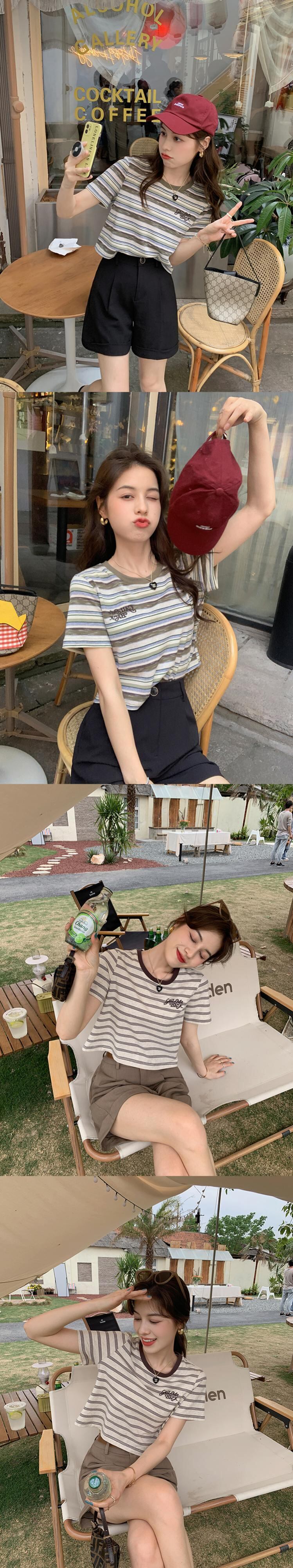 ミスシマリス[リターンカモフラージュT]レトロストライプショートTシャツレディースサマーラウンドネック半袖フロントショルダートップ missi41421836865