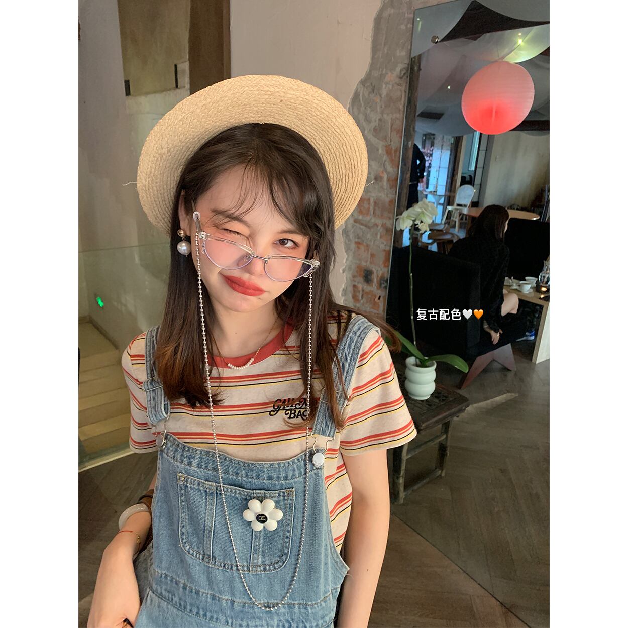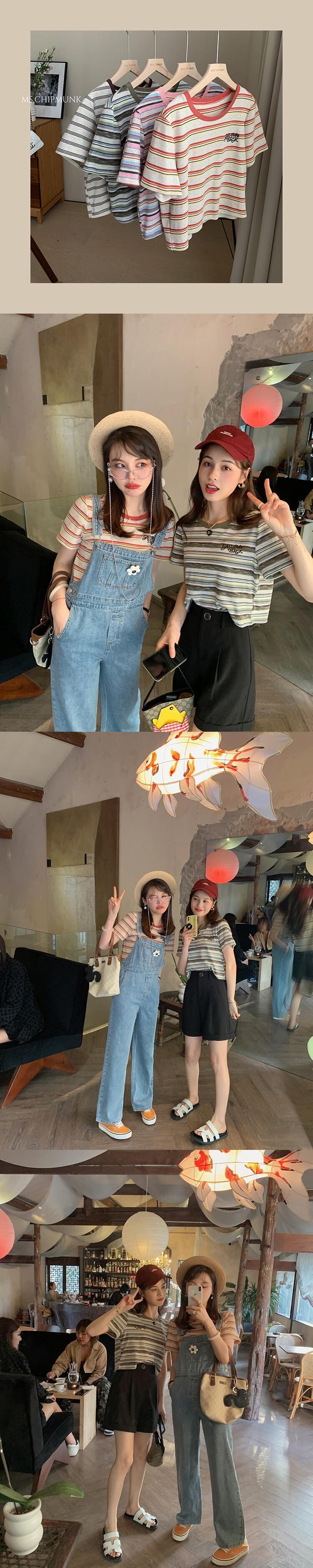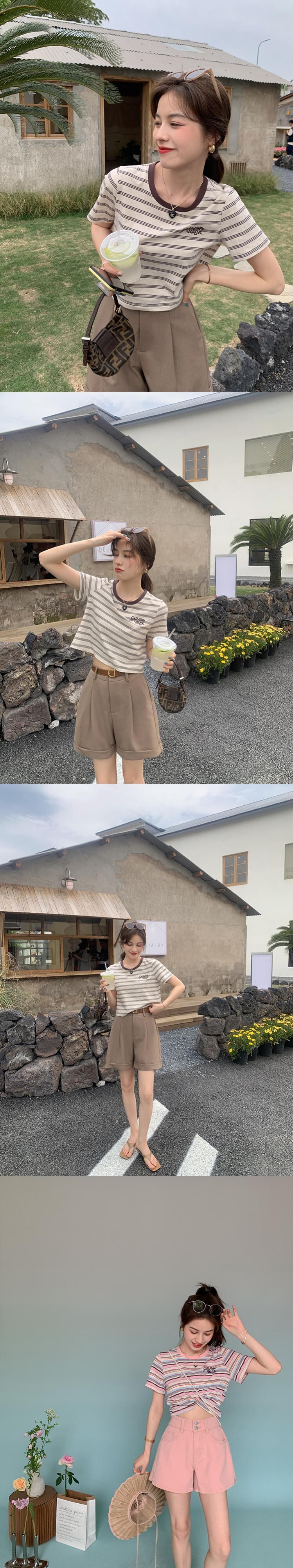 ミスシマリス[リターンカモフラージュT]レトロストライプショートTシャツレディースサマーラウンドネック半袖フロントショルダートップ missi41421836865