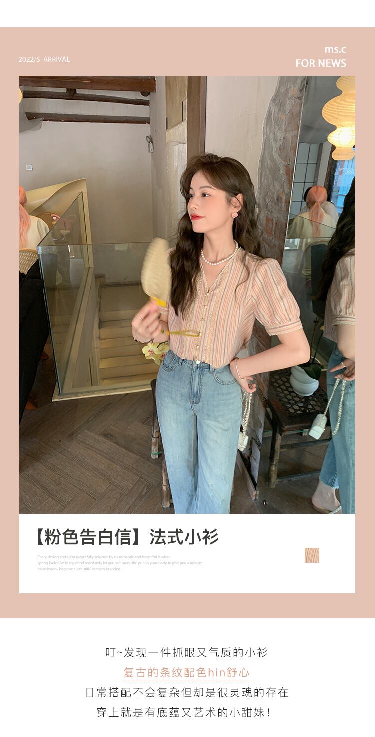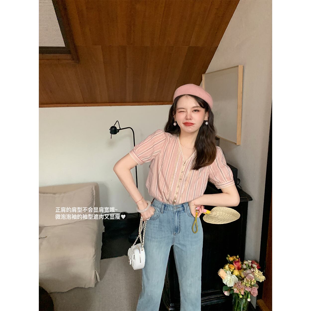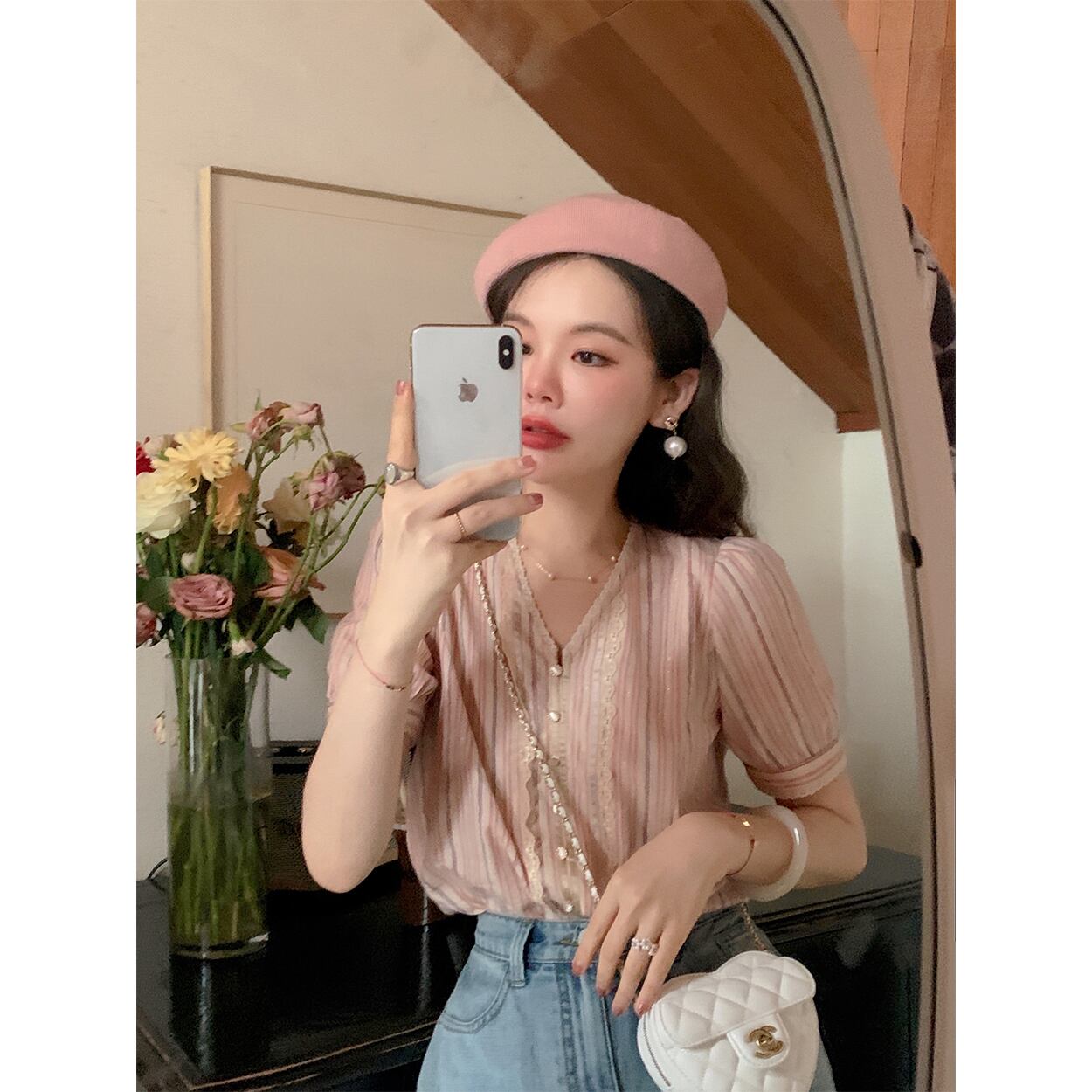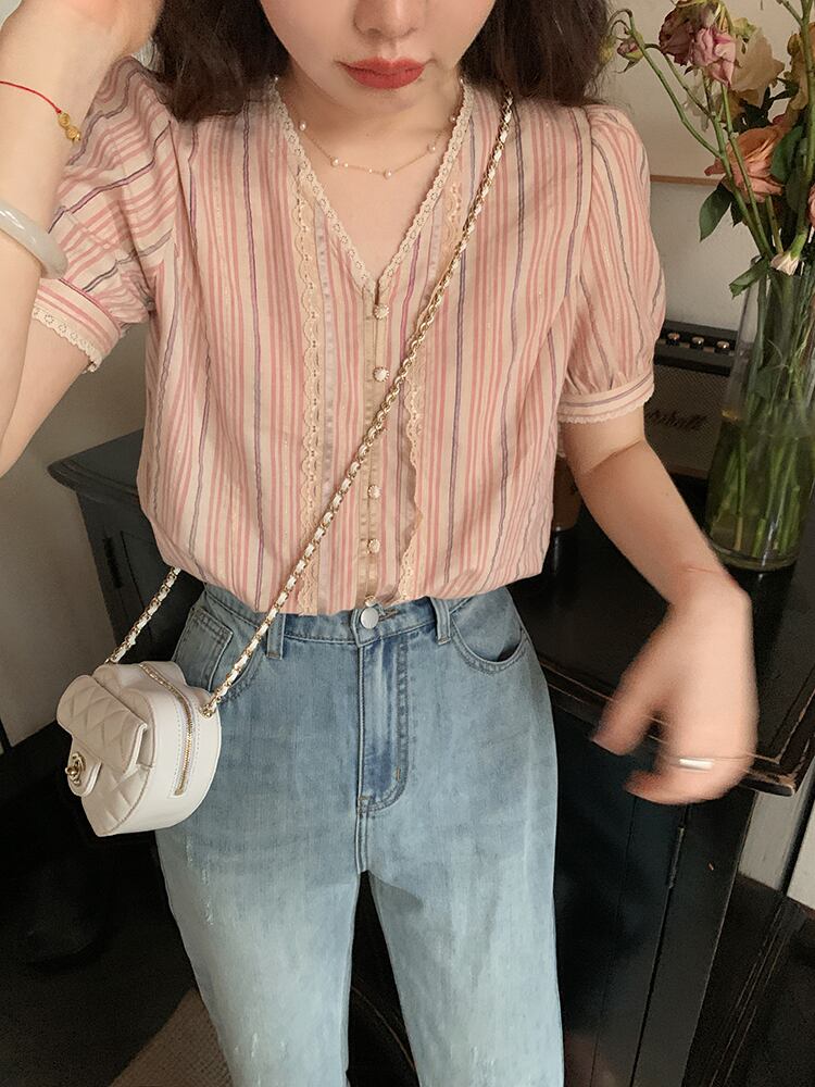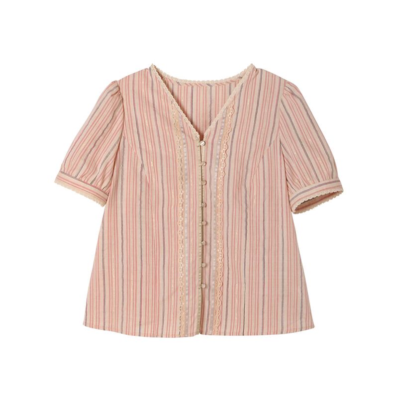 ミス シマリス[ピンクの告白の手紙] フレンチ ストライプ シャツ レディース 夏 パフスリーブ Vネック シック トップス missi14002339427