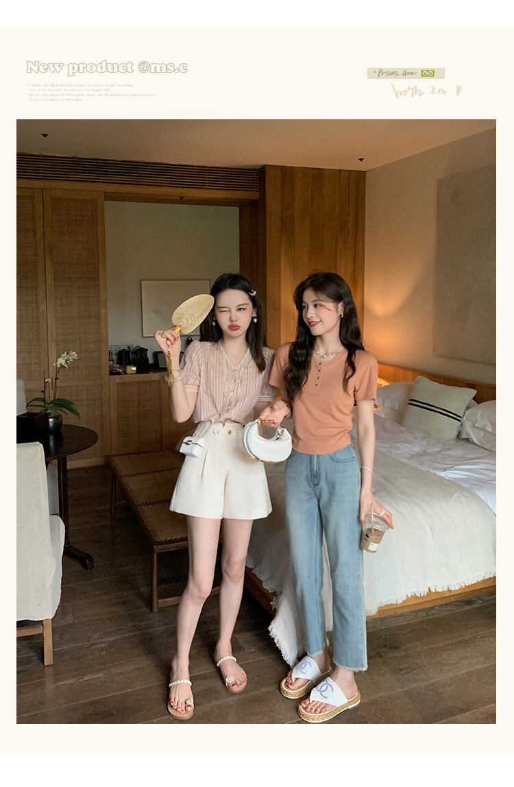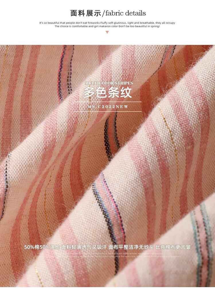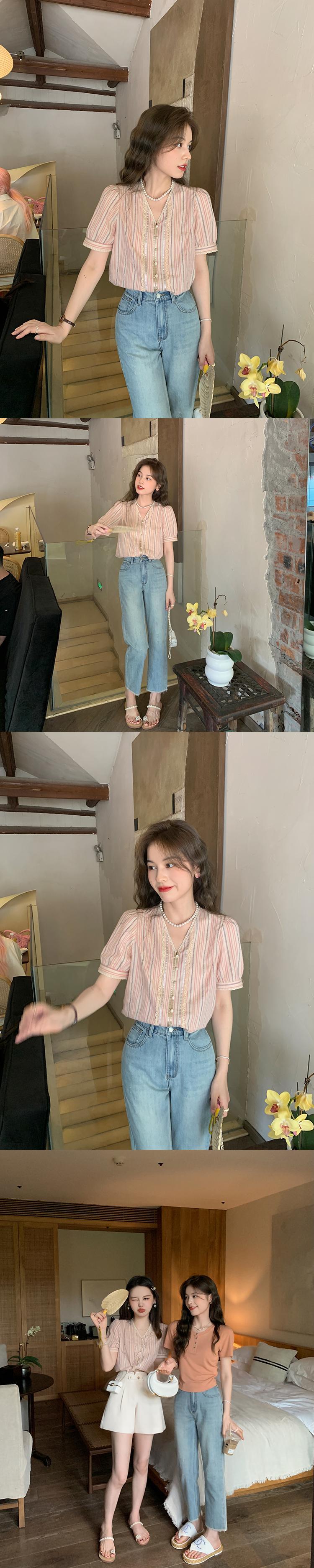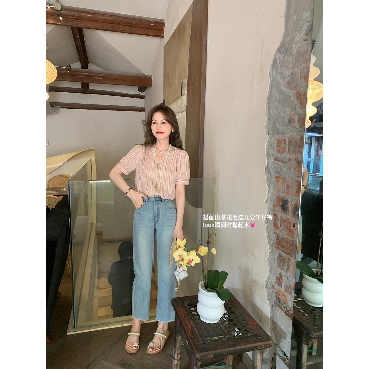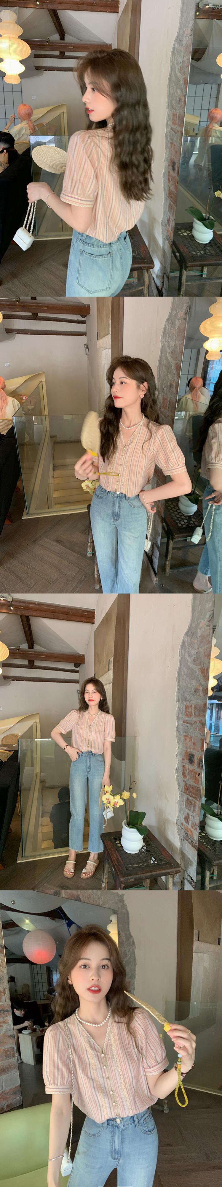 ミス シマリス[ピンクの告白の手紙] フレンチ ストライプ シャツ レディース 夏 パフスリーブ Vネック シック トップス missi14002339427