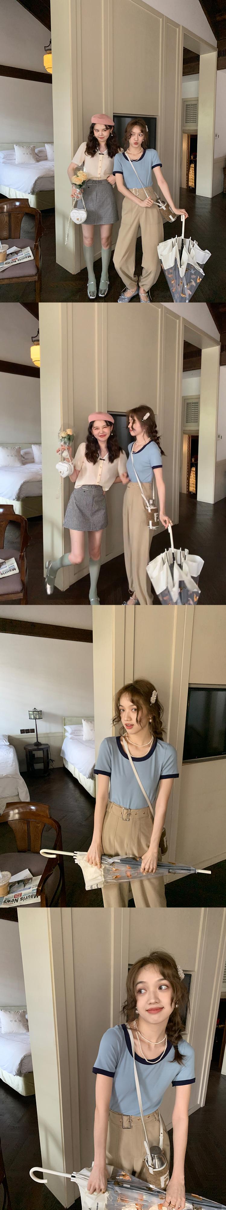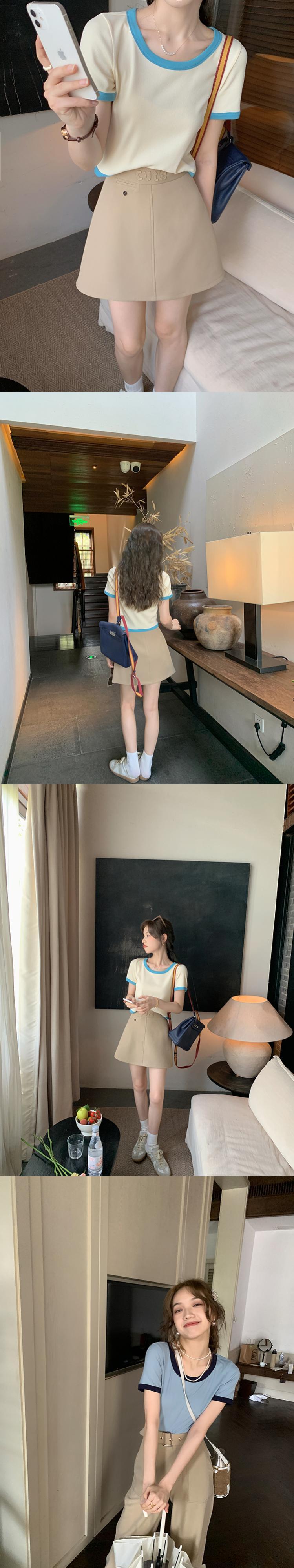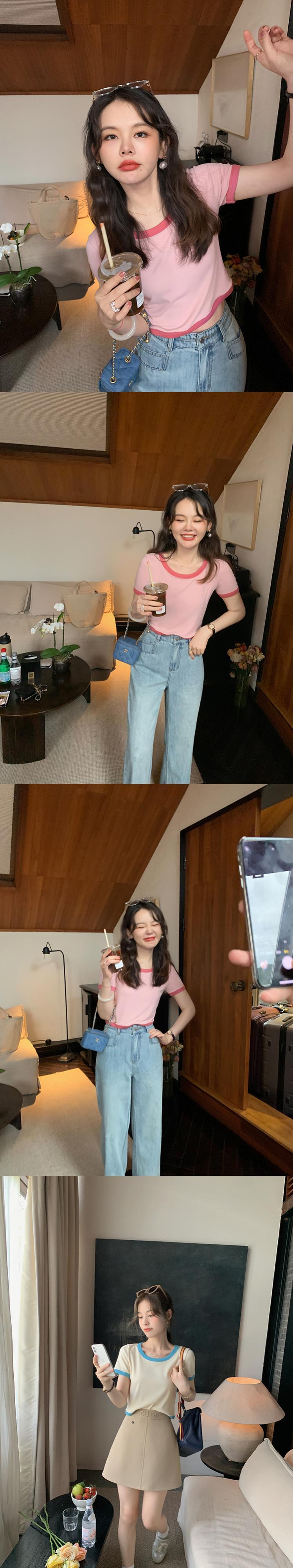 Miss Chipmunk 【またまたドーナツt】アイスシルク コントラストカラー 半袖Tシャツ 女性 夏 Uネック ゆったり 薄手 トップス missi41929829540