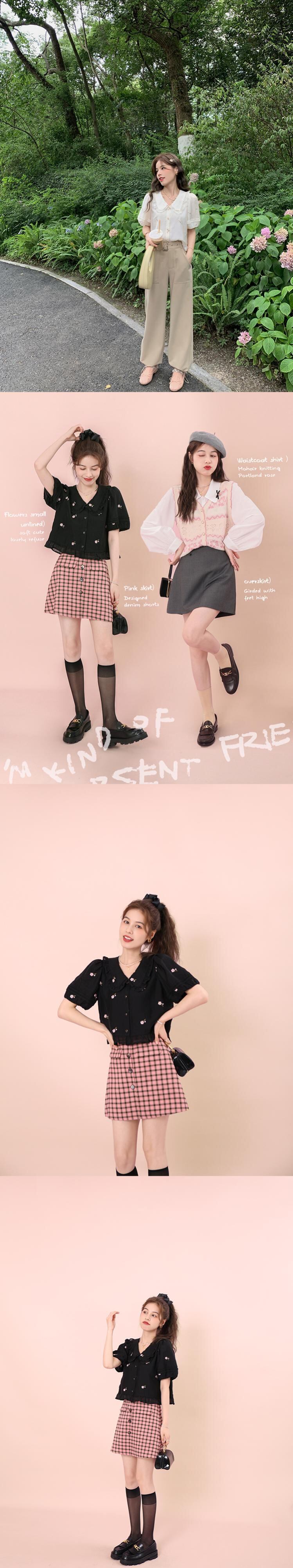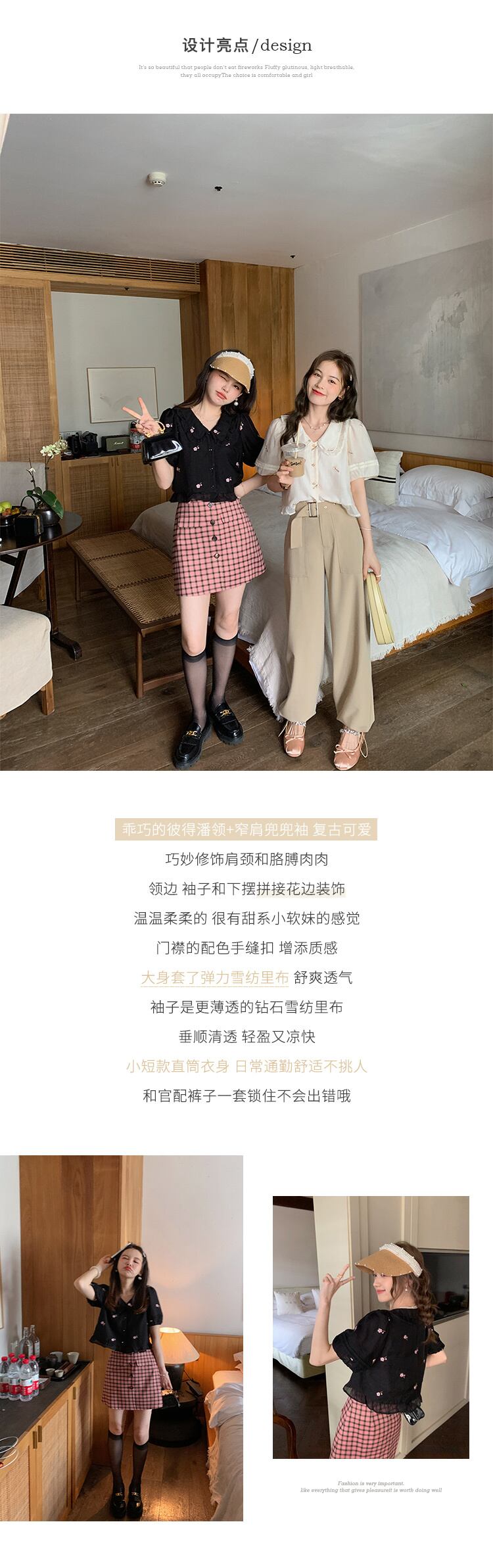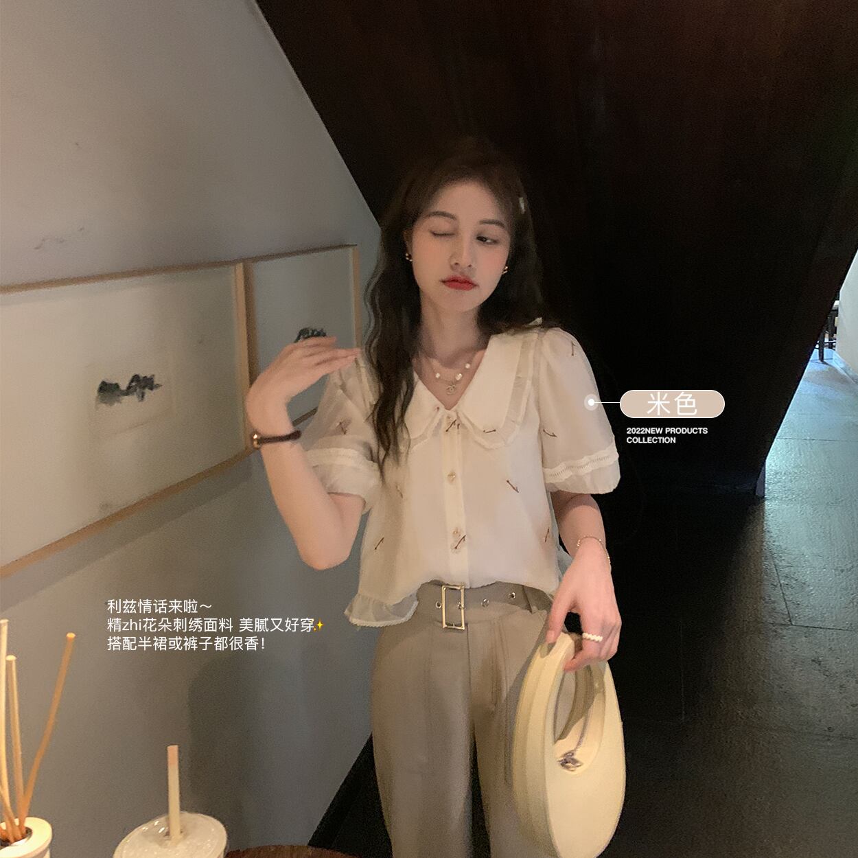 ミス シマリス[リーズ ラブ ストーリー] 刺繍 ドールカラー トップス レディース サマーシック Vネック 半袖 ナローショルダー シャツ missi92332509062
