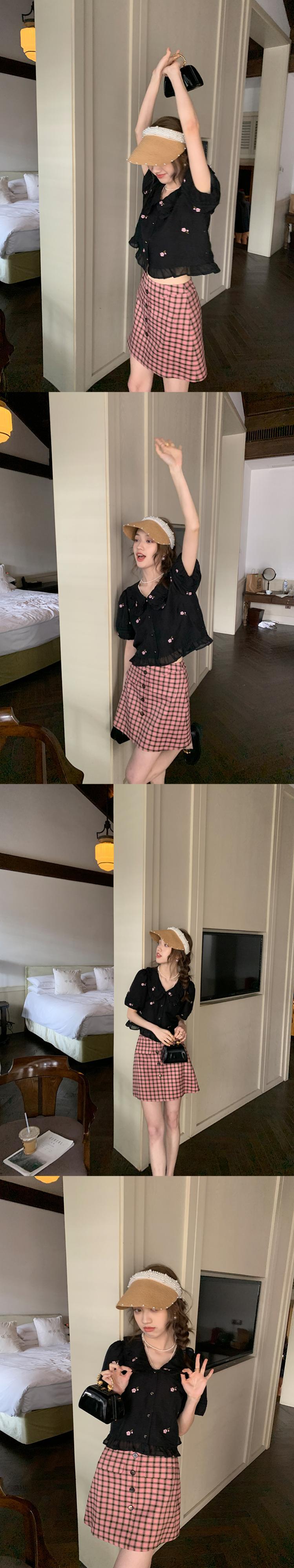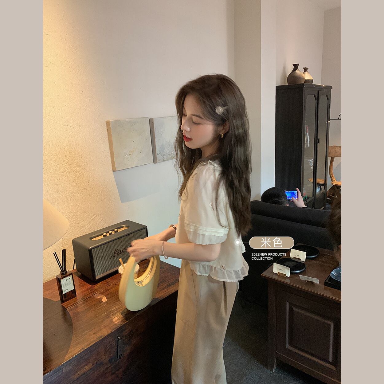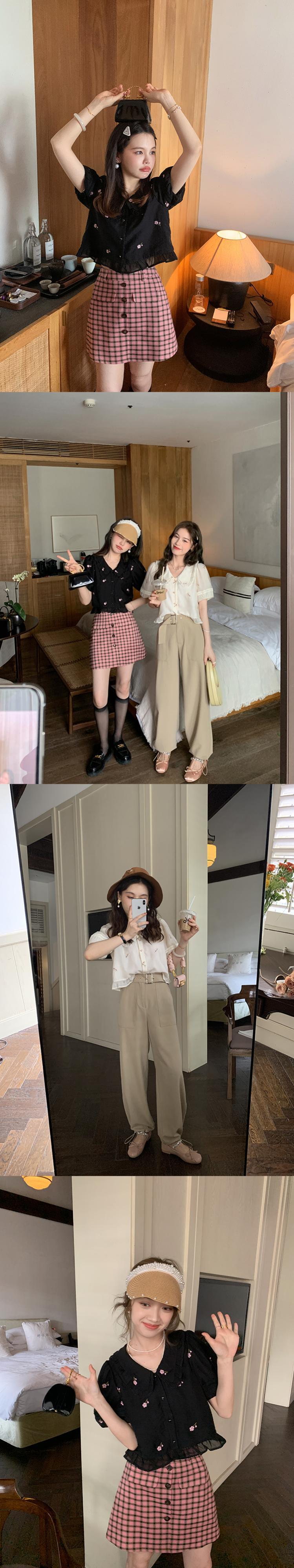 ミス シマリス[リーズ ラブ ストーリー] 刺繍 ドールカラー トップス レディース サマーシック Vネック 半袖 ナローショルダー シャツ missi92332509062