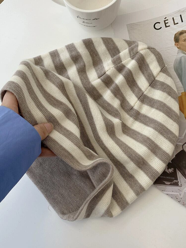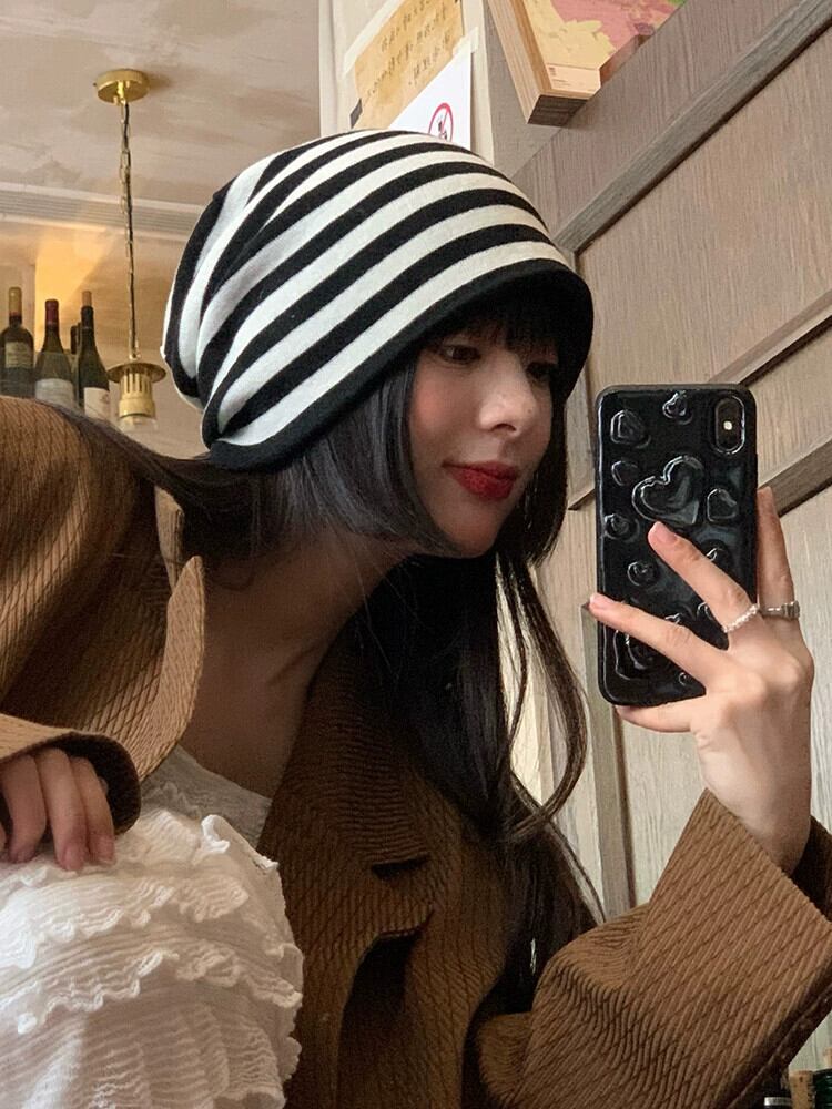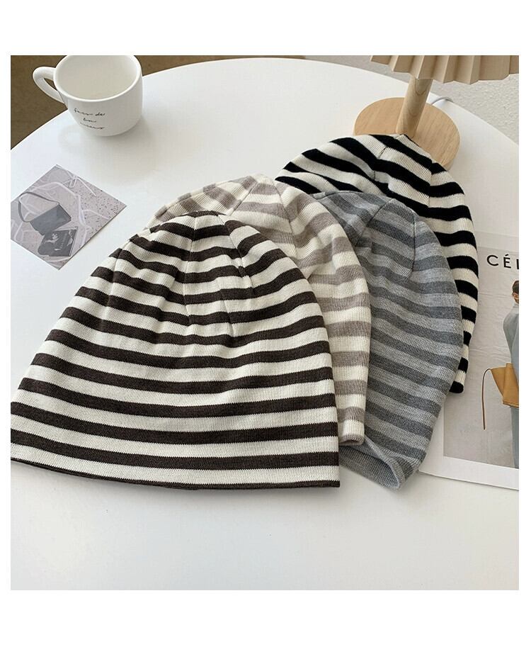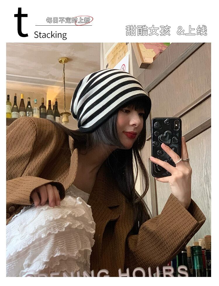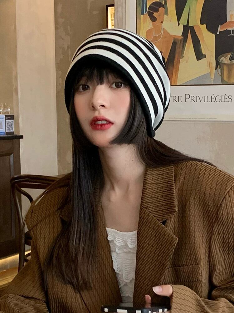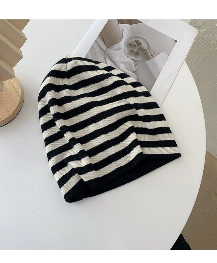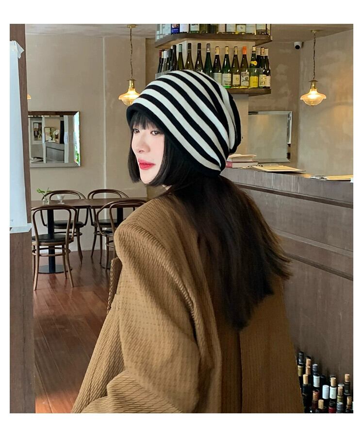 ネットレッドストライプニット帽女性の秋と冬カジュアルオールマッチブラックウールキャップ包頭キャップコールドハット監禁パイル帽子 オータム 秋物 ウィンター 冬物 15dd44358193004