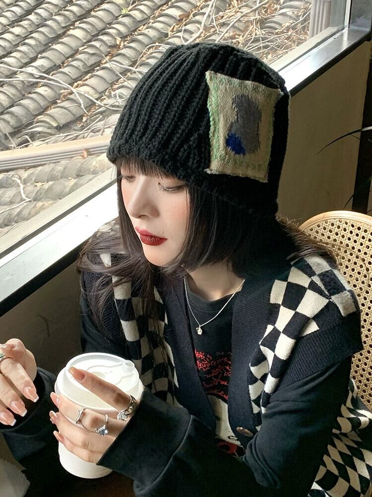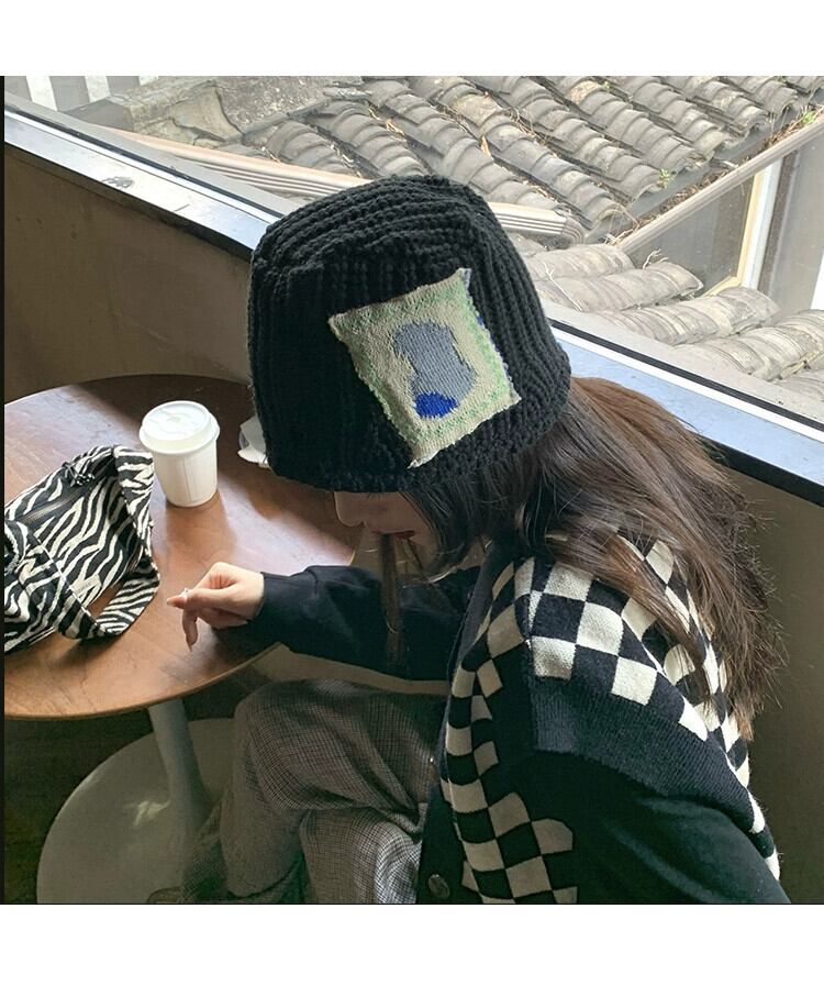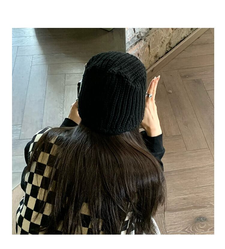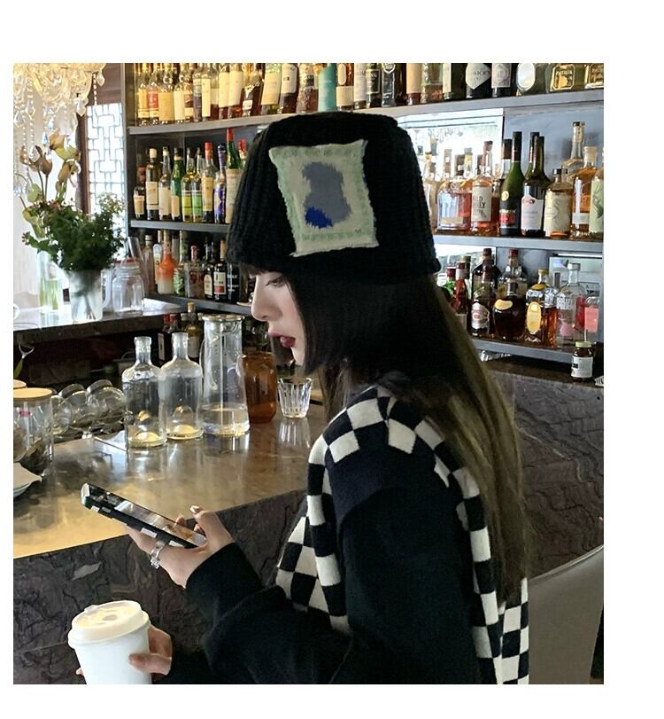 ins パッチのバージョンのウール帽子女性の秋と冬オールマッチ黒ニット帽子顔見せ小さな暖かい耳保護バケットハット ブラック オータム 秋物 ウィンター 冬物 15dd51259666555