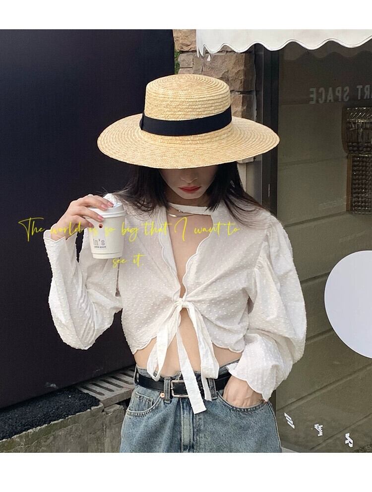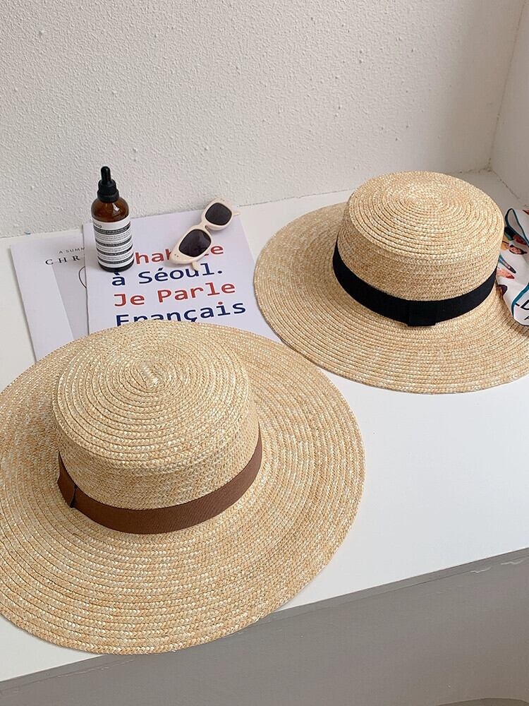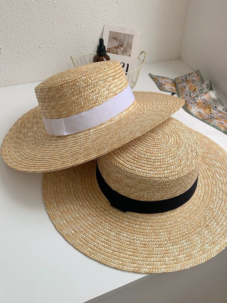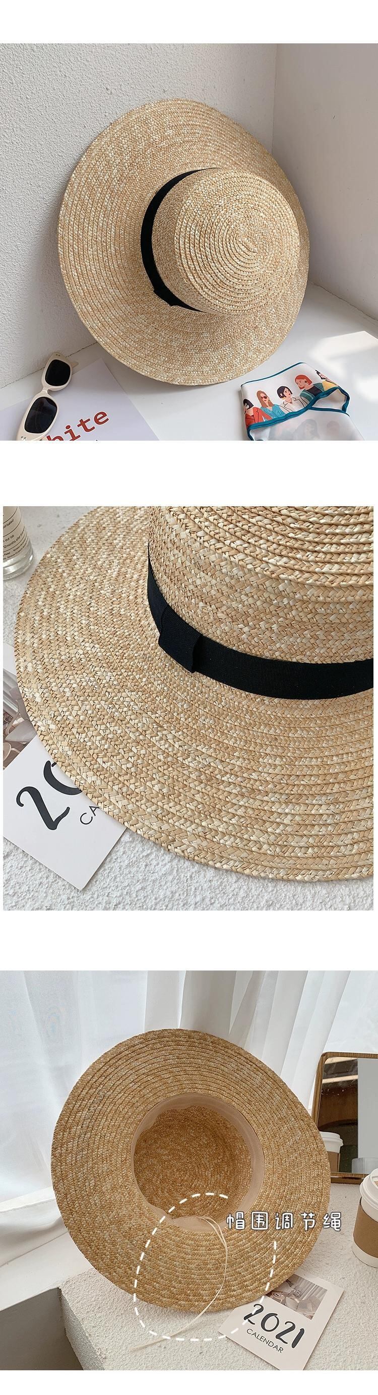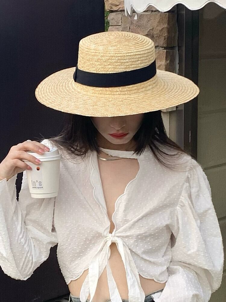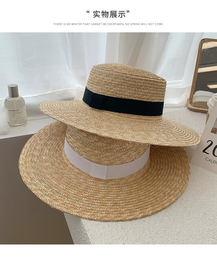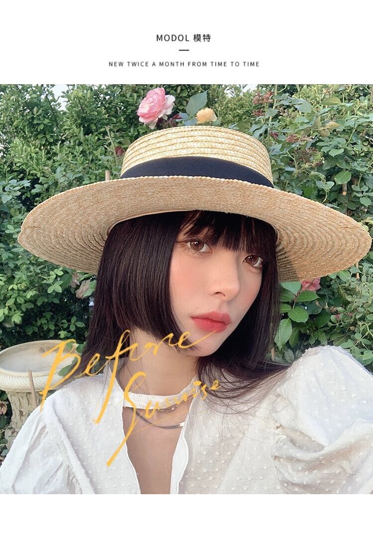 フラットトップハット女性の夏休みビーチラフィア麦わら帽子新しいフランスのビーチハットネットレッドサンシェード英国日焼け止め帽子 サマー 夏物 15dd61596705372