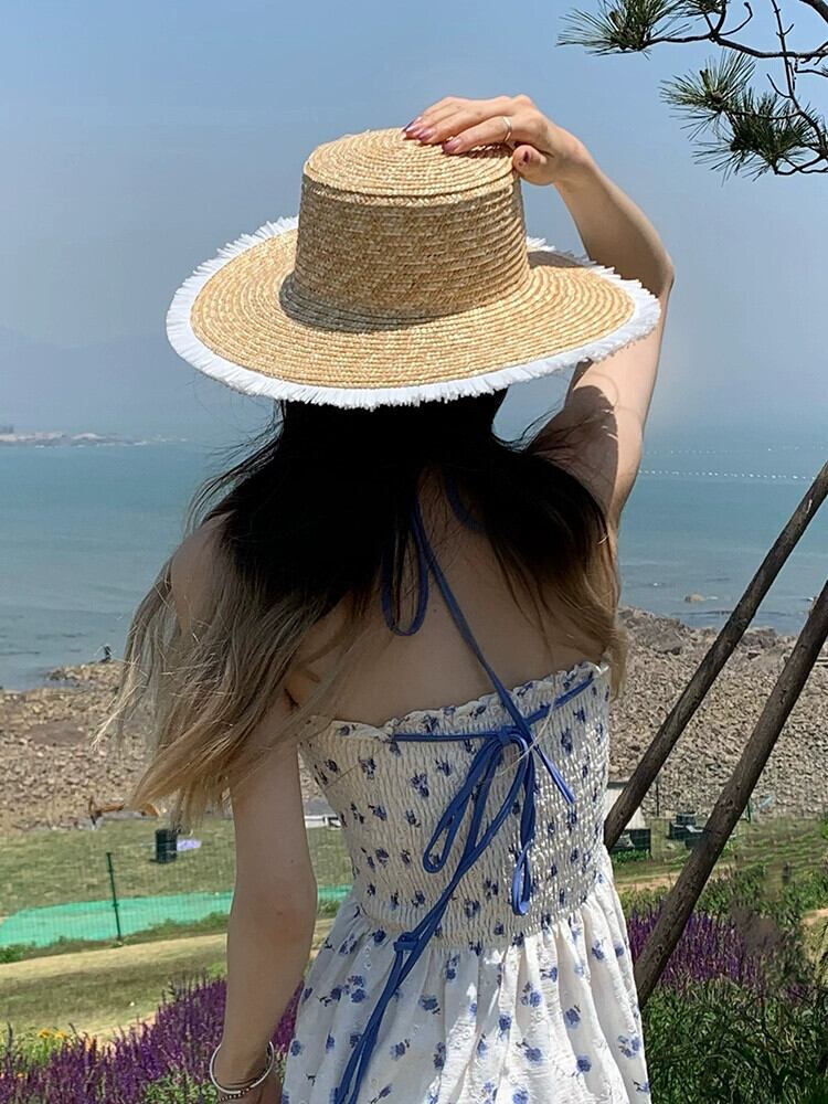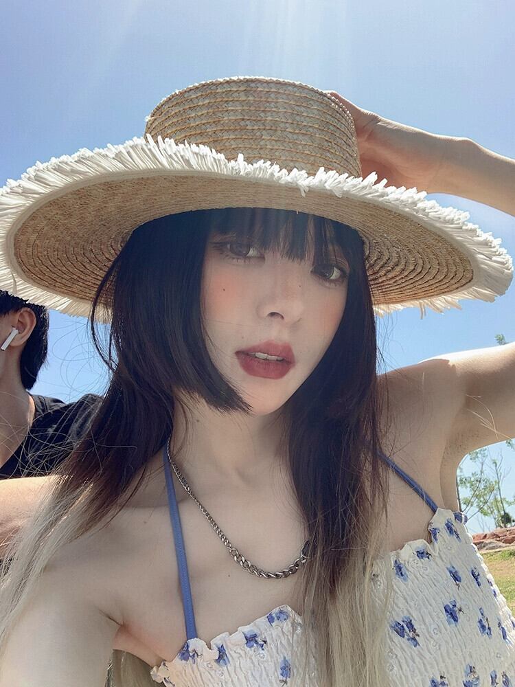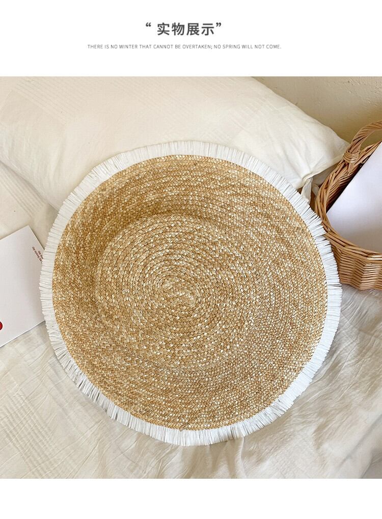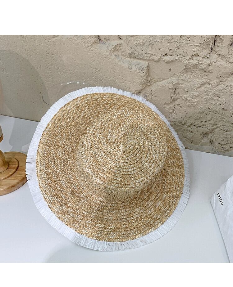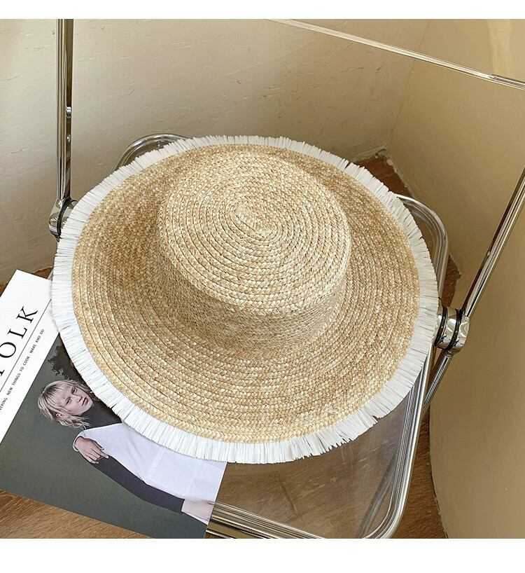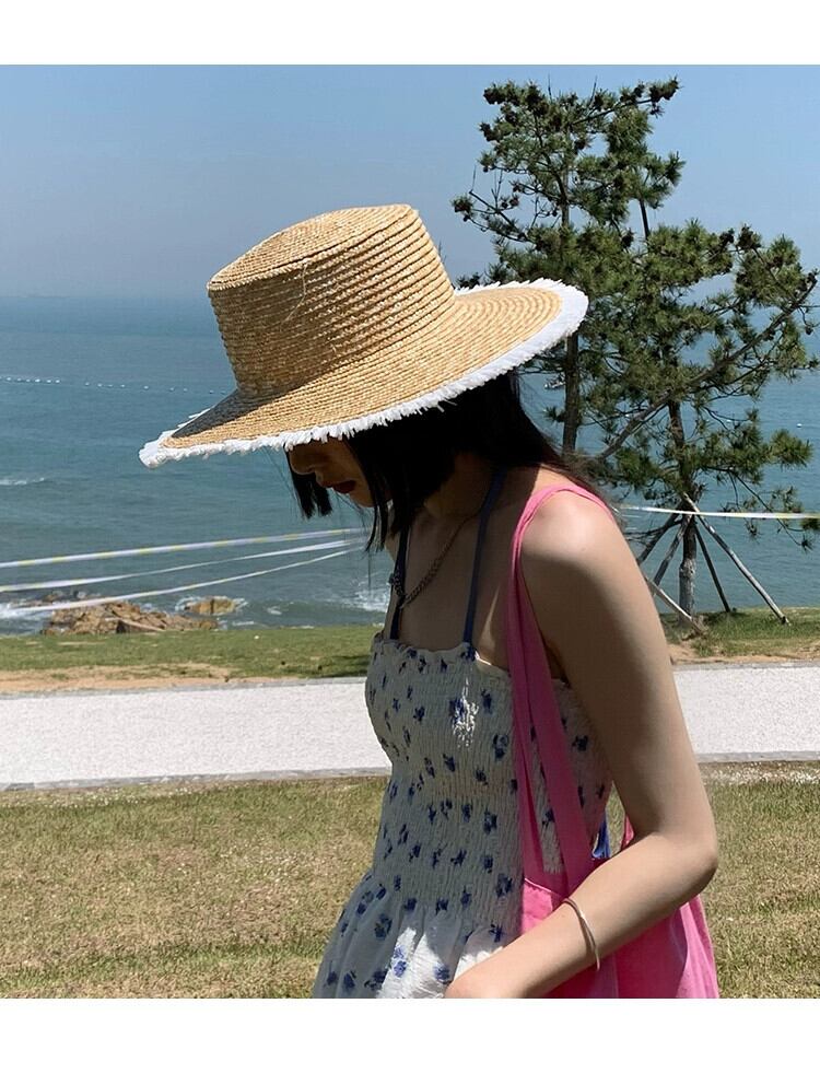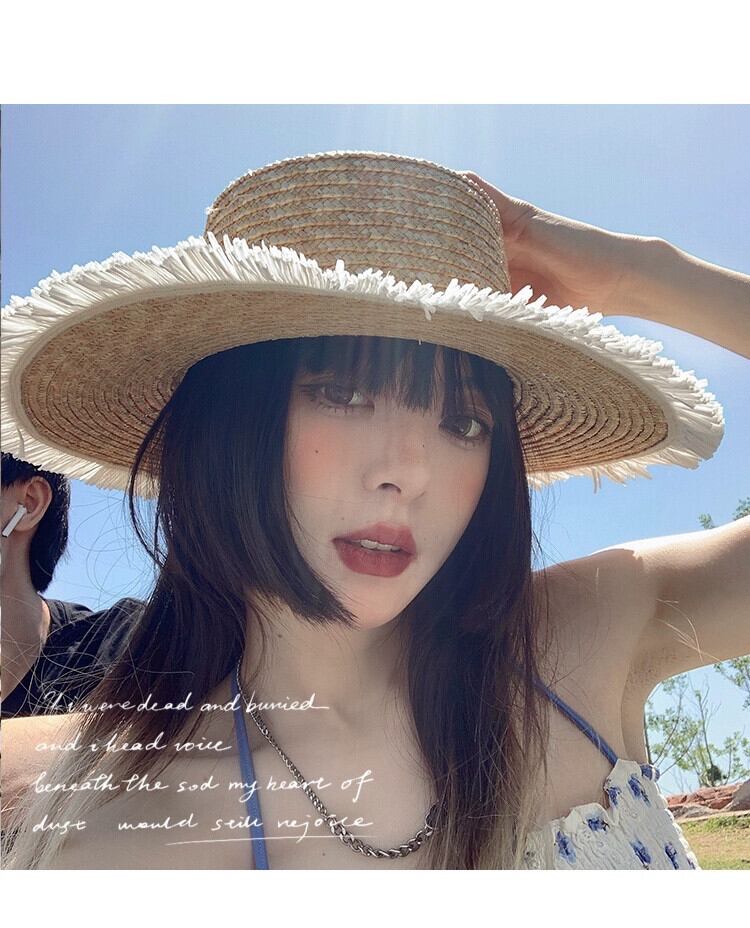 インのバージョンフラットトップラフィア麦わら帽子女性夏野生レトロな海辺の休暇大きな軒日焼け止め太陽の帽子ビーチ帽子 サマー 夏物 15dd39453412019