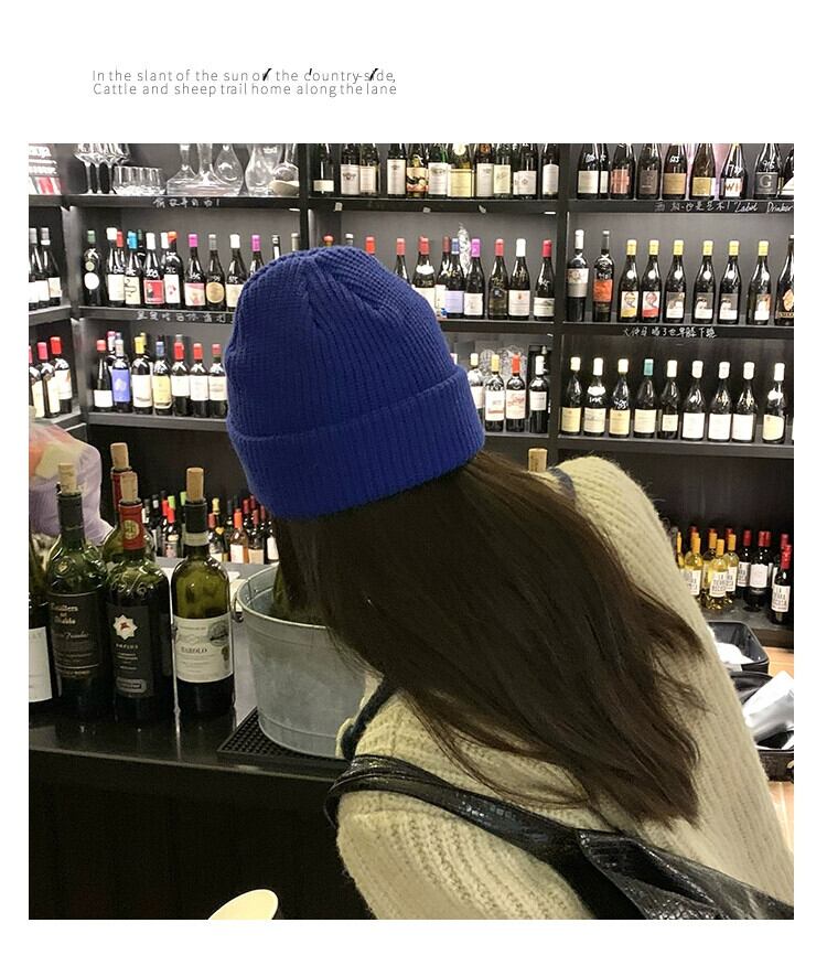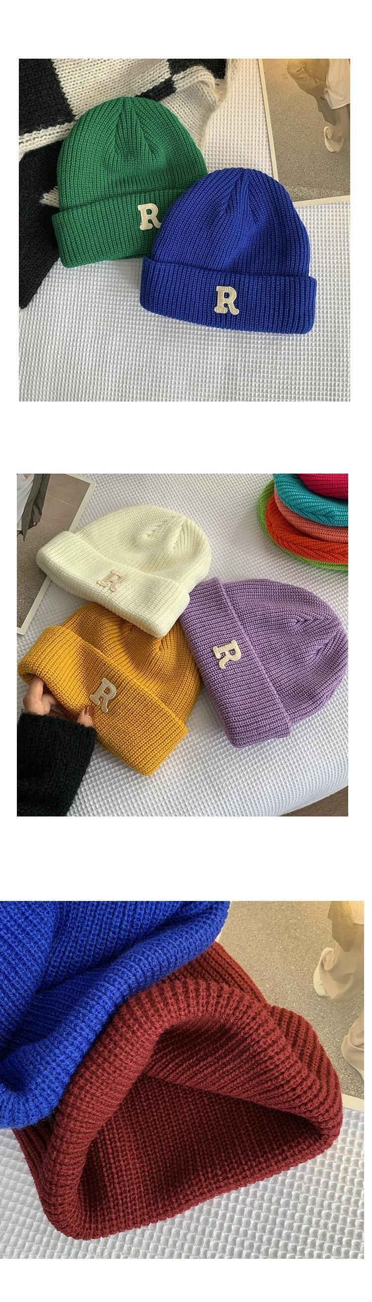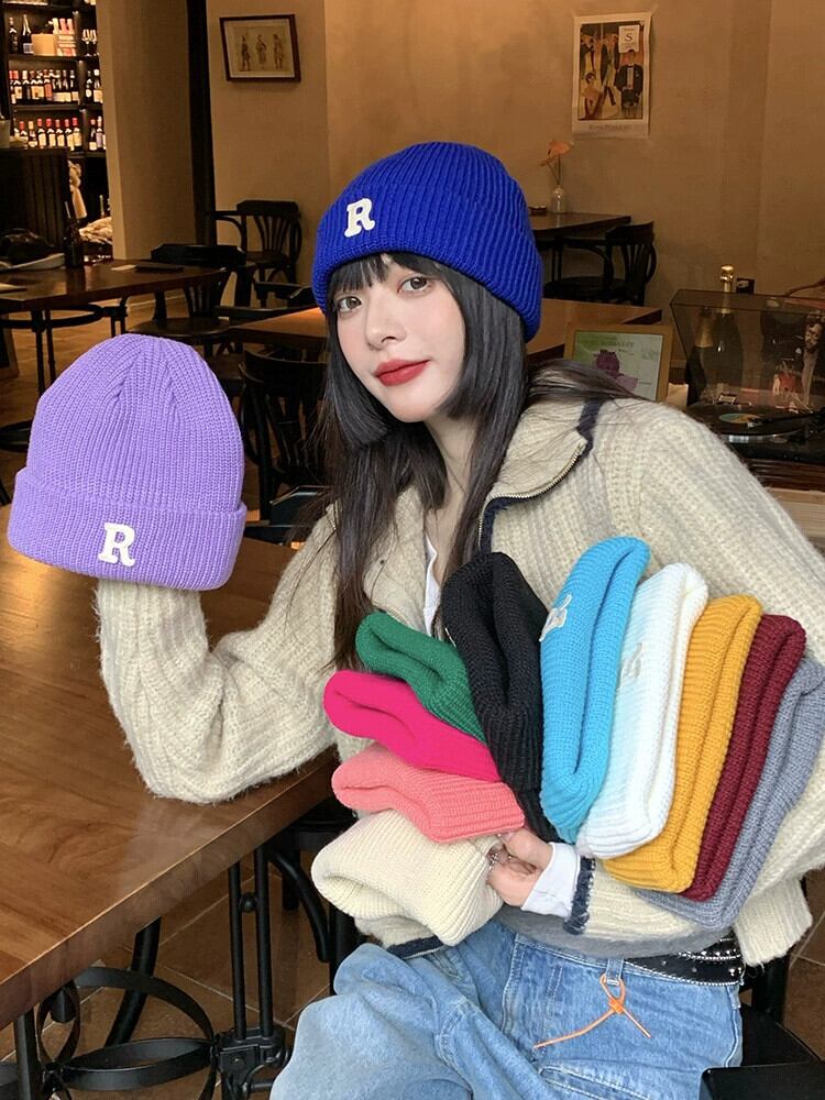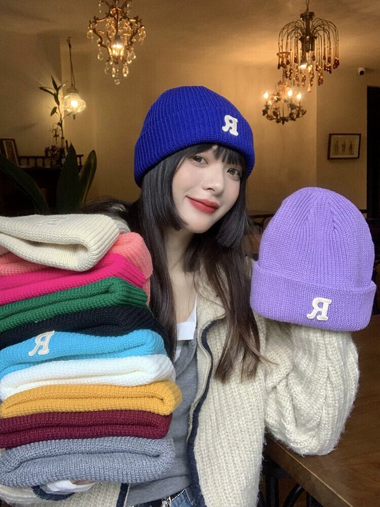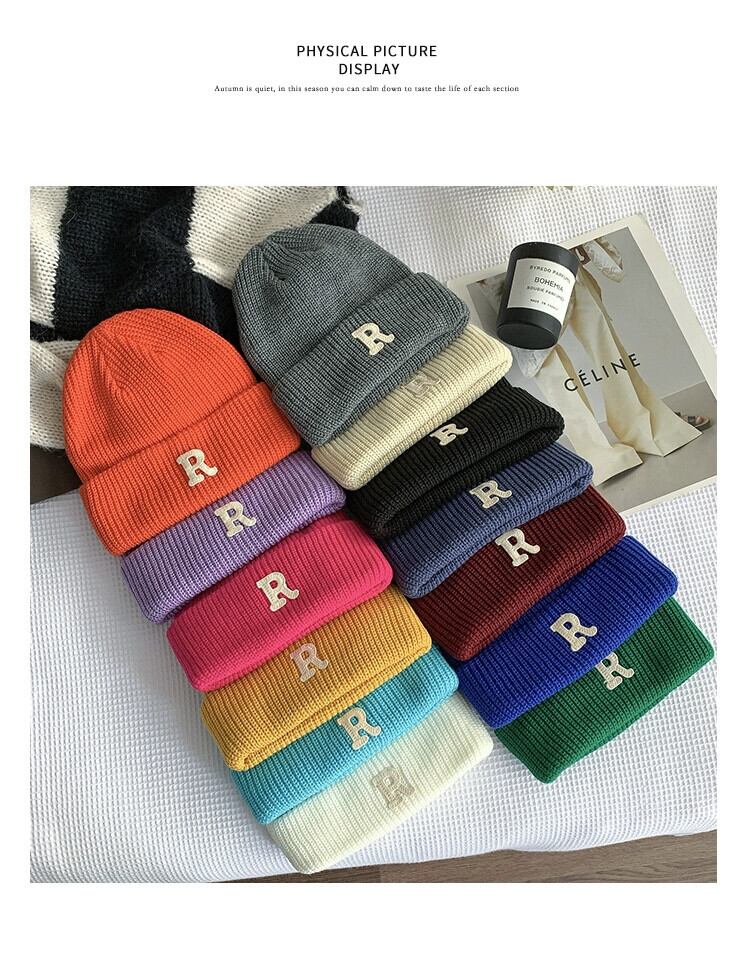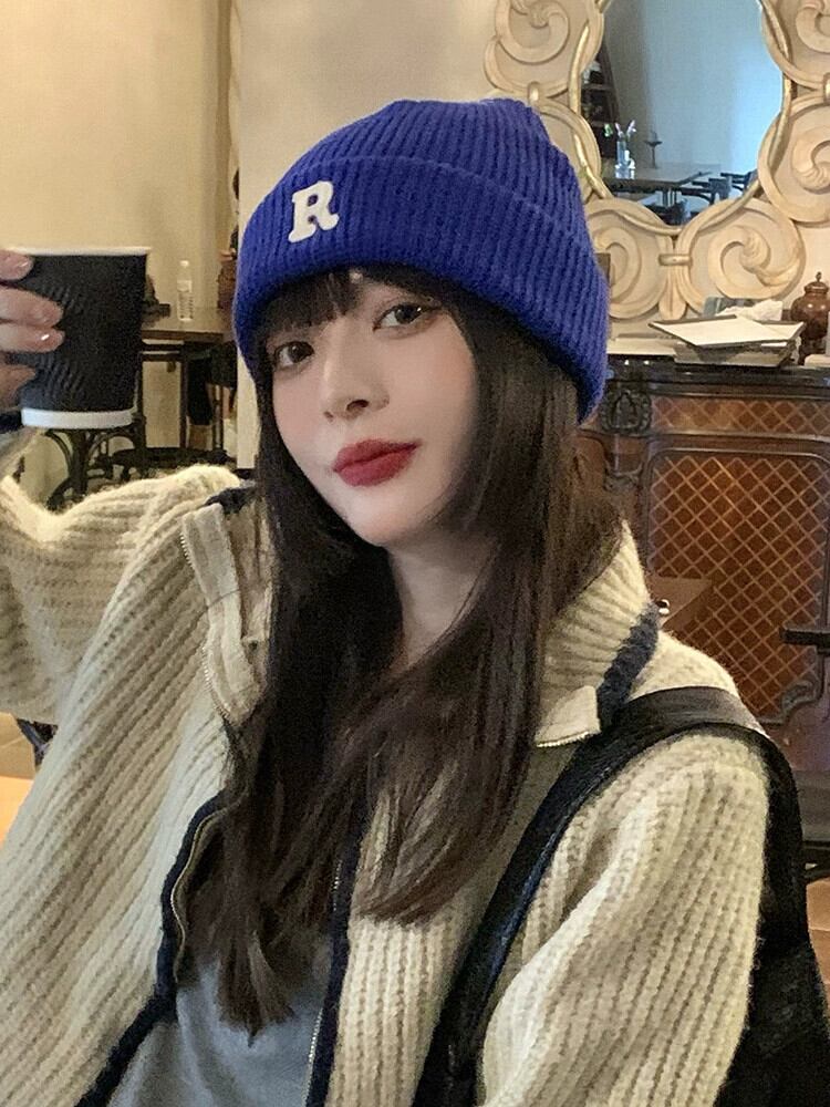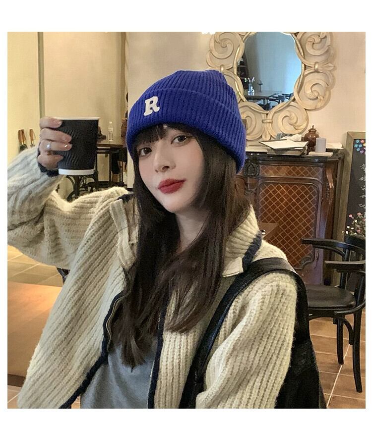 インクライン ブルー R 文字ウール帽子レディース秋冬オールマッチニット帽冬暖かい耳保護防寒帽子メンズ潮 オータム 秋物 ウィンター 冬物 15dd72937101945