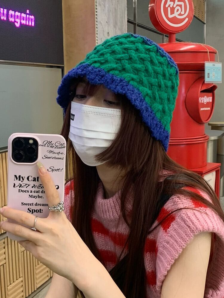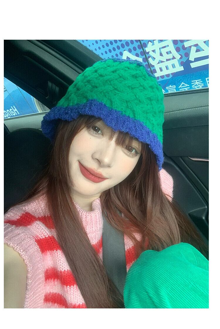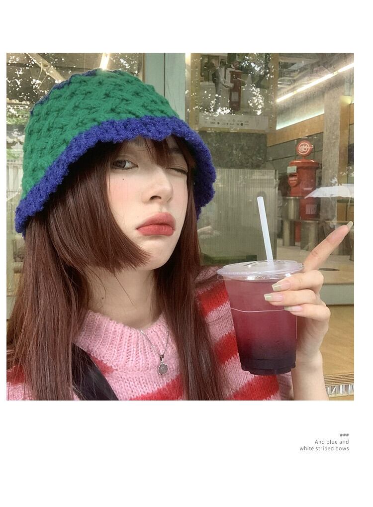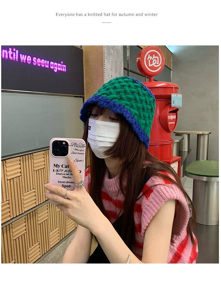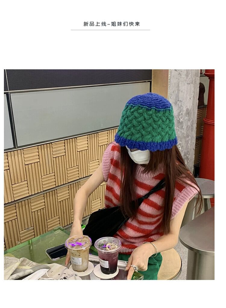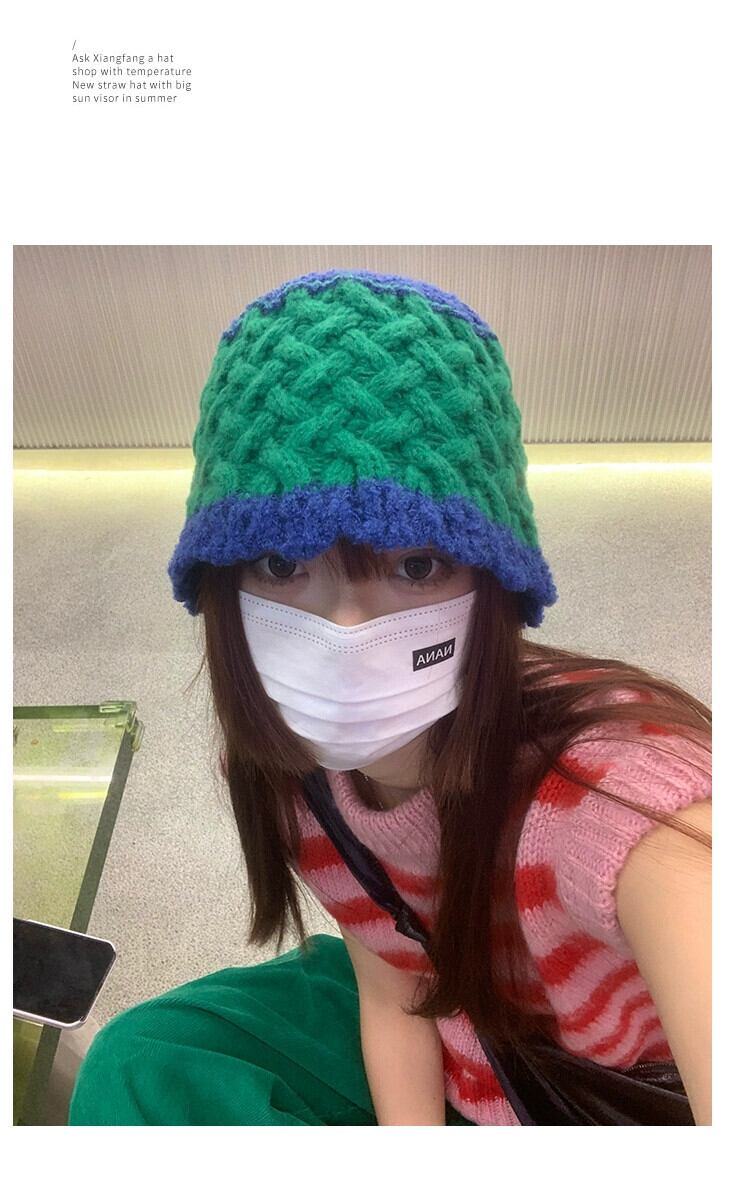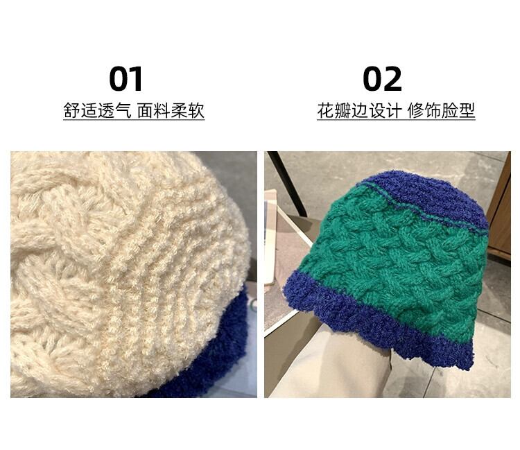 秋と冬の新しいスプライシングカラーコントラストニットバケットハット女性ファッションオールマッチショーフェイス小さな暖かいウール盆地帽子 オータム 秋物 ウィンター 冬物 15dd25043423110
