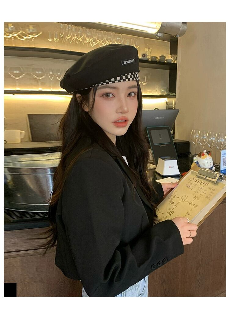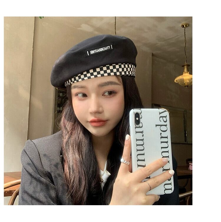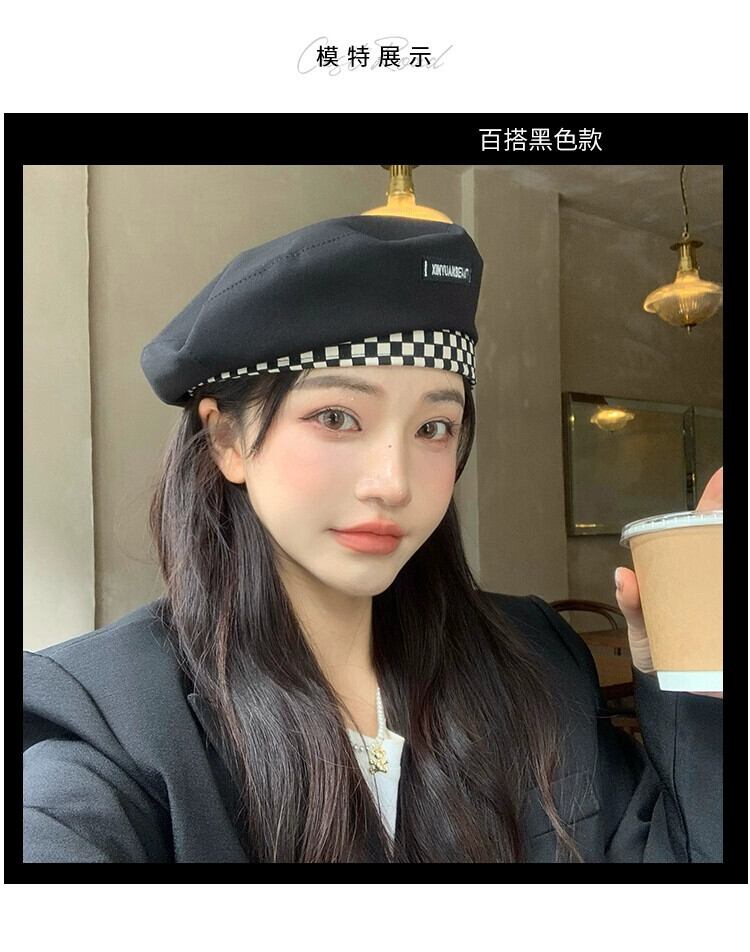 ese チェック柄文字黒ベレー帽女性の春薄セクションファッションオールマッチレトロ画家の帽子旅行人格夏 ブラック スプリング 春物 サマー 夏物 ベレット ヘアアクセサリー 15dd94915098079
