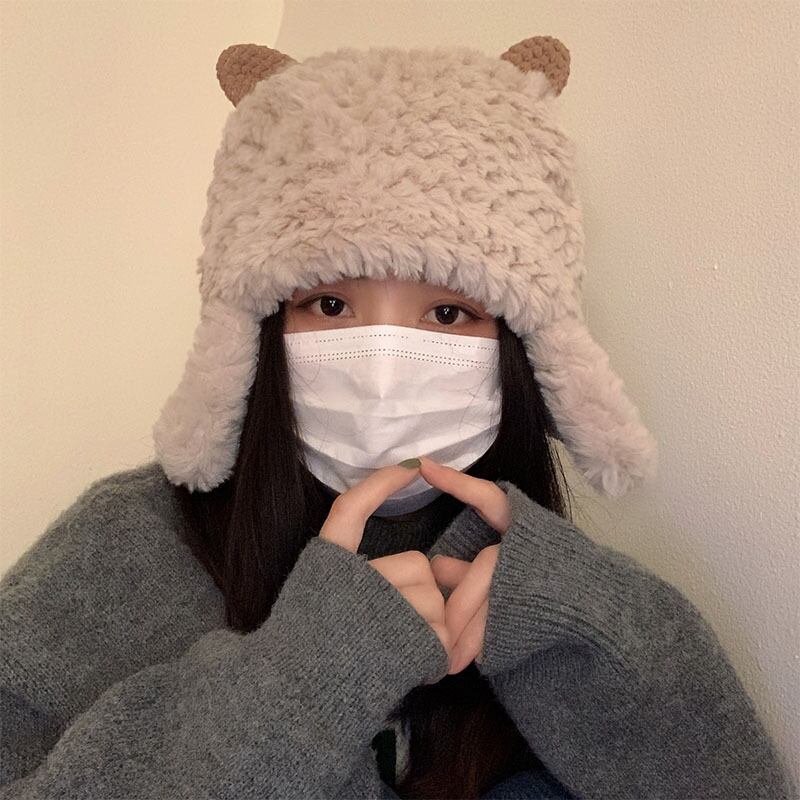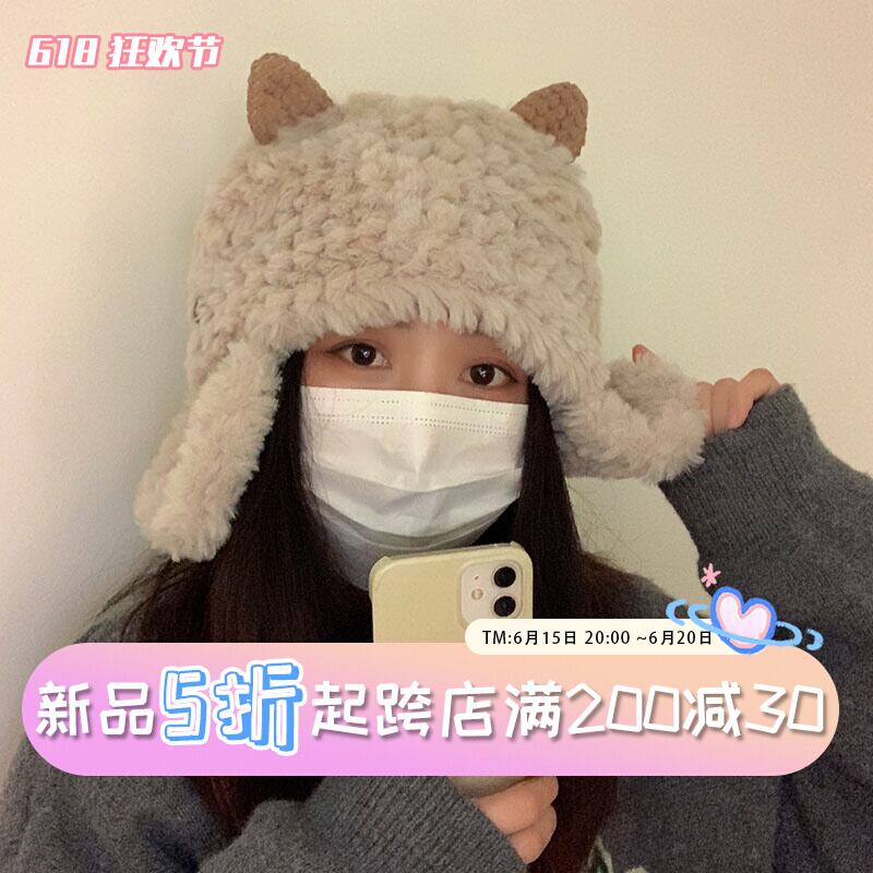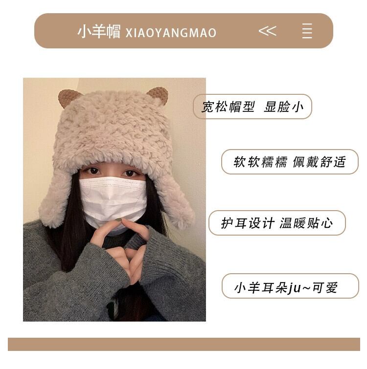 子羊の帽子の女性の秋と冬のかわいい豪華な雷峰帽子自転車に乗って顔を見せる小さな厚く暖かい耳の保護帽子プルオーバー帽子 大人ガーリー スウィート キュート カジュアル オータム 秋物 ウィンター 冬物 15dd68159224906