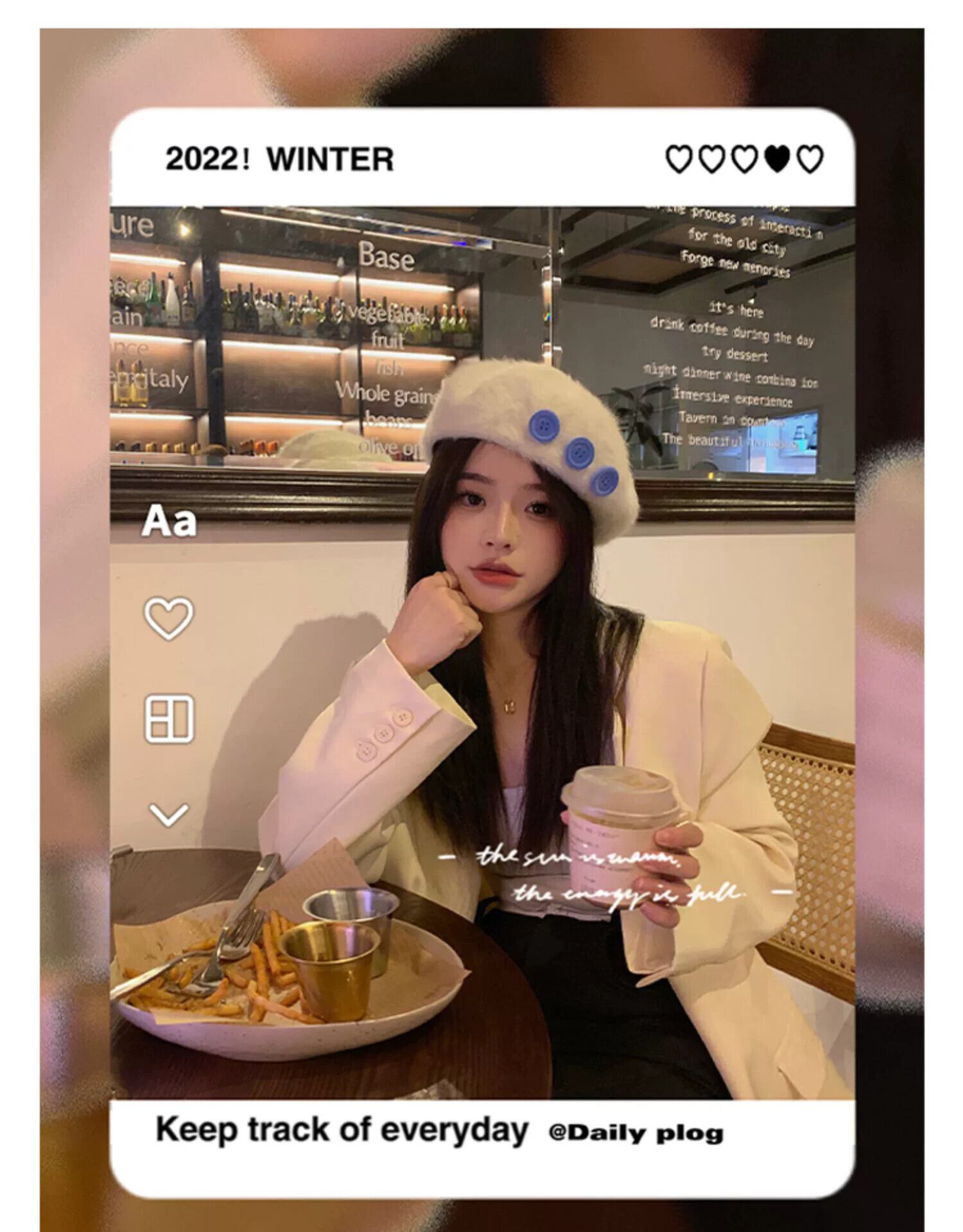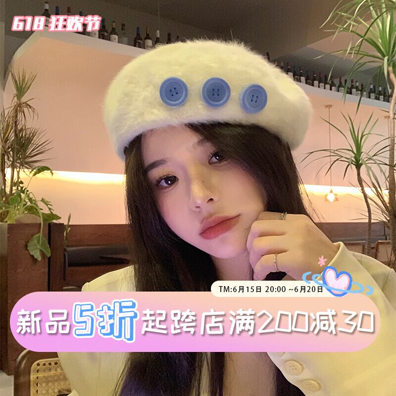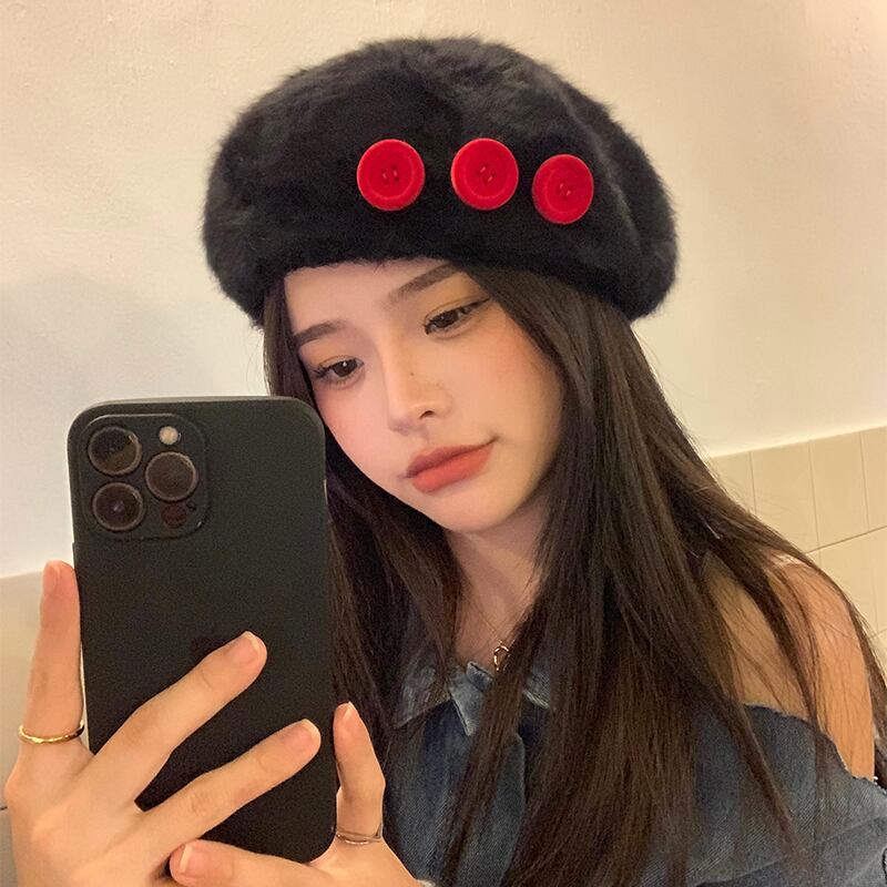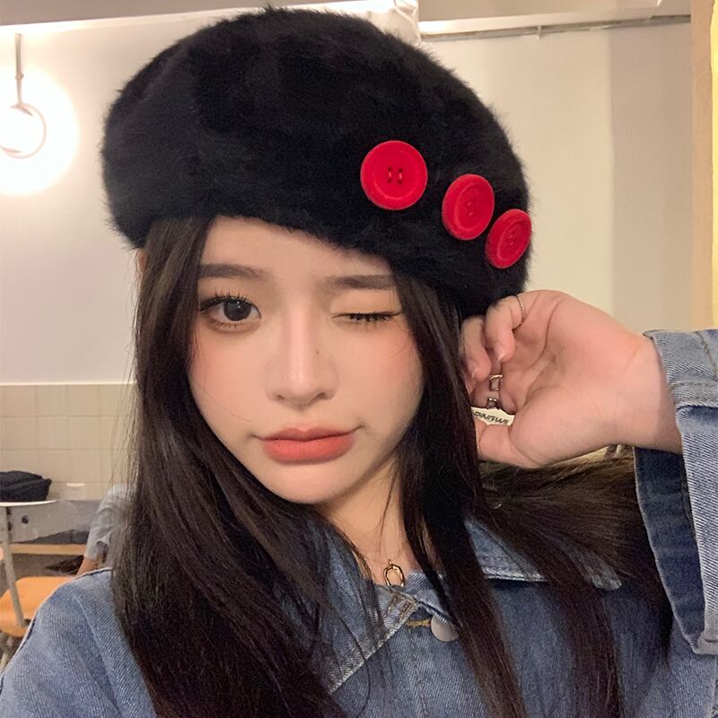 ウサギの毛皮の帽子女性冬ネット赤白ベレー帽ショー顔リトルイングランド野生潮ボタン芽画家の帽子 ホワイト レッド ウィンター 冬物 ベレット ヘアアクセサリー ヨーロピアン 15dd10955739571