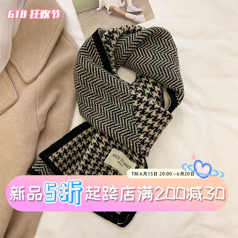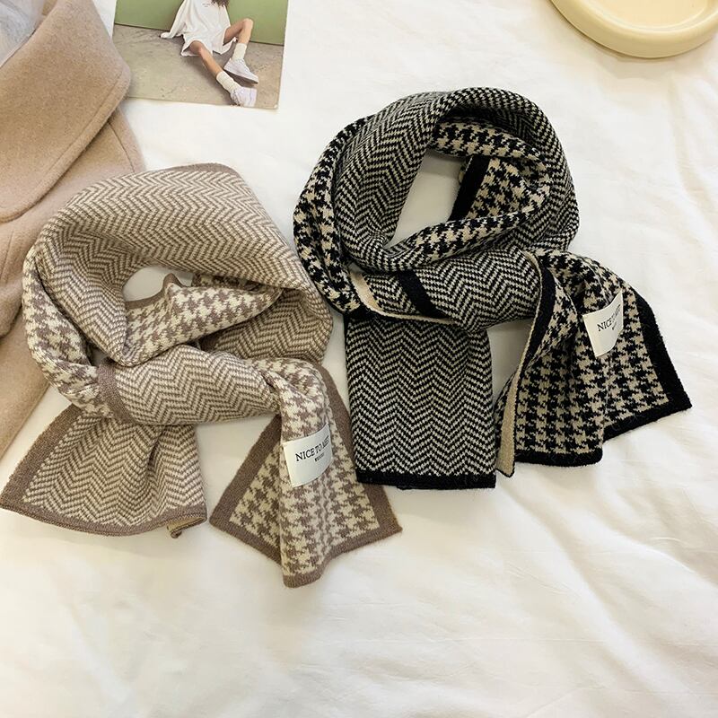 千鳥格子チェック柄編みスプライシングショートスカーフレディース秋冬高級感両面保温防寒厚みのあるスカーフ潮 オータム 秋物 ウィンター 冬物 15dd97073682286