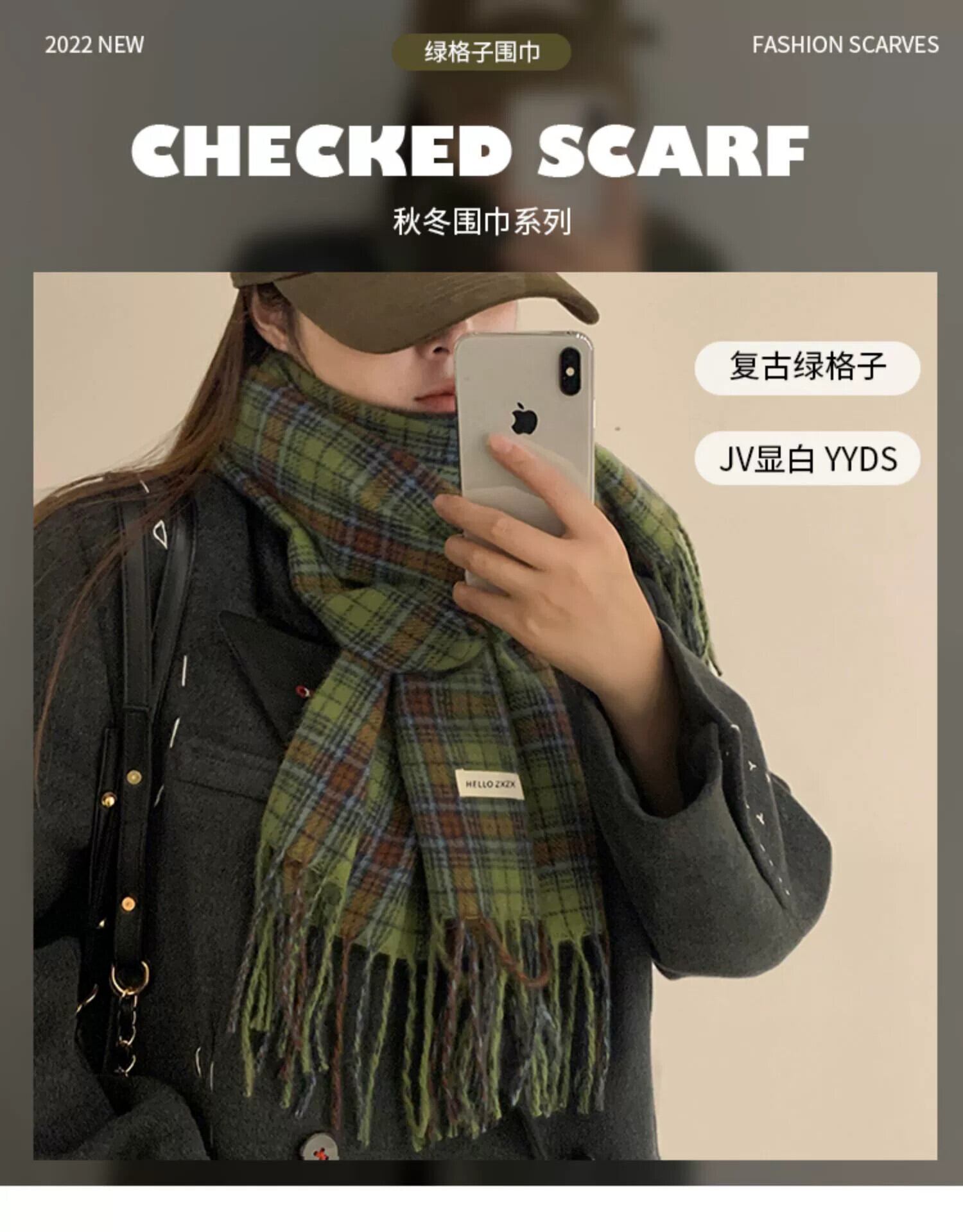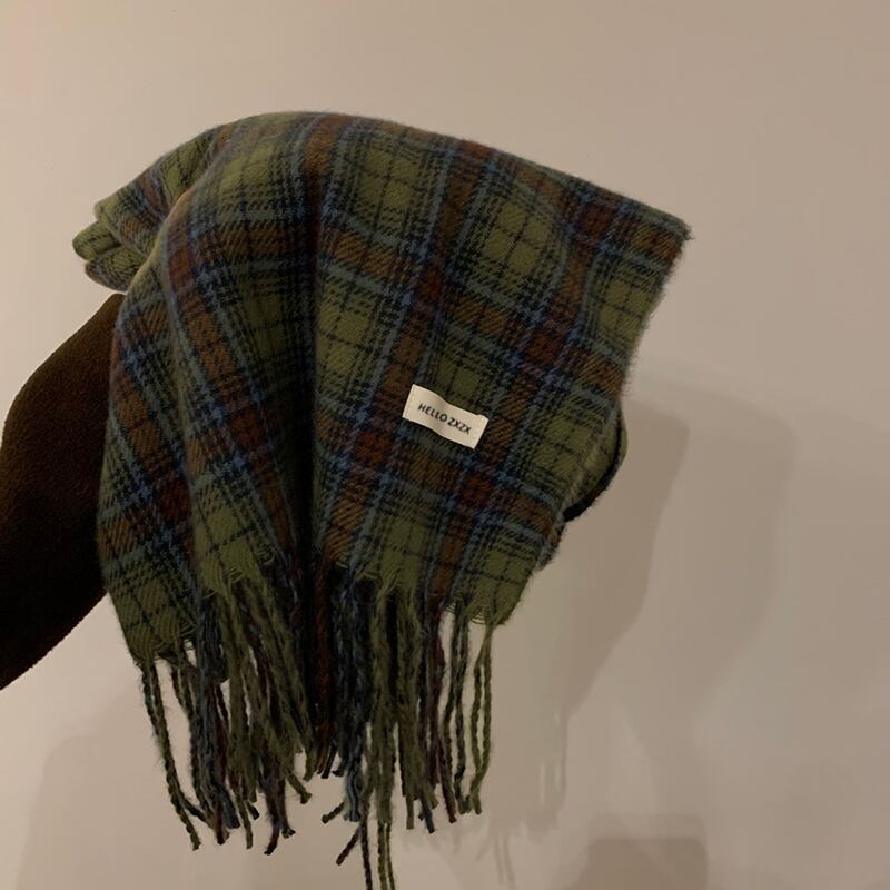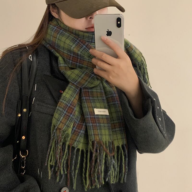 レトログリーンチェック柄スカーフ女性の秋と冬の新しいオールマッチパーソナライズされたハイエンドの厚く暖かいショールスカーフ オータム 秋物 ウィンター 冬物 15dd55202750023