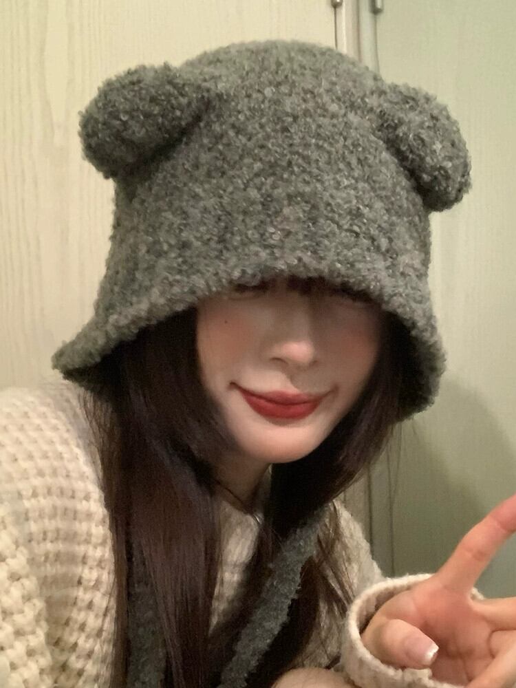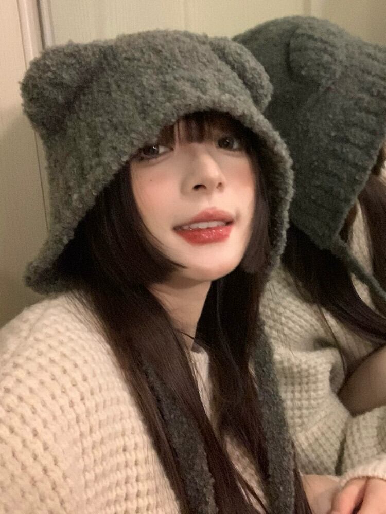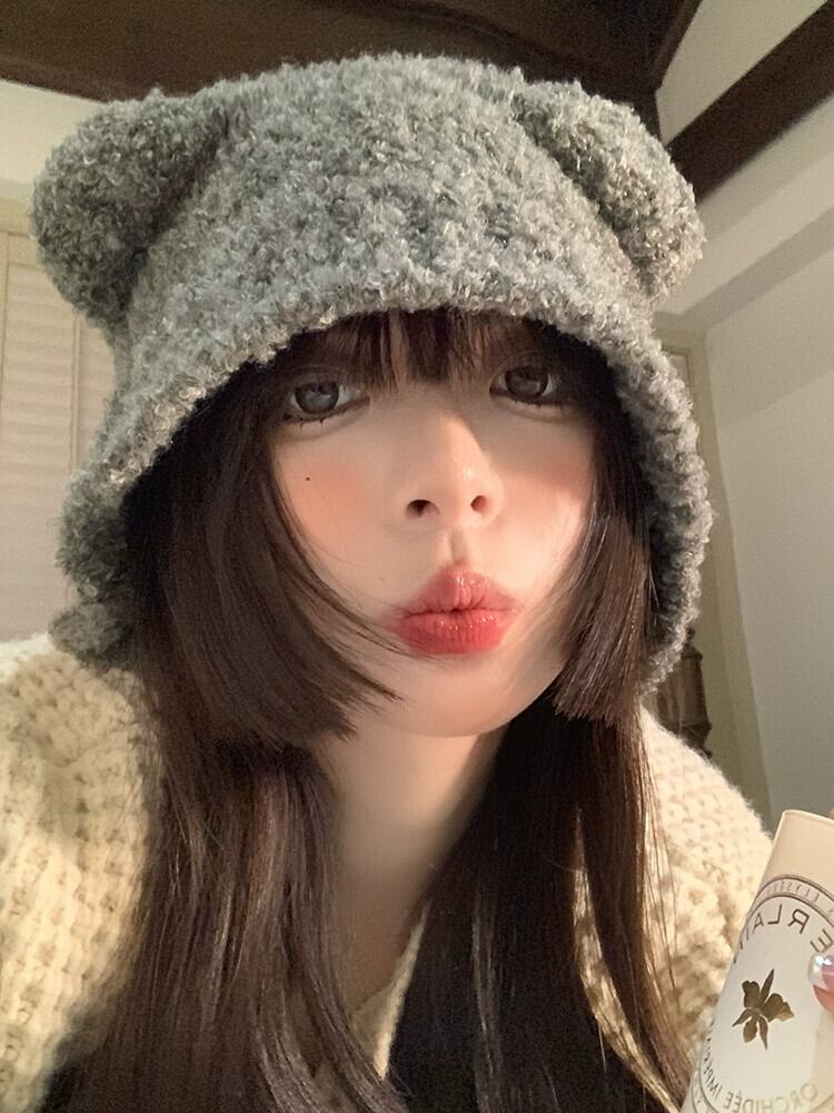 かわいいクマの帽子の女性の冬バージョンのイン暖かいグレー耳保護帽子秋と冬のニットウール帽子大きな頭囲 大人ガーリー スウィート キュート カジュアル オータム 秋物 ウィンター 冬物 15dd17990242812