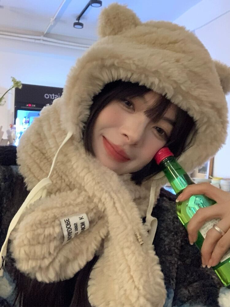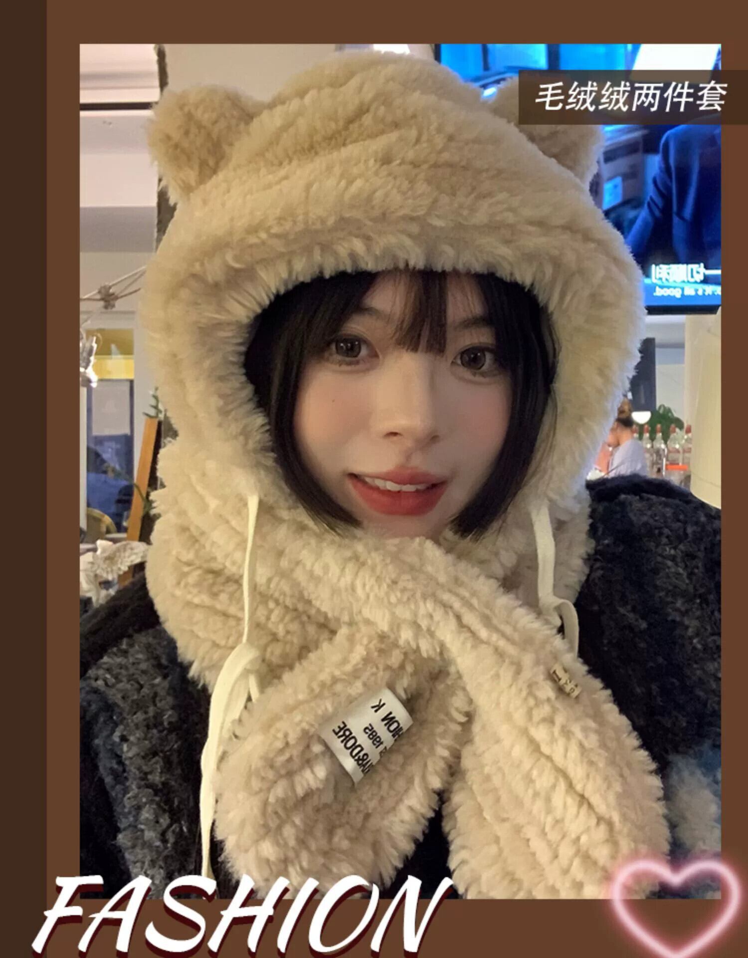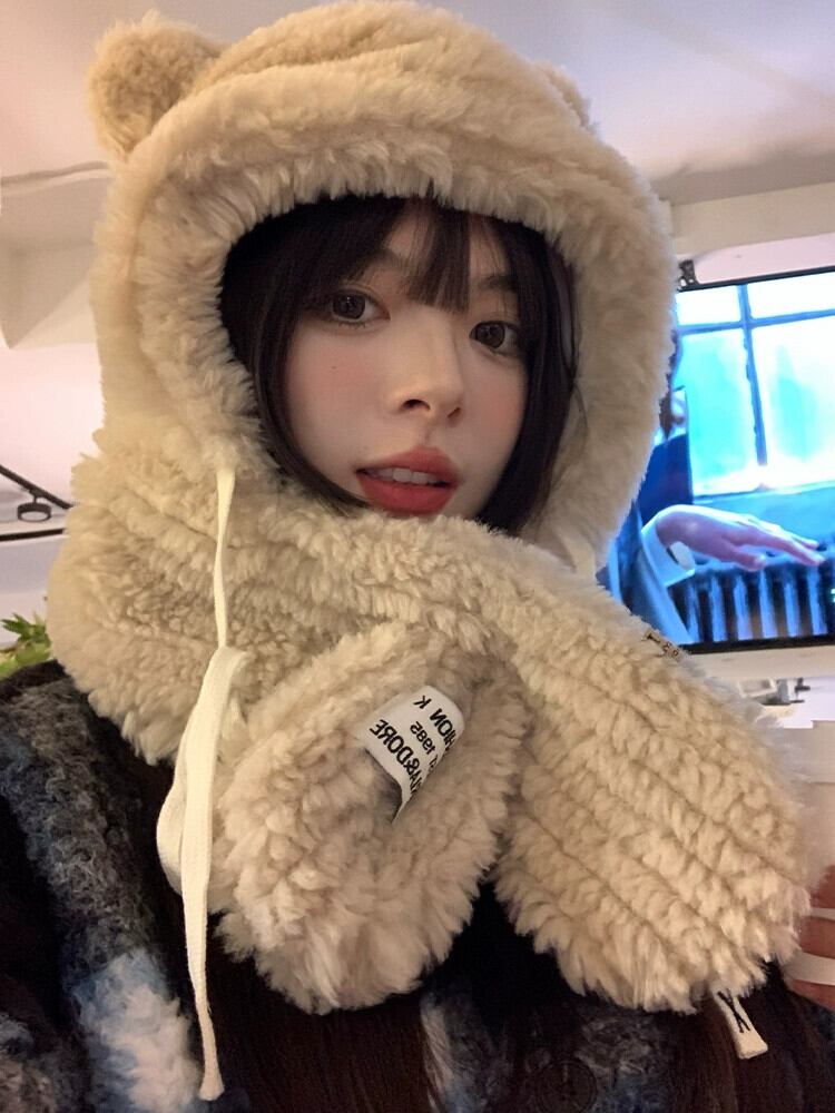 帽子スカーフ 1 女性の秋と冬かわいいクマぬいぐるみ耳保護冬厚く暖かいラムウールスカーフトレンディな 大人ガーリー スウィート キュート カジュアル オータム 秋物 ウィンター 冬物 15dd94733764293