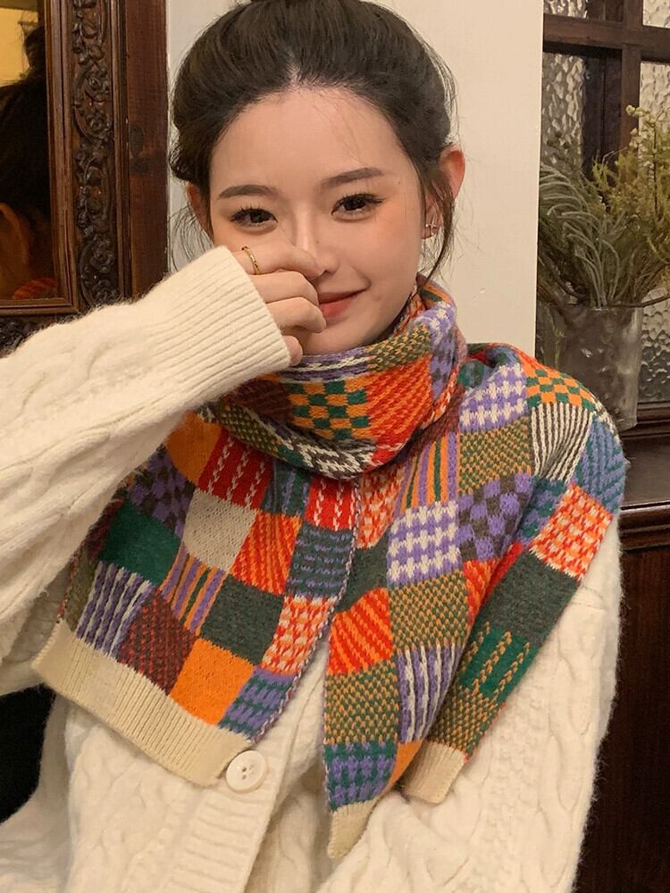 これらの文学と芸術のカラーコントラストチェック柄ニットスカーフ女性の秋と冬バージョンオールマッチファッション冬厚く暖かい小さなスカーフ オータム 秋物 ウィンター 冬物 15dd98203100525