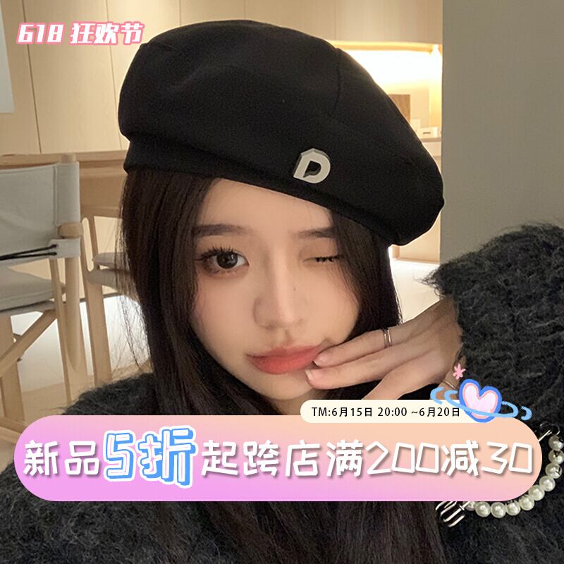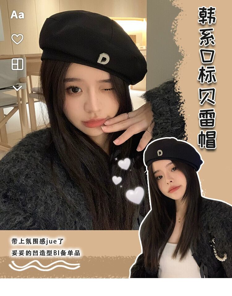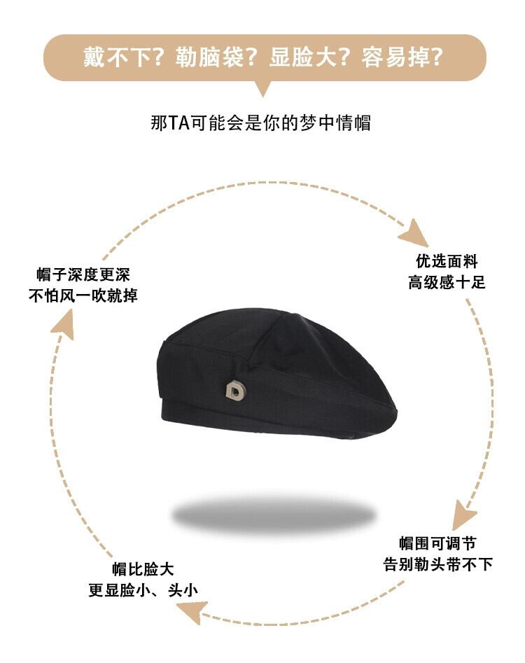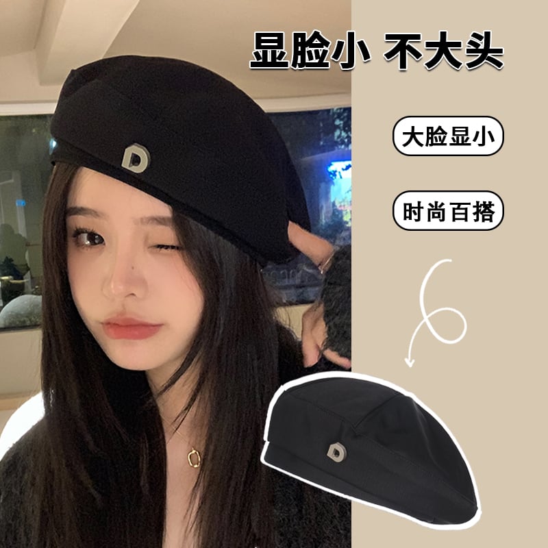 インネットレッド 2023 新しいレターベレー帽レディース黒八角帽子ニッチデザインセンスフェイス小さなアーティスト帽子 ブラック ベレット ヘアアクセサリー 15dd47337393818