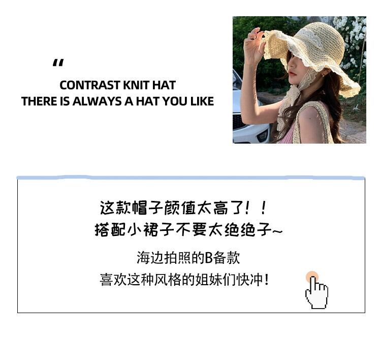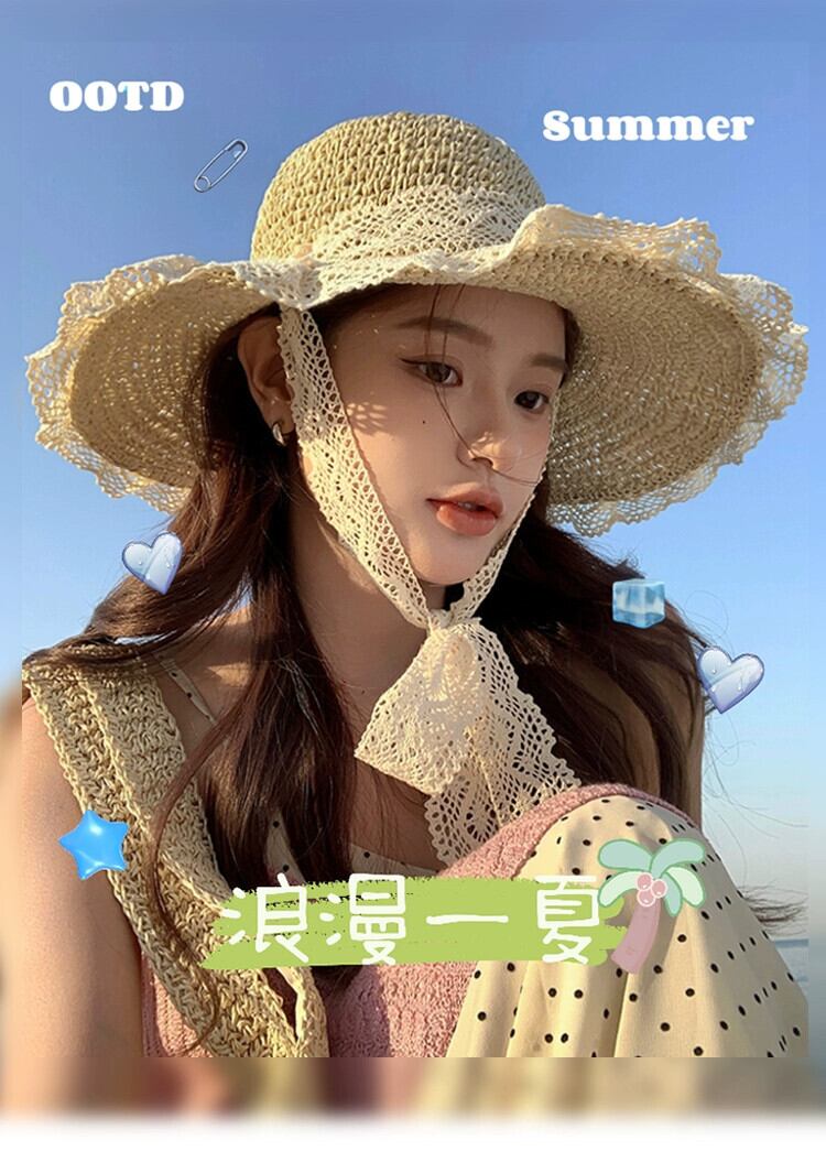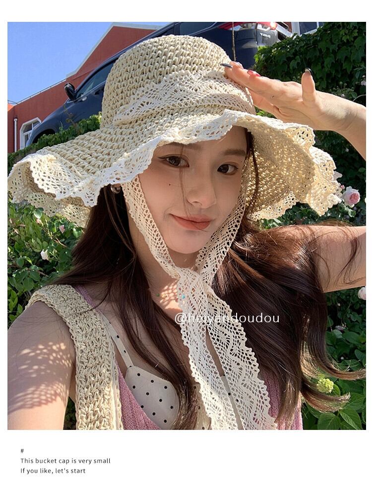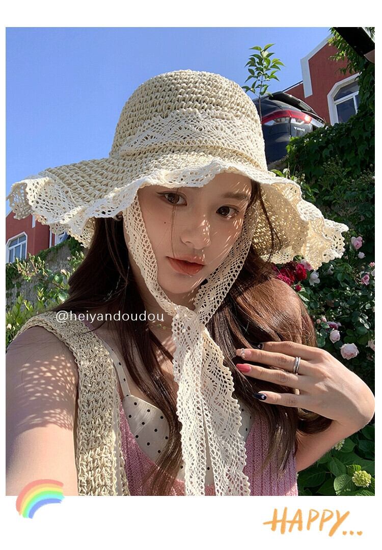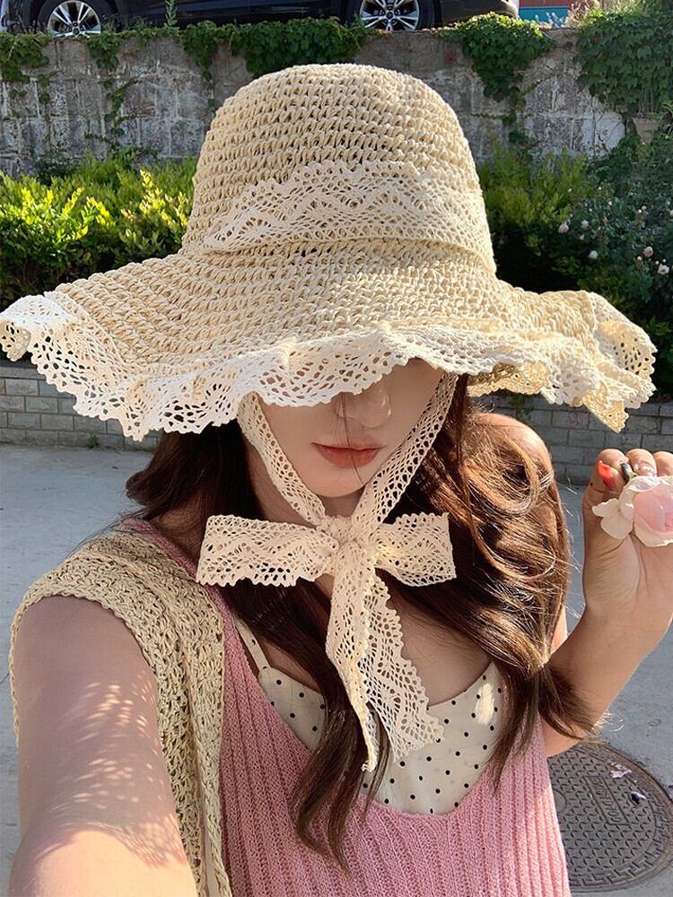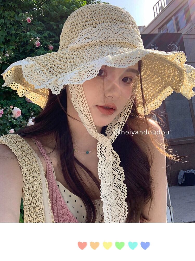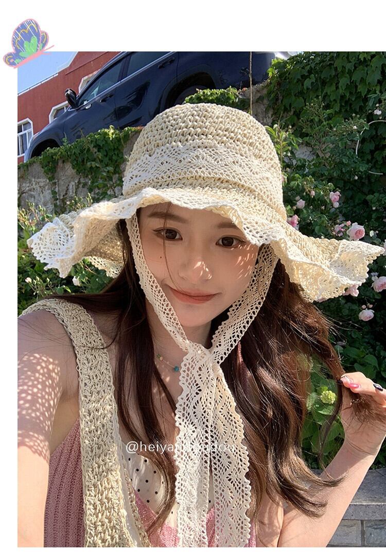 麦わら帽子インネクタイ中空麦わら帽子女性の夏の旅行日焼け止めビーチビーチ太陽の帽子レースエッジ太陽の帽子 サマー 夏物 15dd577004499