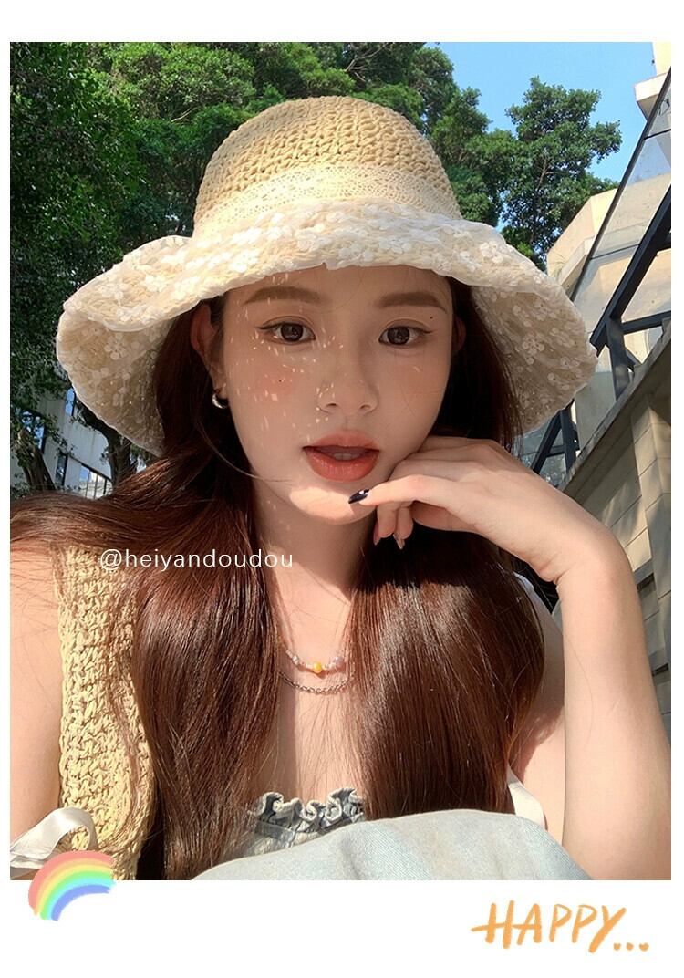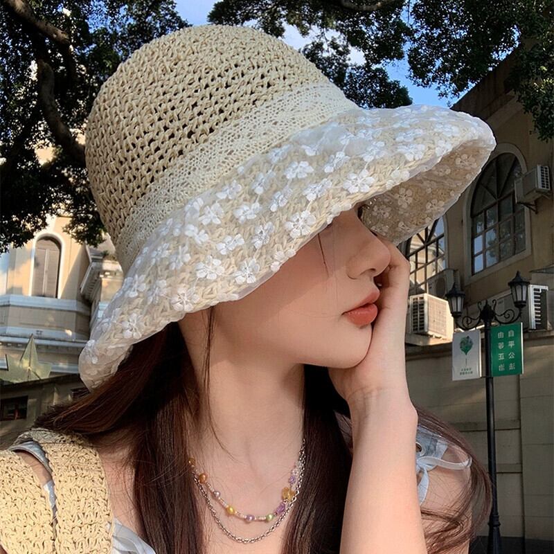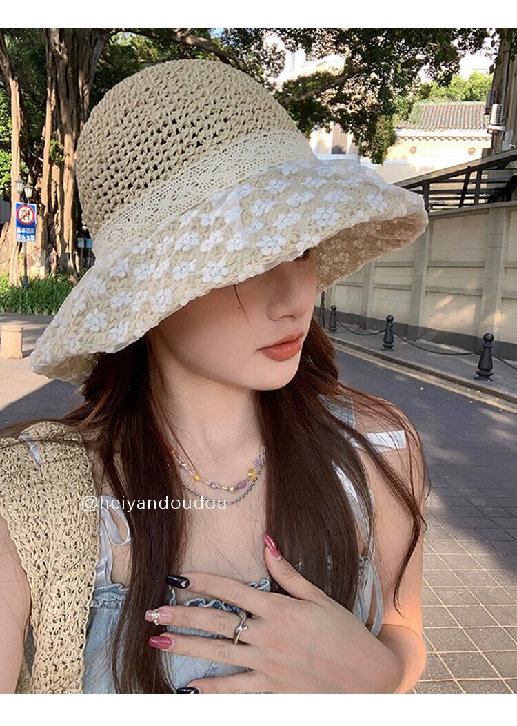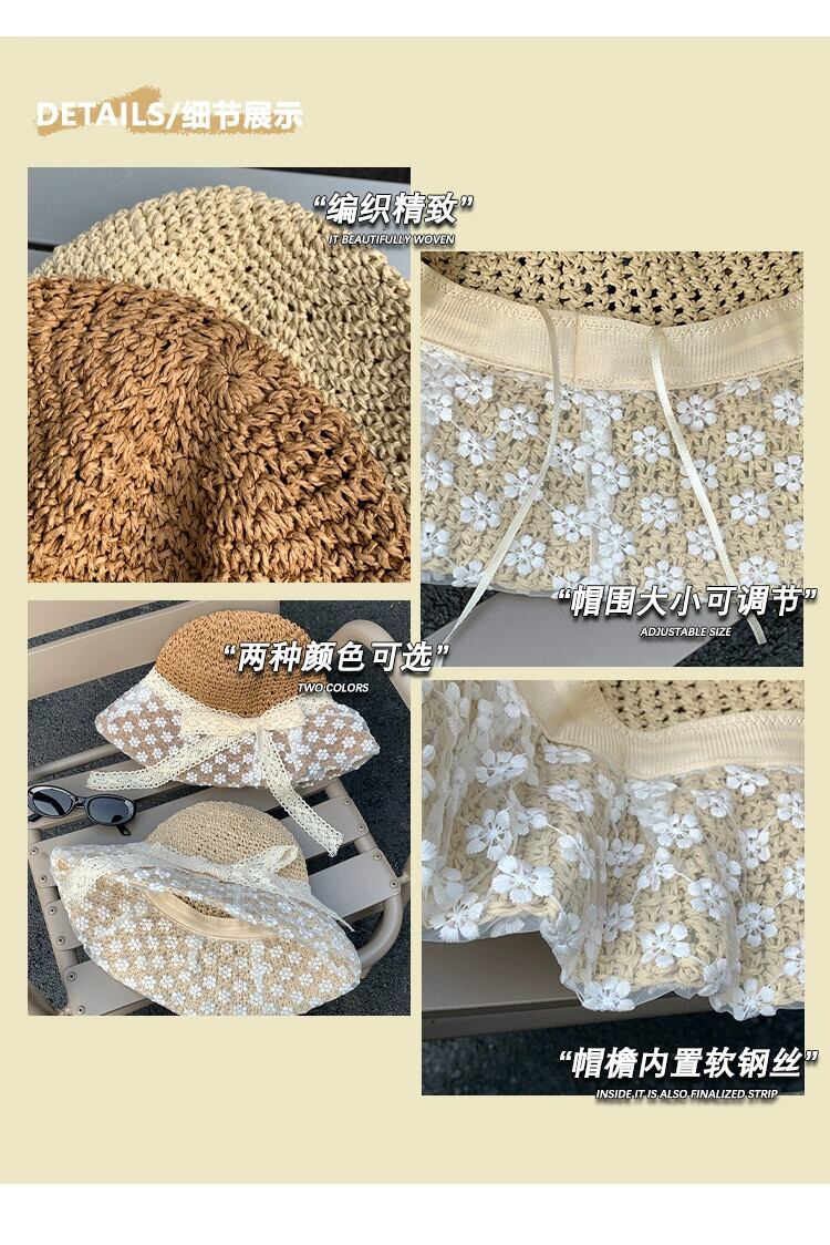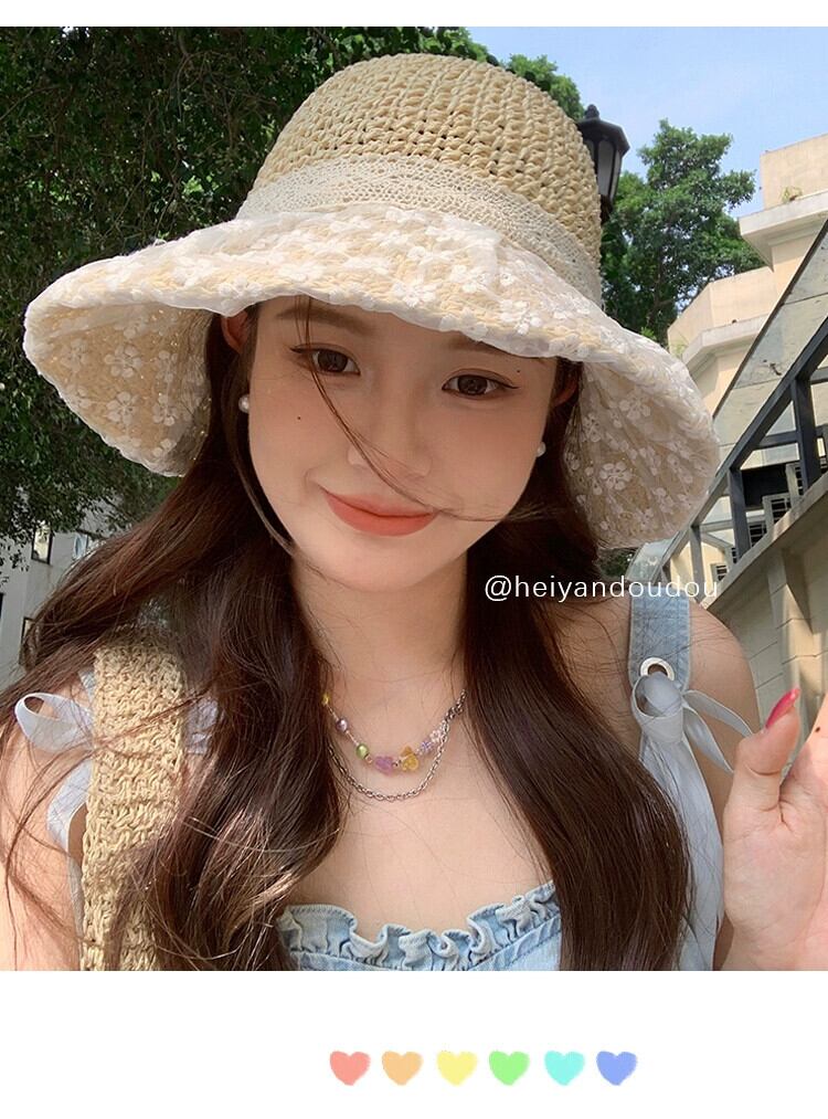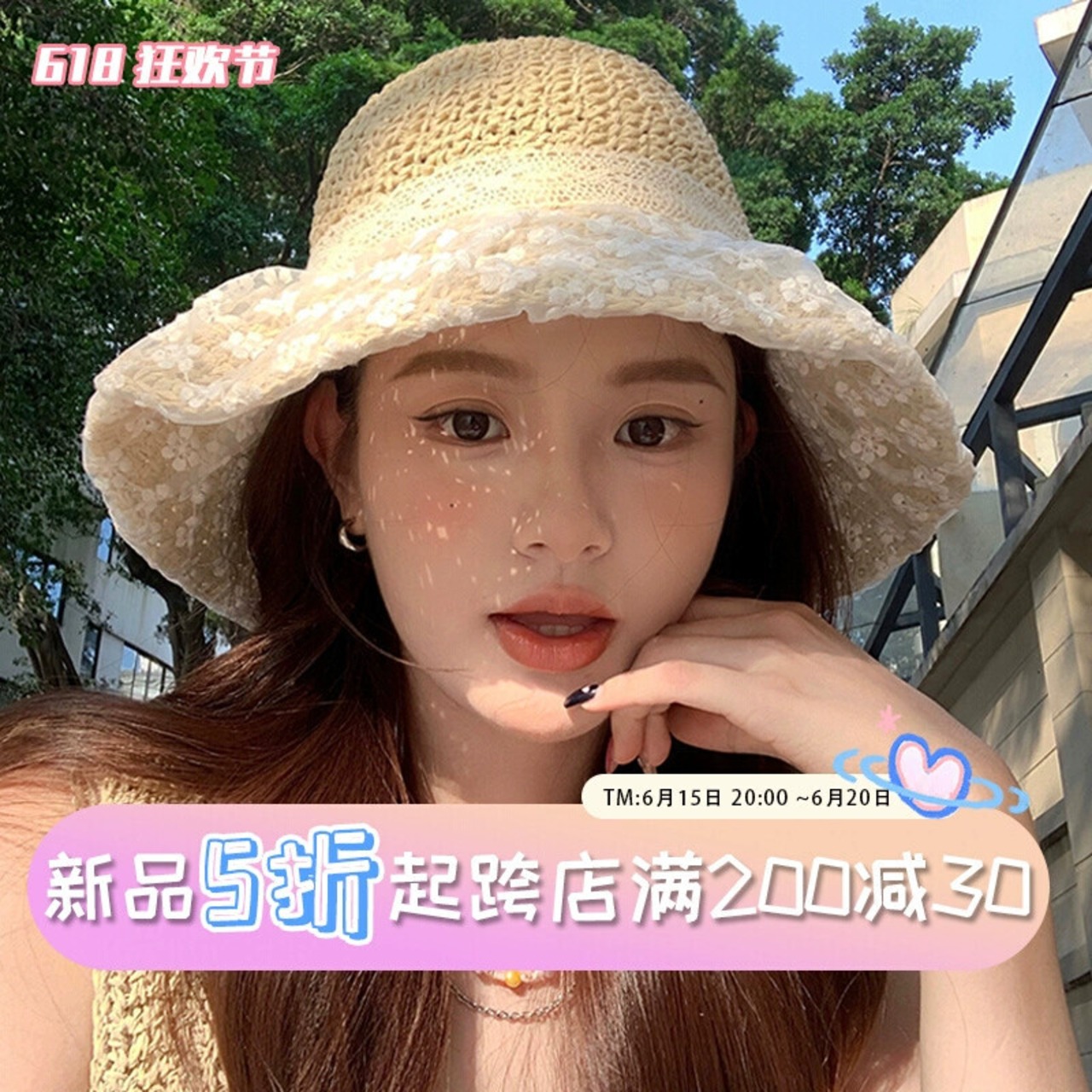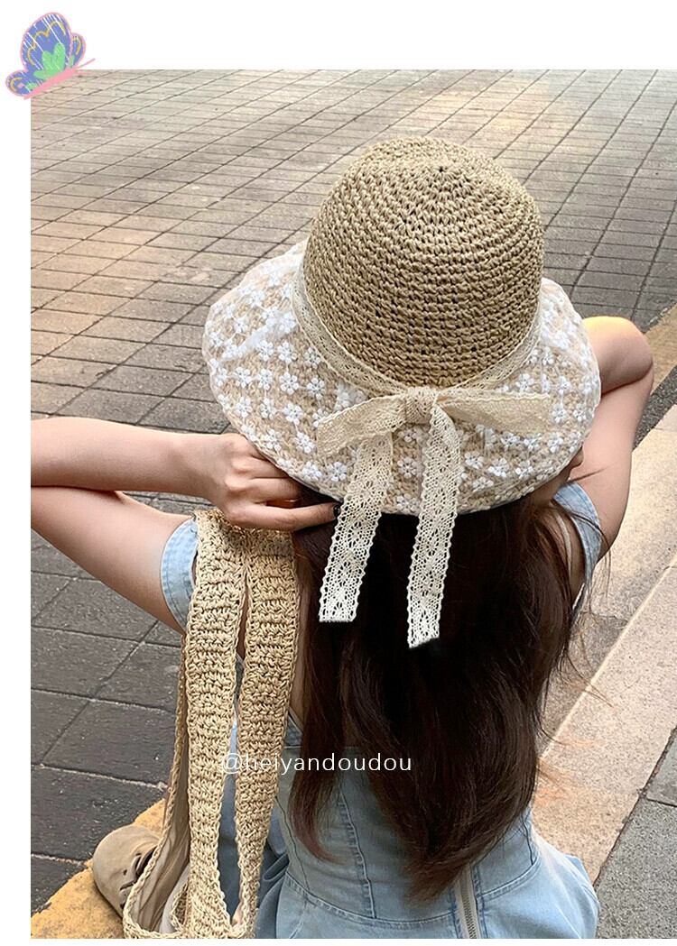 麦わら帽子の女性の新しい ese スタイルの小さな新鮮なレースの麦わら帽子夏のお出かけ日焼け防止帽子大きなつばビーチサンバイザー帽子 サマー 夏物 15dd70535303183