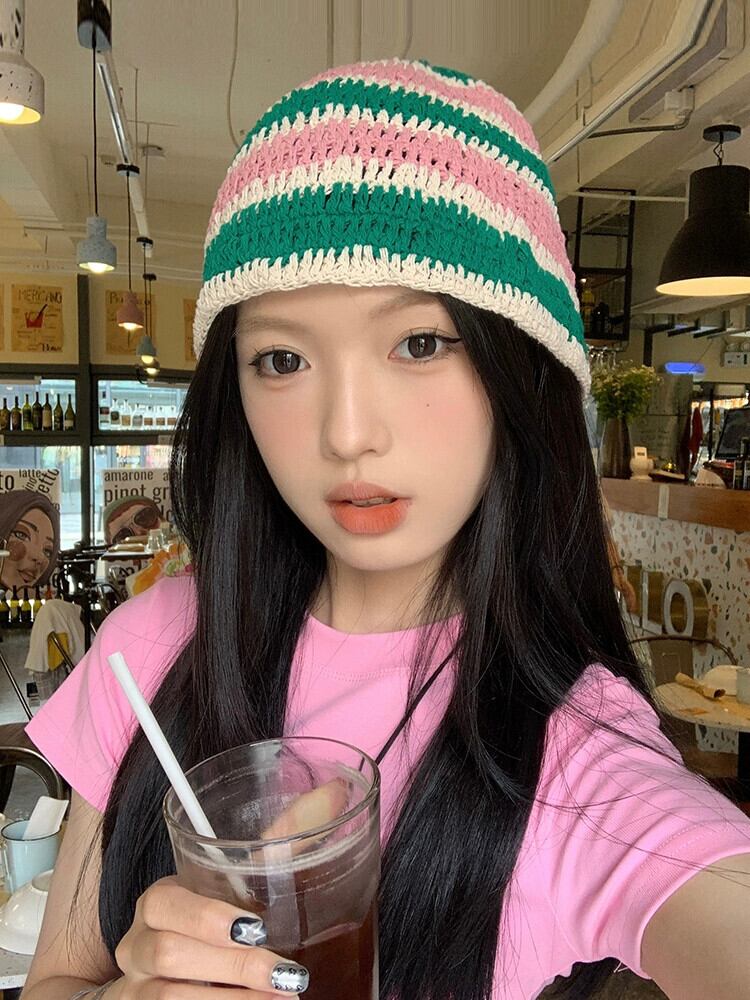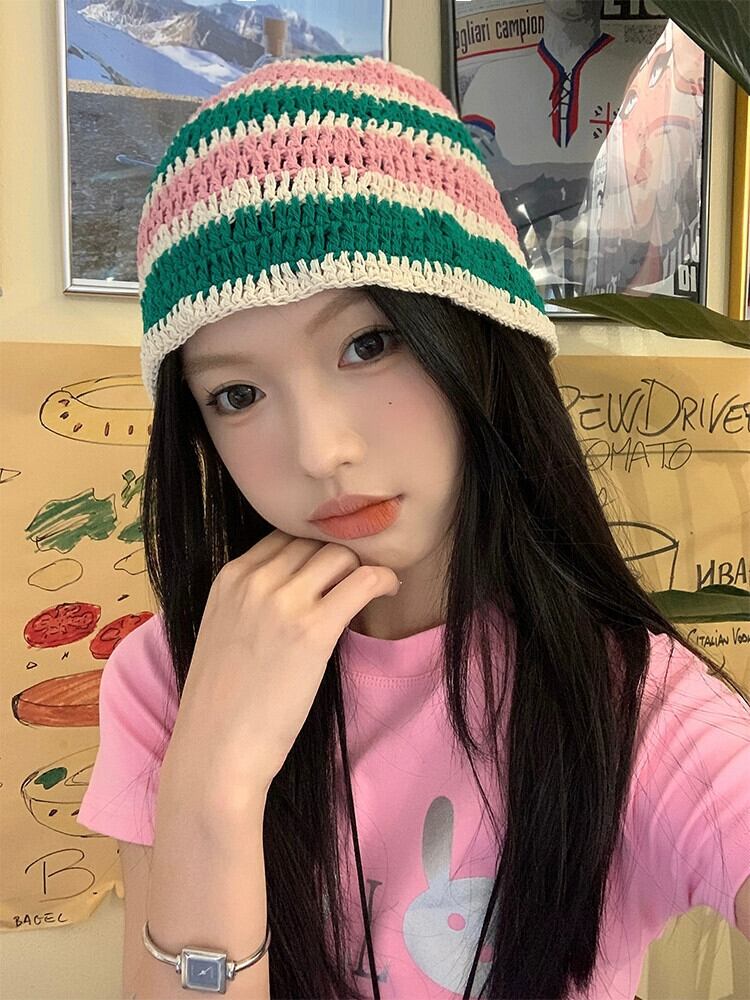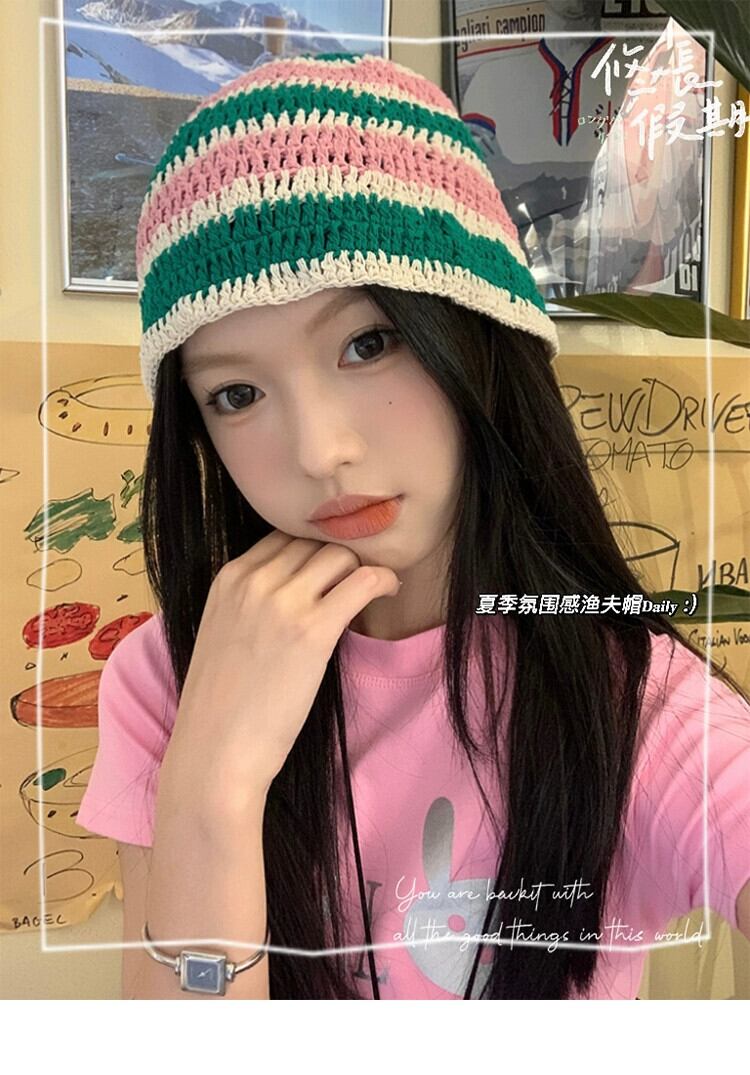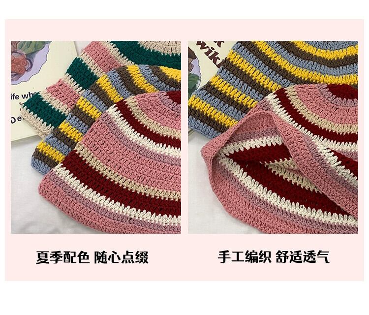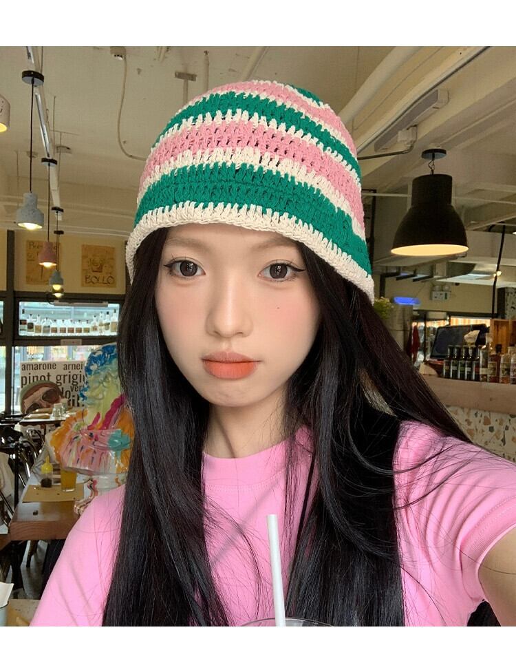 ニッチヒットカラーストライプ漁師帽子女性の夏中空通気性顔小さいバージョン甘い顔小さな日よけ帽子 大人ガーリー スウィート キュート カジュアル サマー 夏物 15dd95334421085