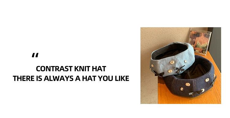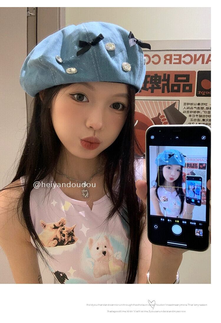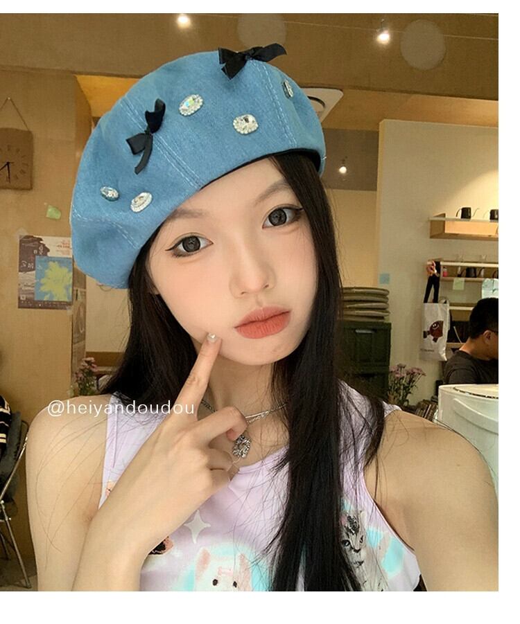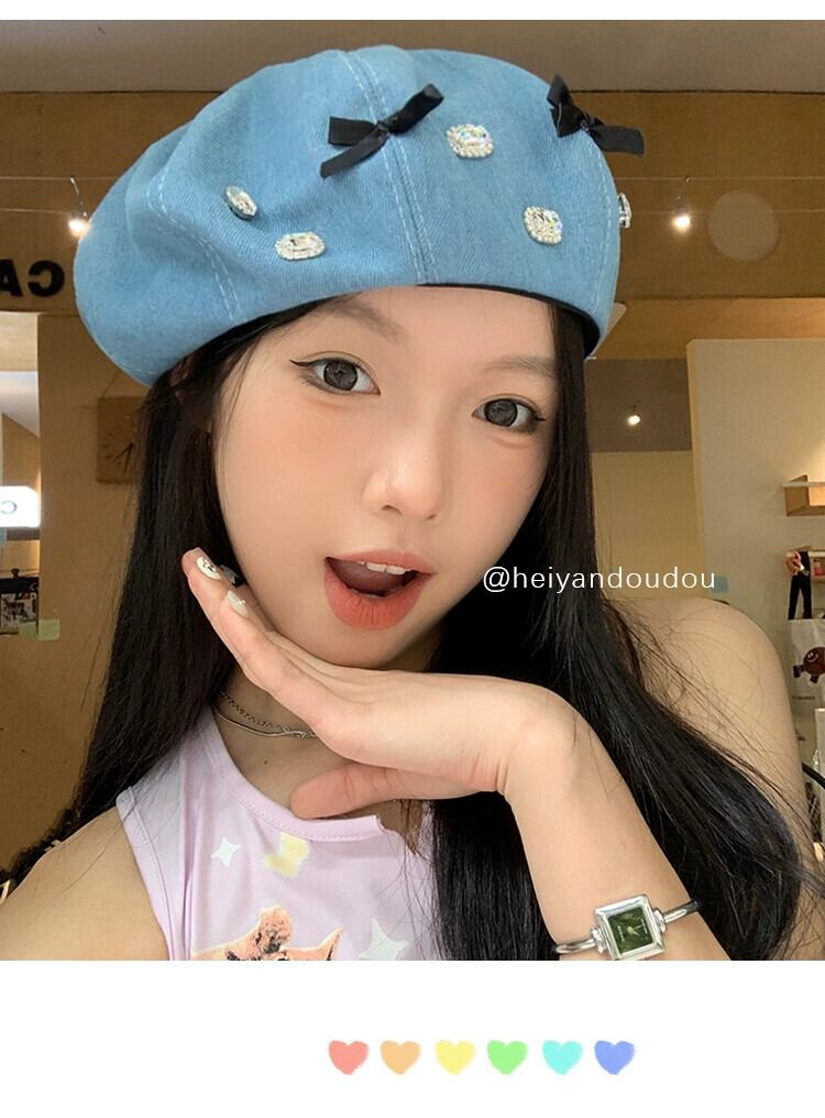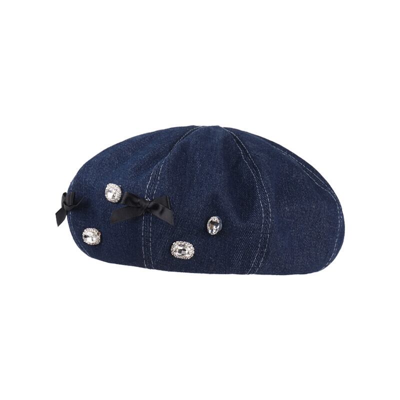ちょう結びラインストーンデニムベレー帽女性 2023 新ファッションオールマッチベレー帽画家帽子大きな頭囲帽子潮 ベレット ヘアアクセサリー 15dd54342650584