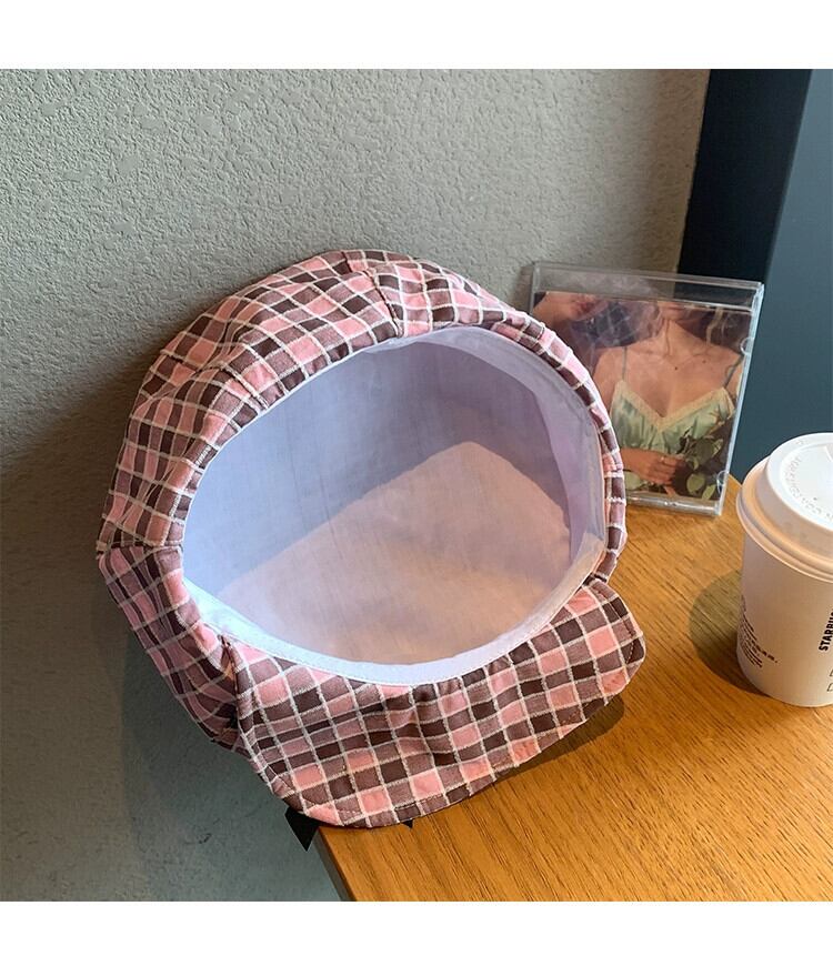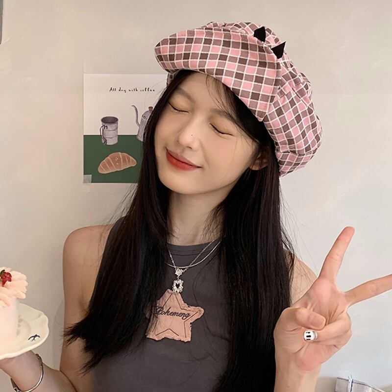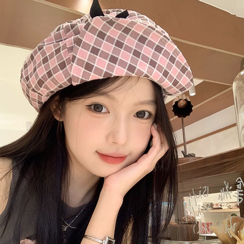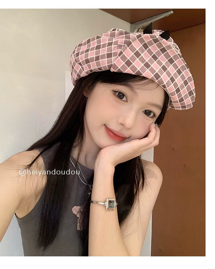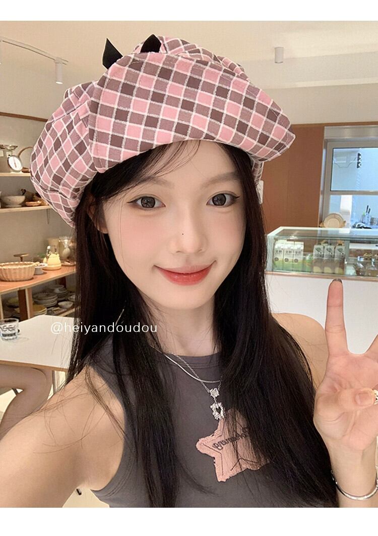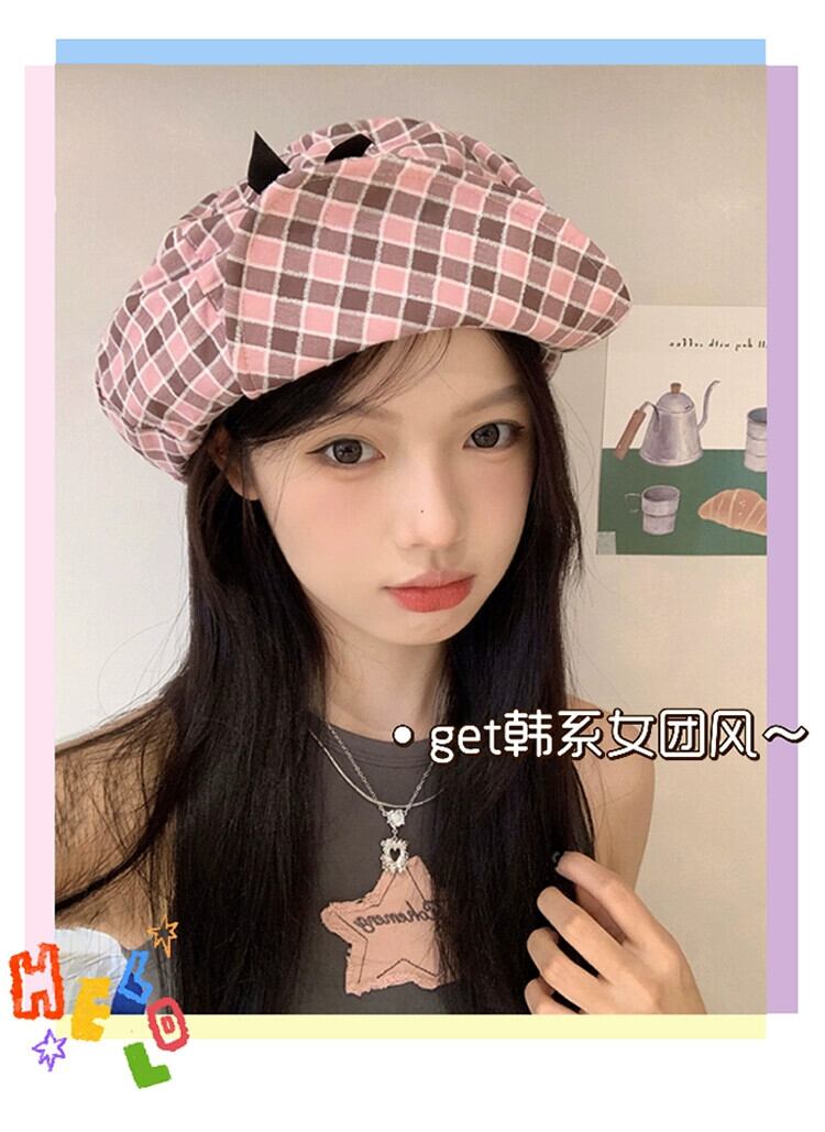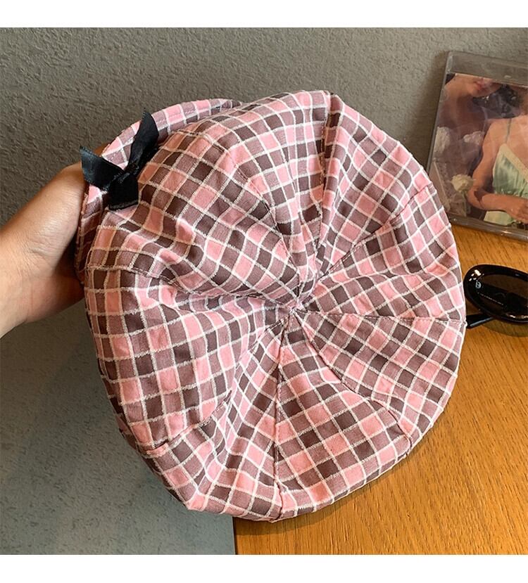 ニッチデザインオリジナルかわいいちょう結びクラウドハットピンクチェック柄大きな頭囲アーティストハット小顔見せ リボン 帽子 大人ガーリー スウィート キュート カジュアル 15dd67038938754