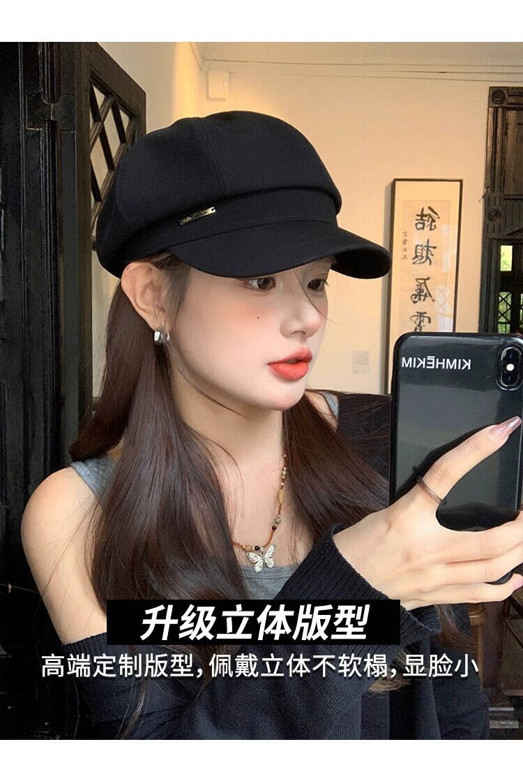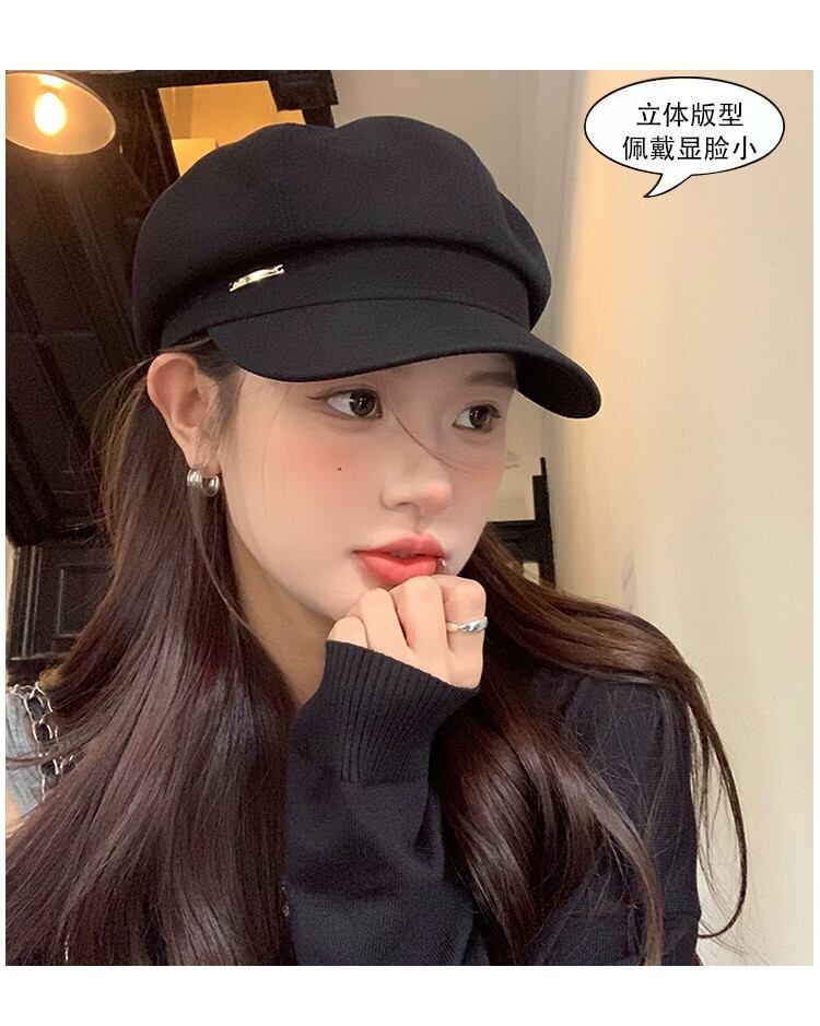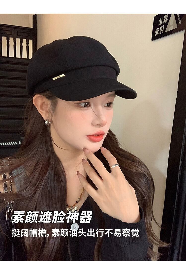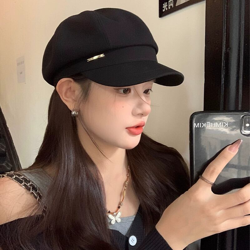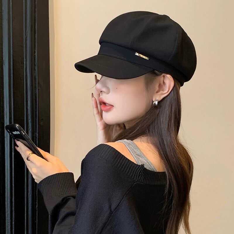 秋冬スタイルのレトロな黒ベレー帽の女性ファッショナブルな大きな頭囲顔小さなキャスケット帽子インターネット有名人八角形画家の帽子 ブラック オータム 秋物 ウィンター 冬物 ベレット ヘアアクセサリー 15dd46078906415