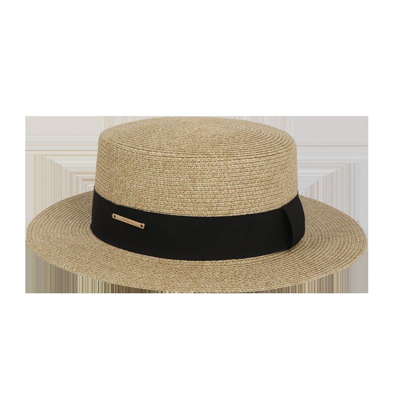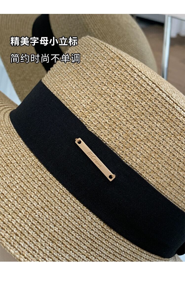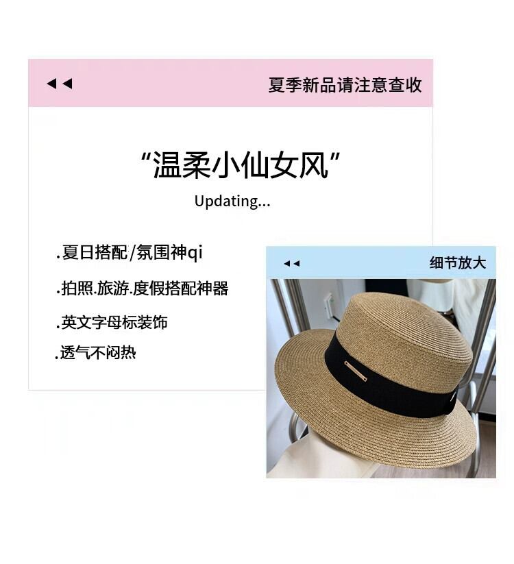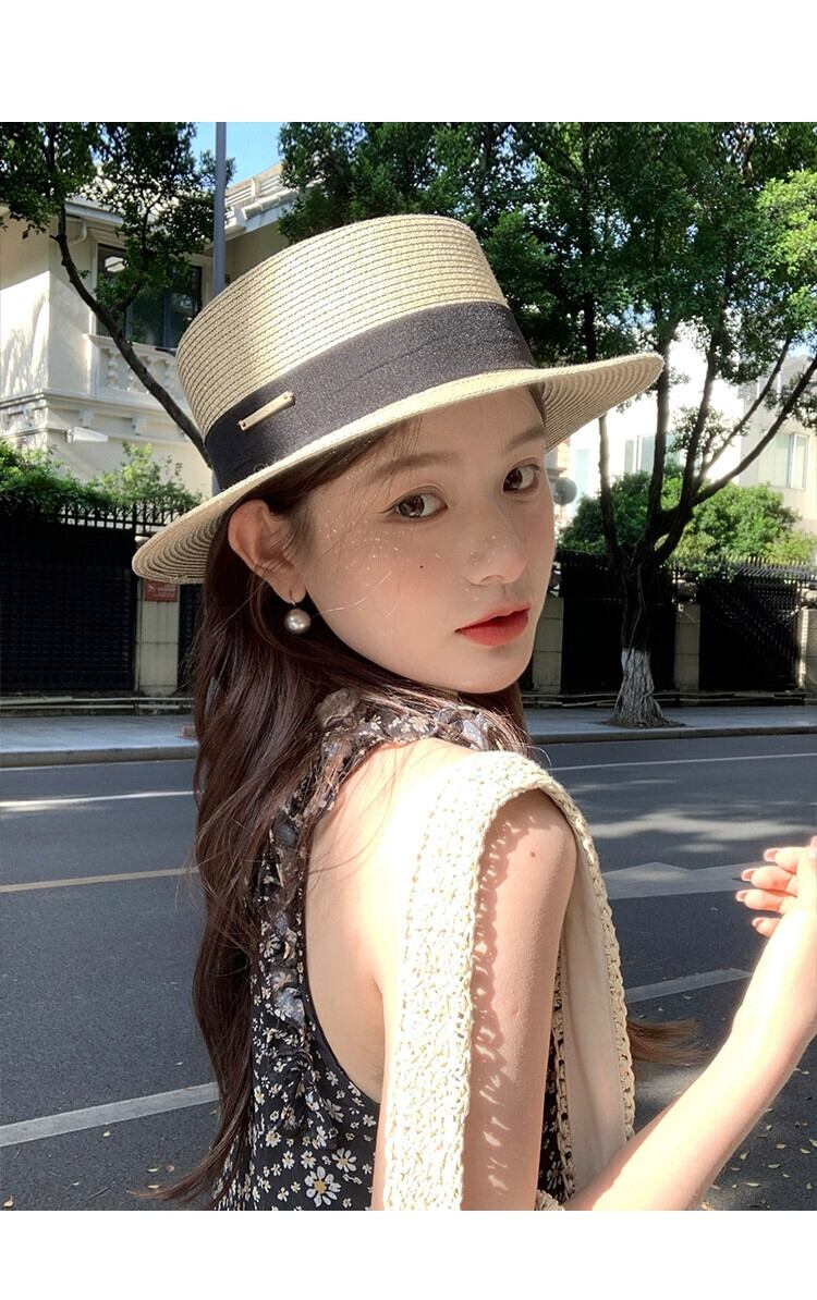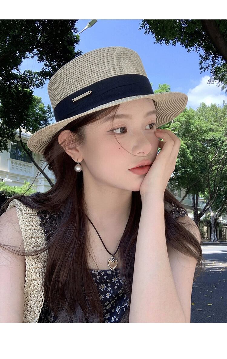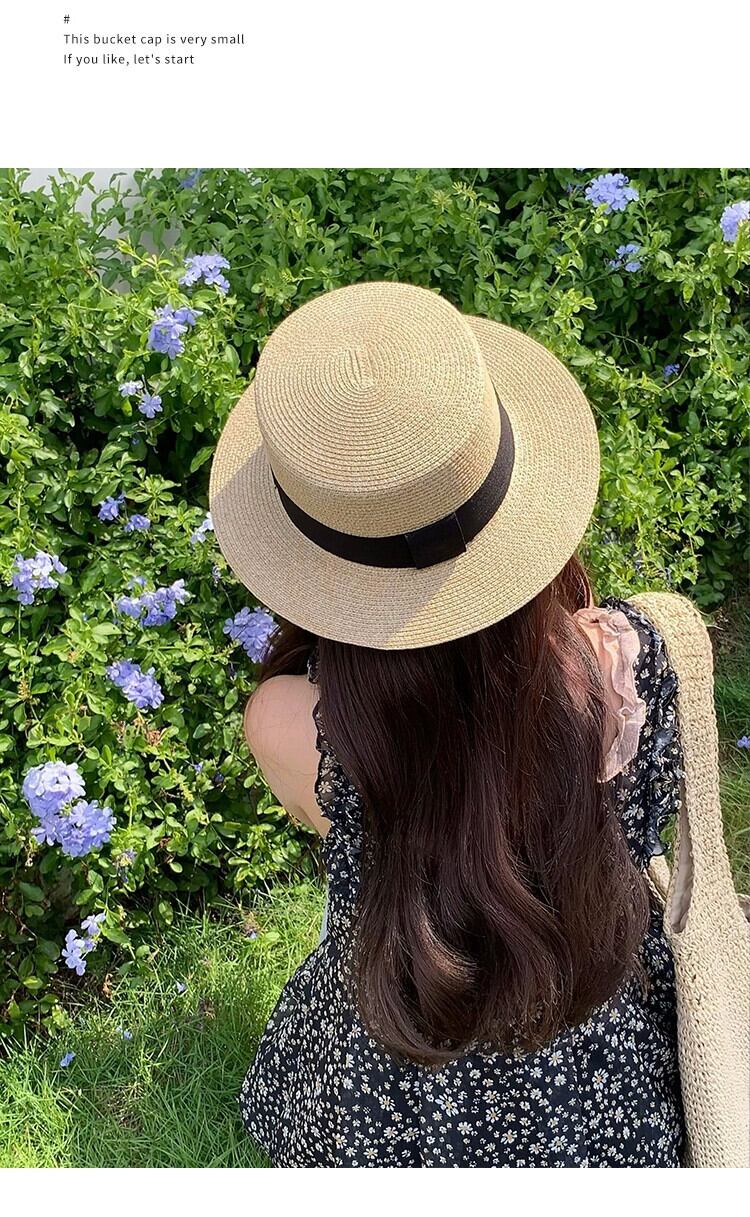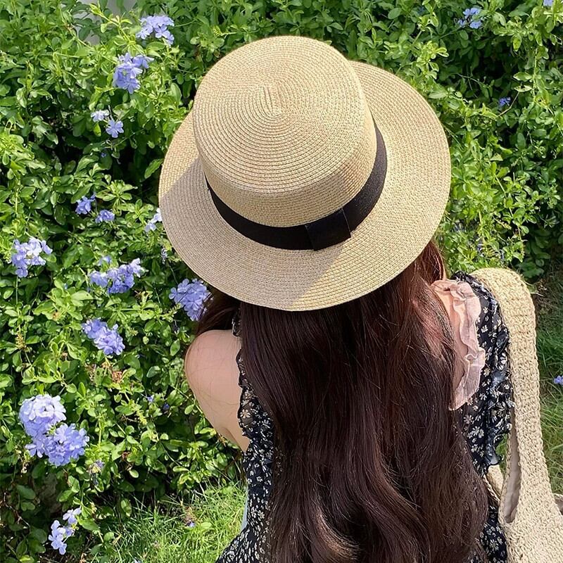 夏にビーチに旅行してポーズをとるときのフラットトップの麦わら帽子の女性、日焼け止め麦わら帽子、フレンチビーチハット、サンハット サマー 夏物 15dd84882275171