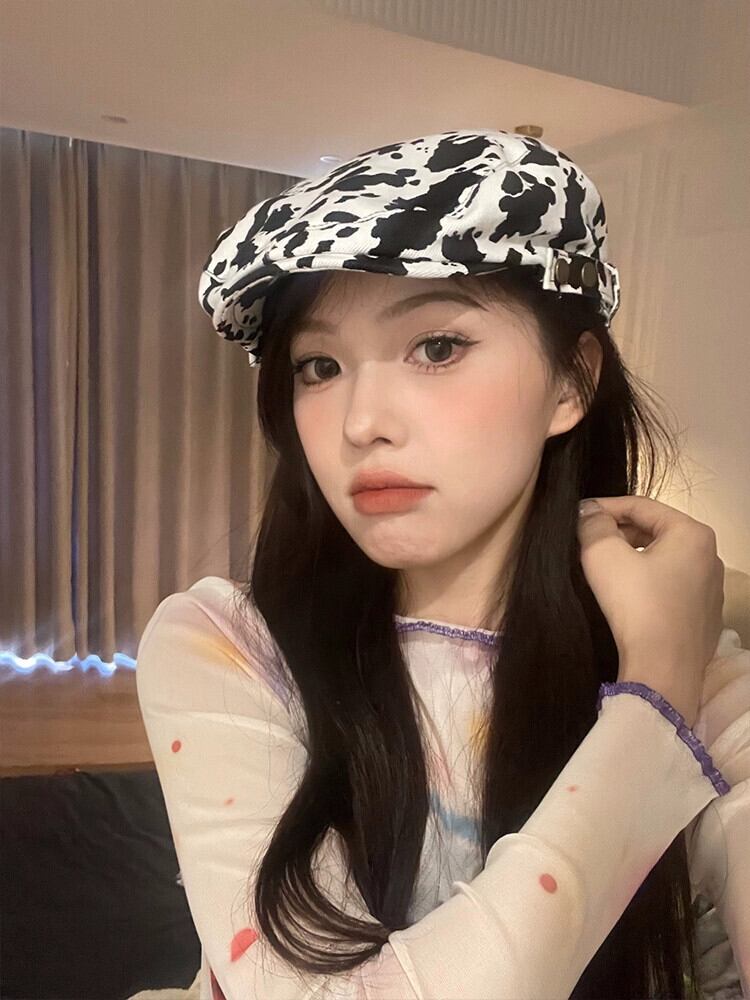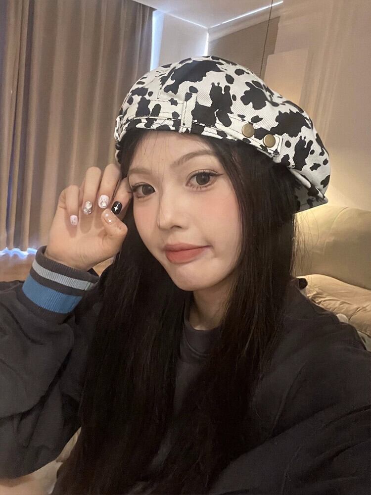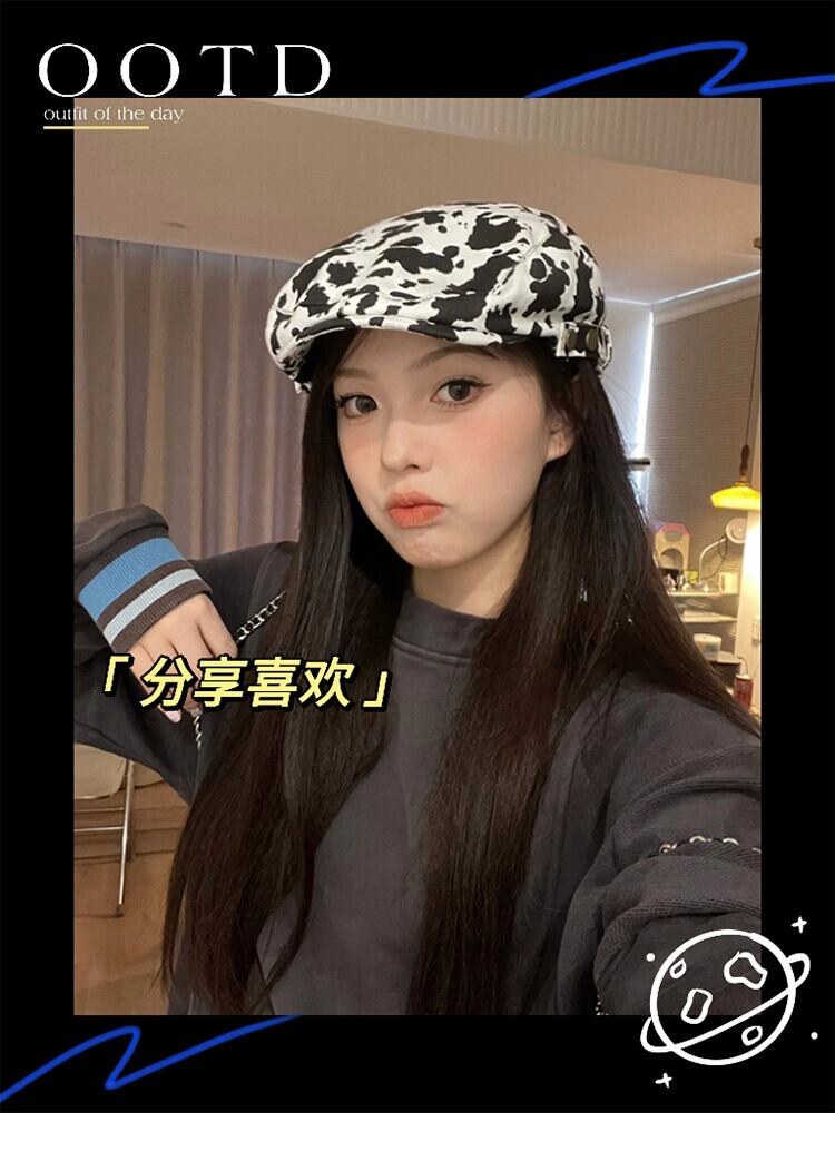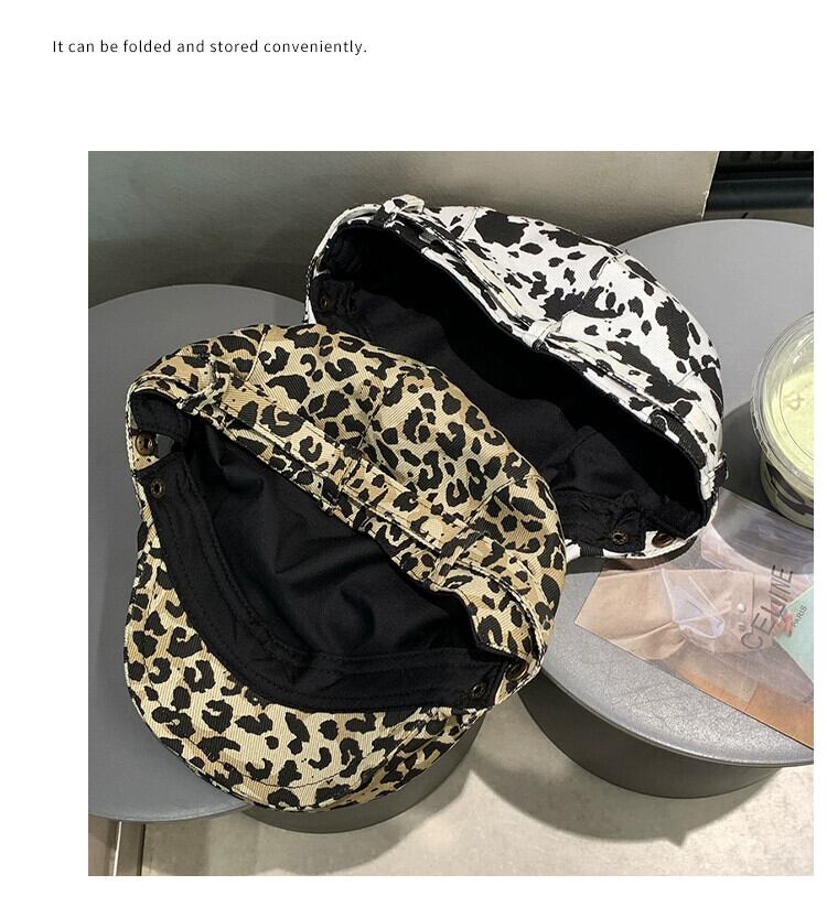 レトロペインターハットレディース、万能ミルクプリントヒョウ柄ベレー帽、文学的ピークキャップ、ブリティッシュカジュアルプログレッシブハットトレンド 帽子 ベレット ヘアアクセサリー 15dd90566610512