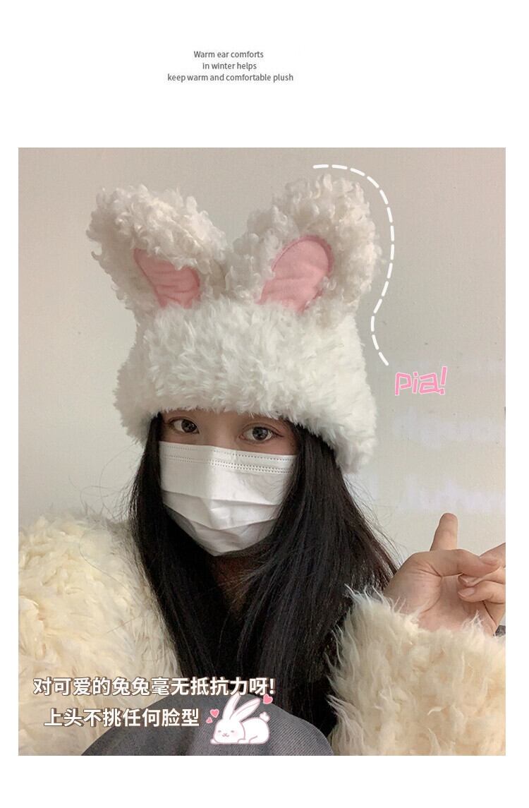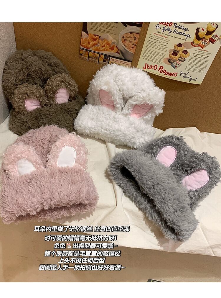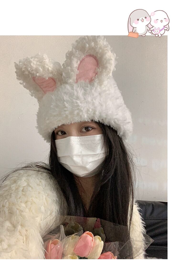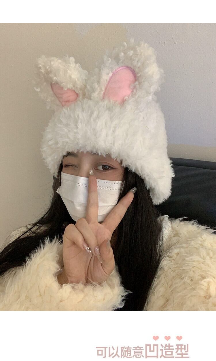 甘くてかわいいぬいぐるみウサギの耳帽子女性の秋と冬の厚く暖かいウールの帽子トレンディな包頭インニット防寒帽子 大人ガーリー スウィート キュート カジュアル オータム 秋物 ウィンター 冬物 15dd78990597499