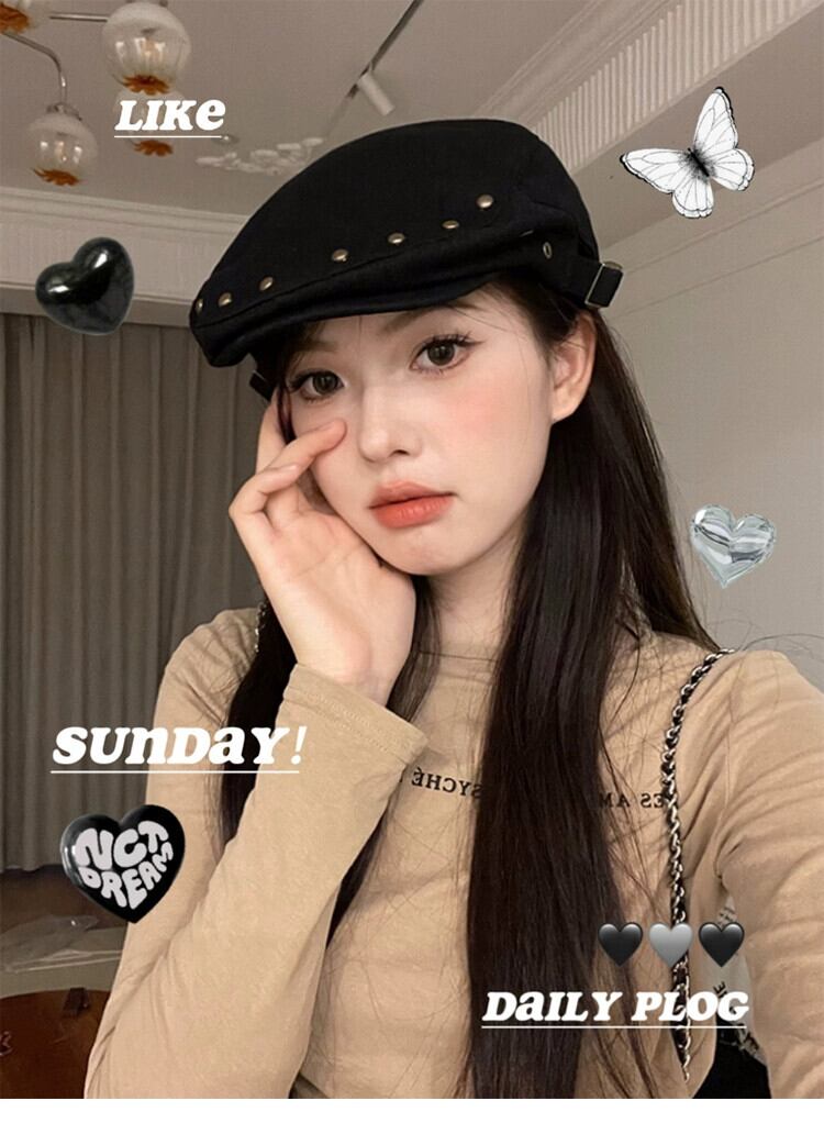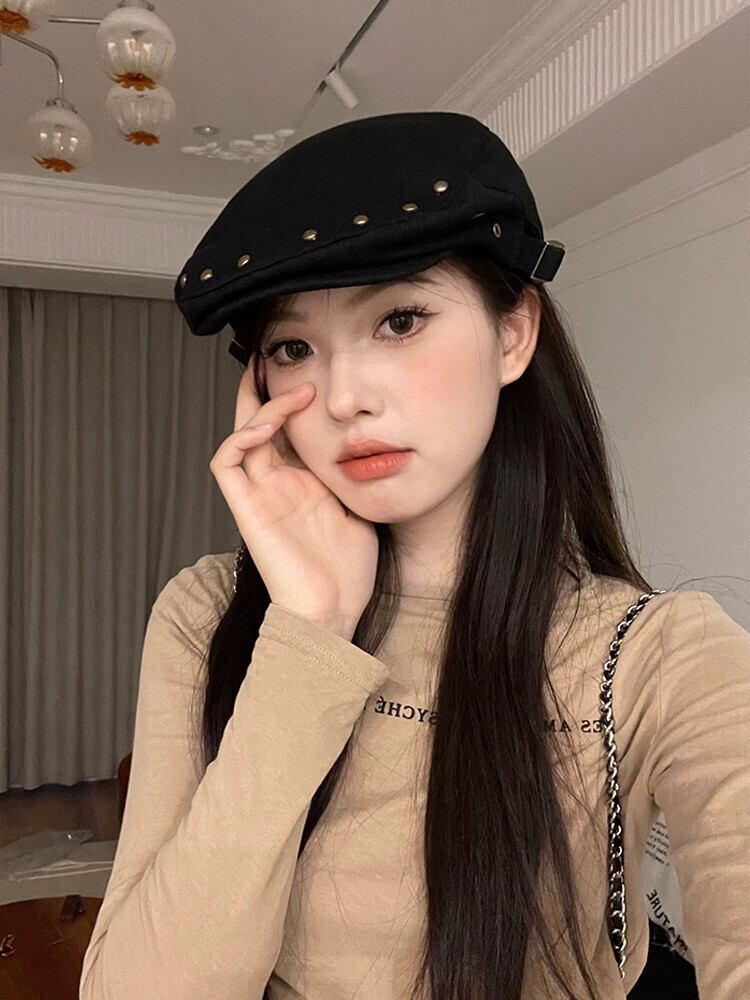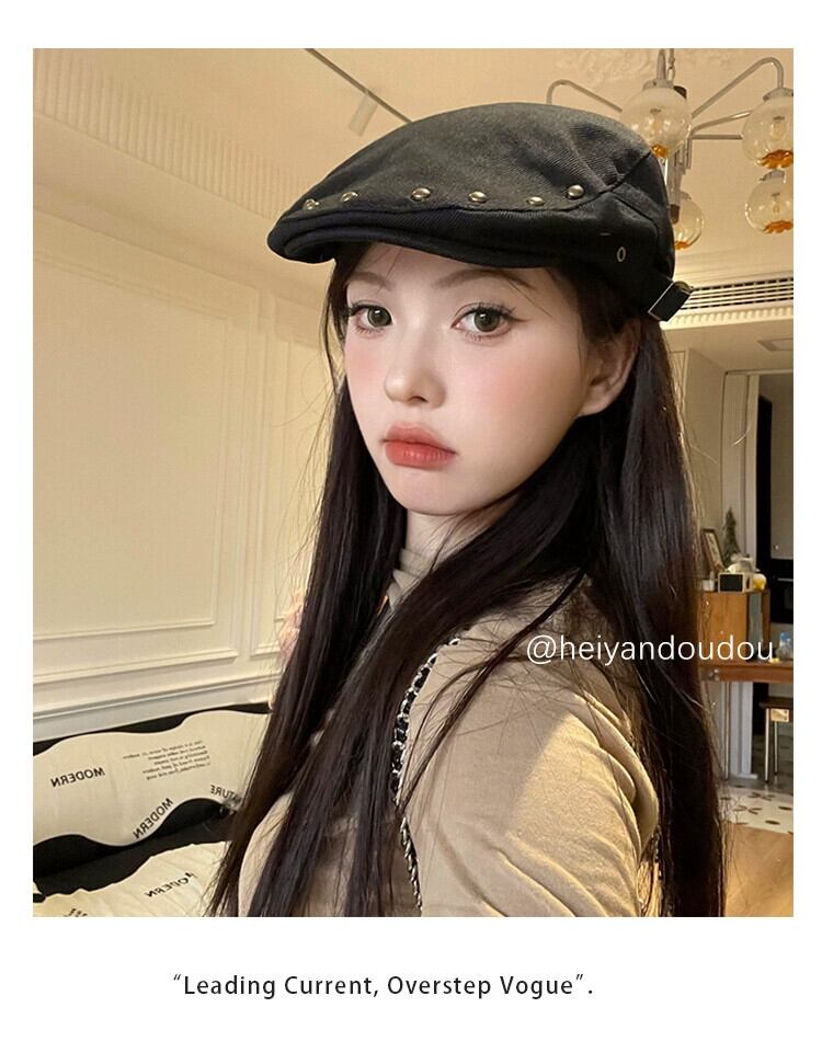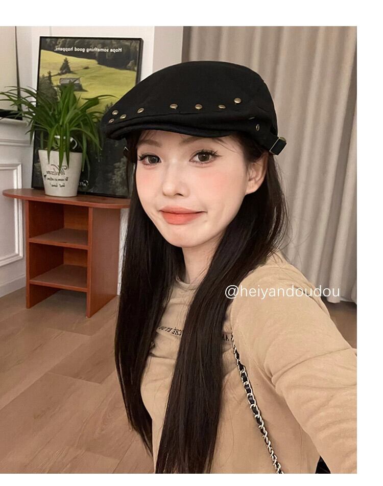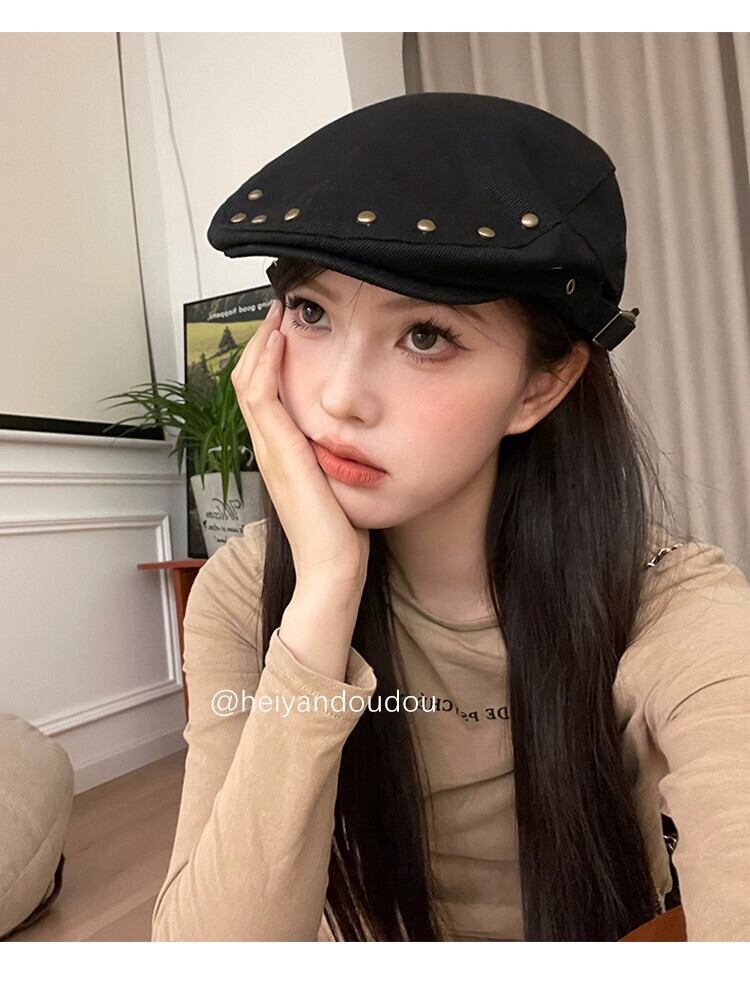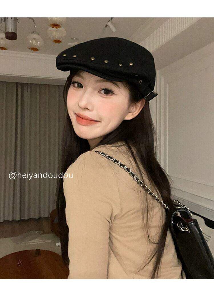 英国スタイルのレトロなキャスケットキャップレディース、リベット付き、カジュアルで多用途、エセスタイル、シンプル、トレンディ、ブラックワードキャップ、ピークキャップレディース 15dd93731148505