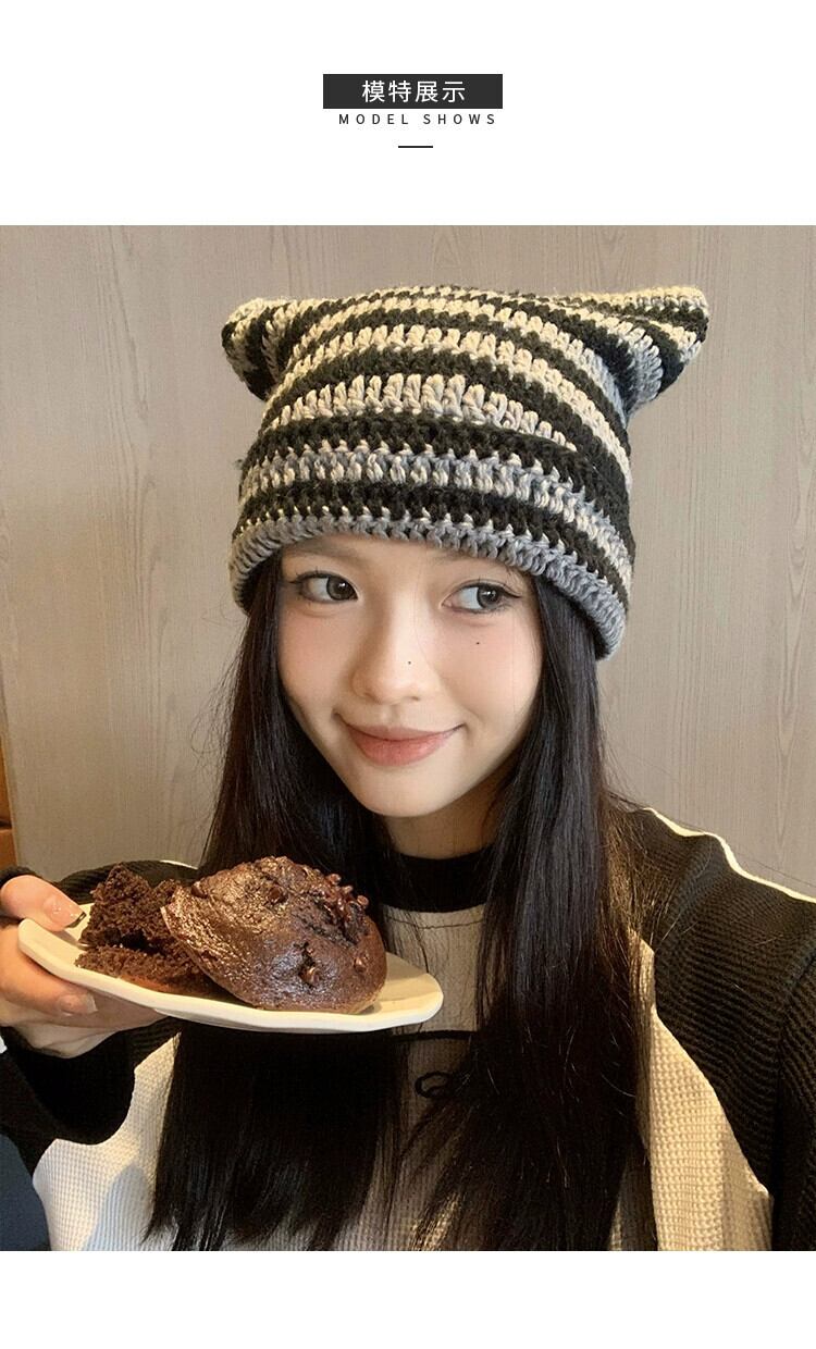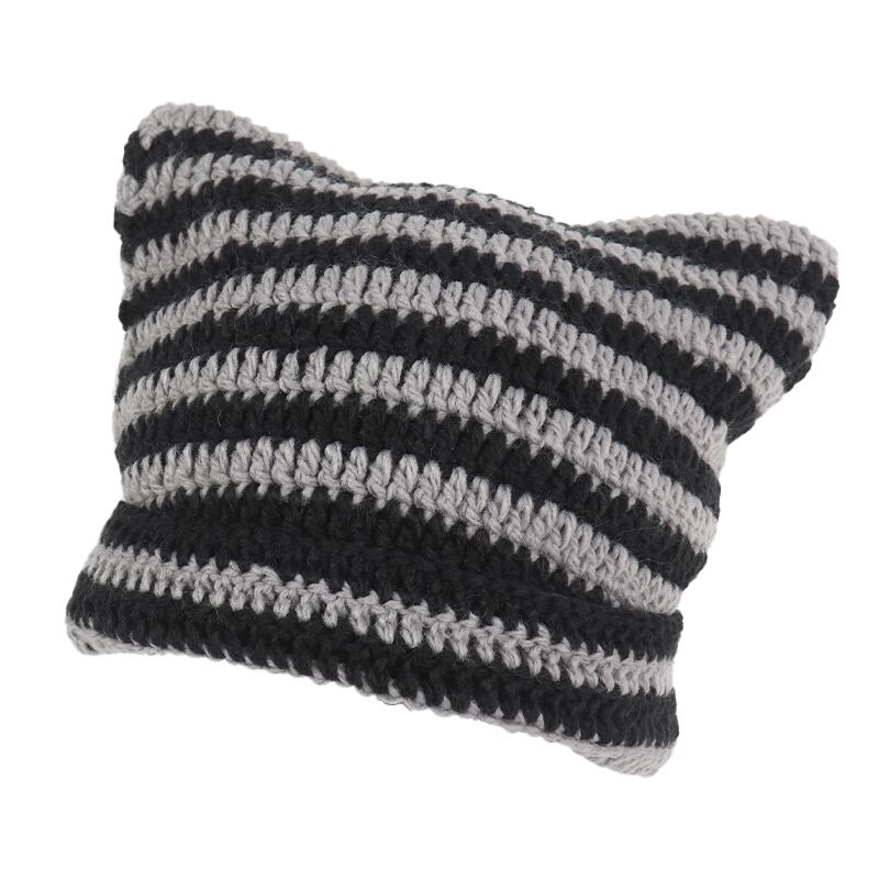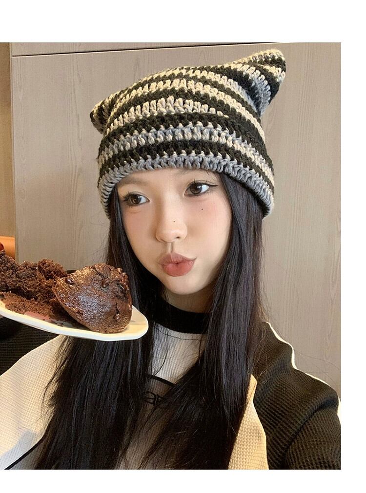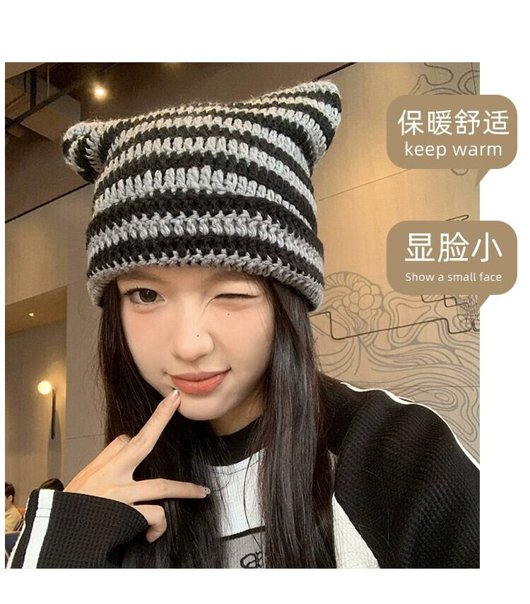 秋冬新作インストライプニット帽レディース、甘くてかっこいい猫耳、かわいいとんがり帽子、耳保護プルオーバーハット、トレンド 大人ガーリー スウィート キュート カジュアル オータム 秋物 ウィンター 冬物 15dd55542798299