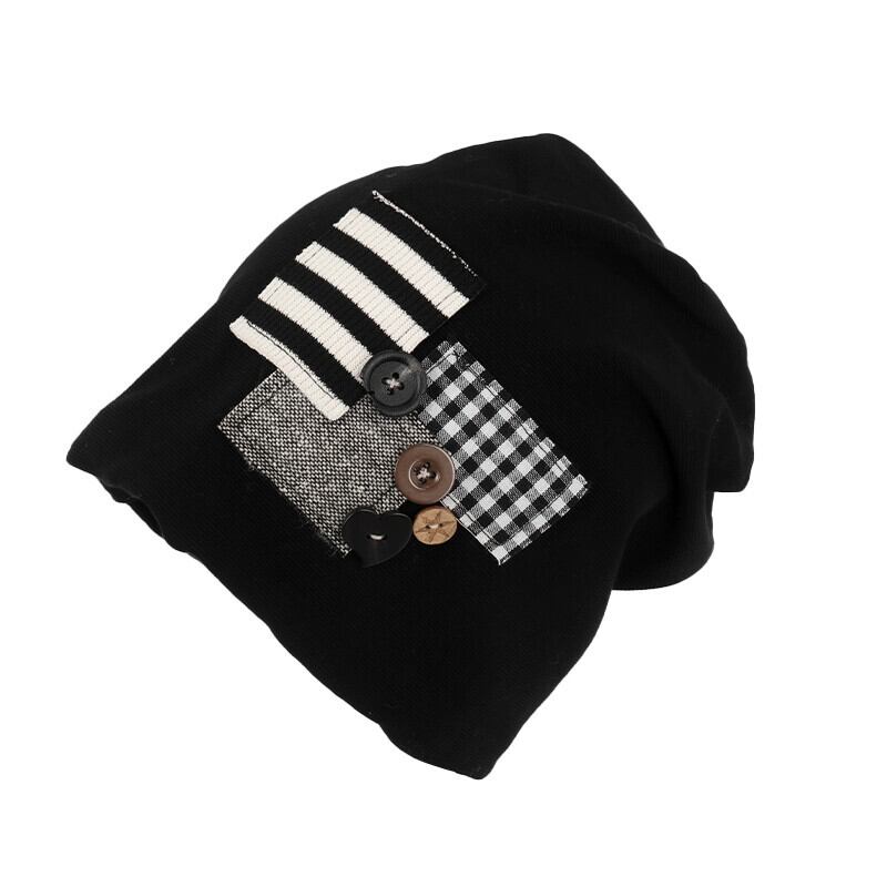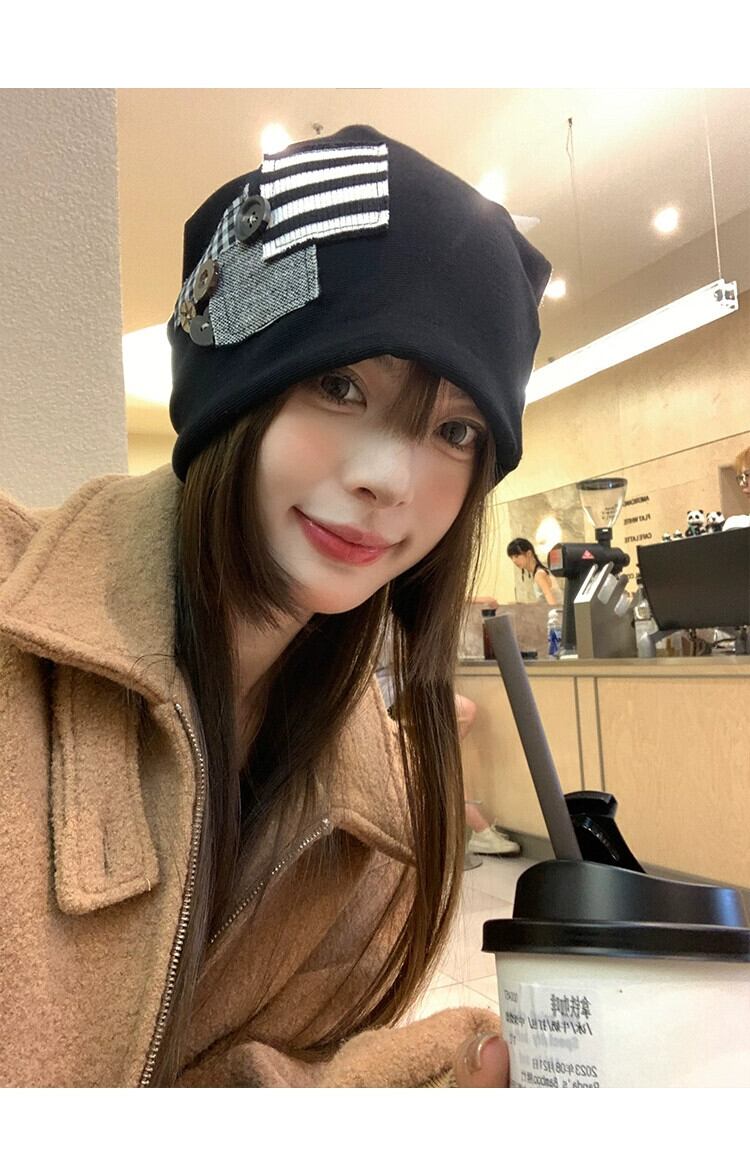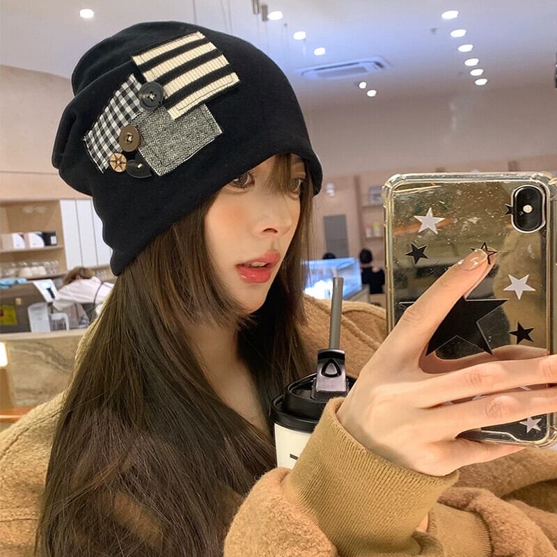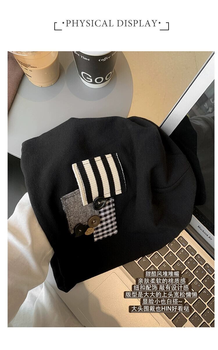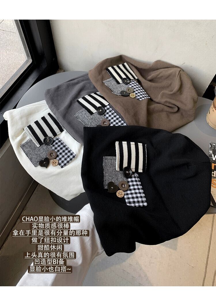 ese 黒パイル帽子女性の秋と冬の防寒帽子ストライプパッチフード付きプルオーバー帽子顔見せ小さな大きな頭囲帽子 ブラック オータム 秋物 ウィンター 冬物 15dd48069350791