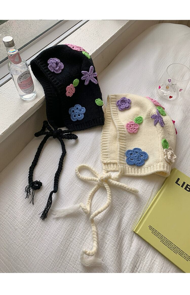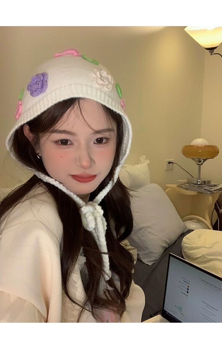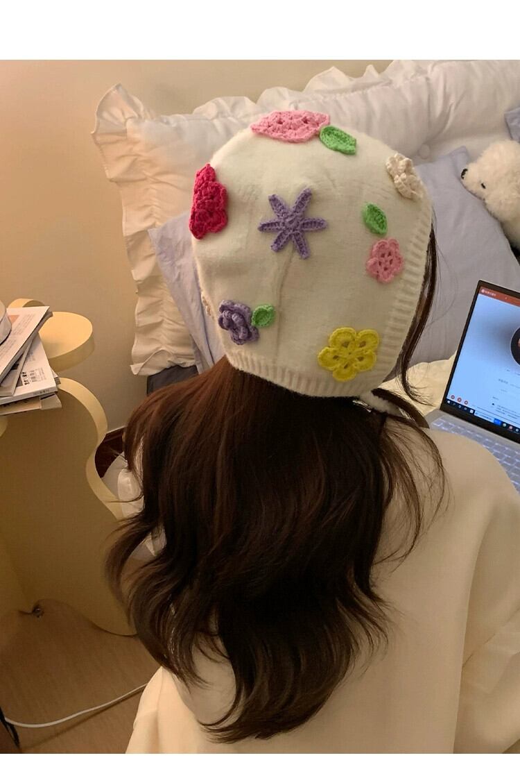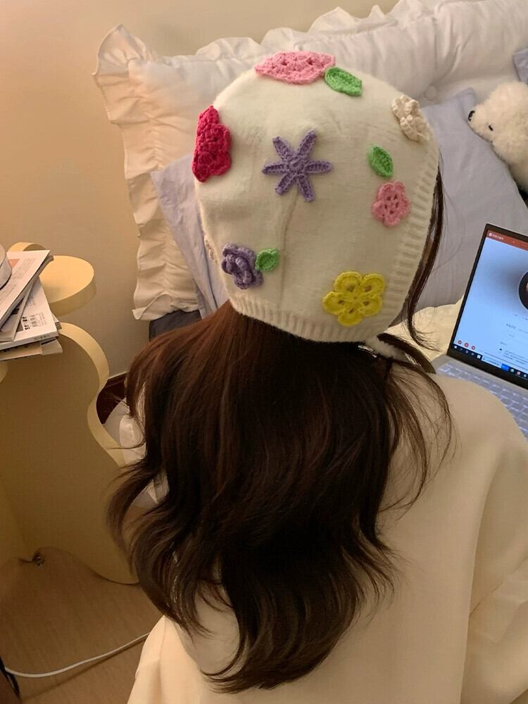 甘くてかわいい手作りフラワービーニーニッチデザイン包頭ニット帽子耳保護スカーフ帽子防寒帽子女性秋と冬 大人ガーリー スウィート キュート カジュアル オータム 秋物 ウィンター 冬物 フラワーデザイン 15dd18250830164